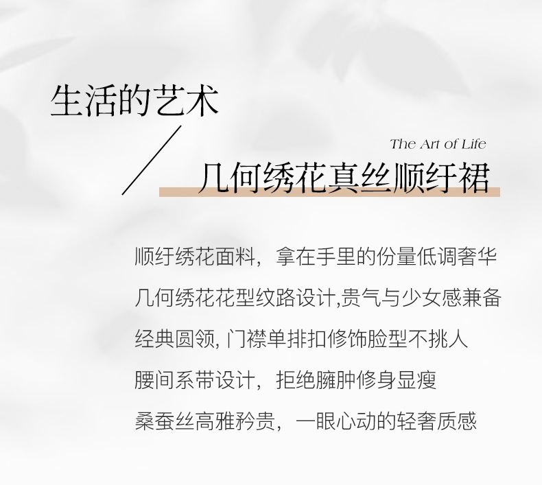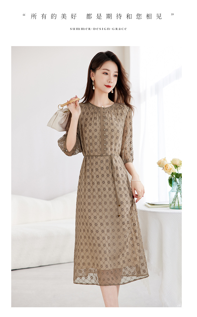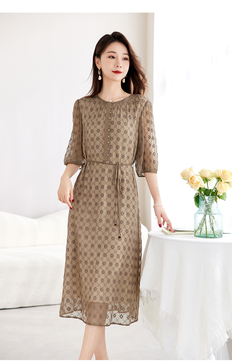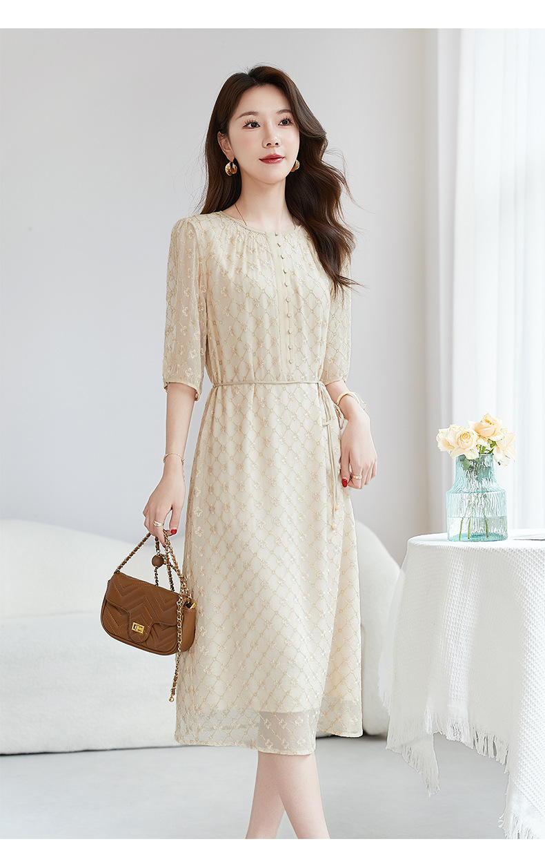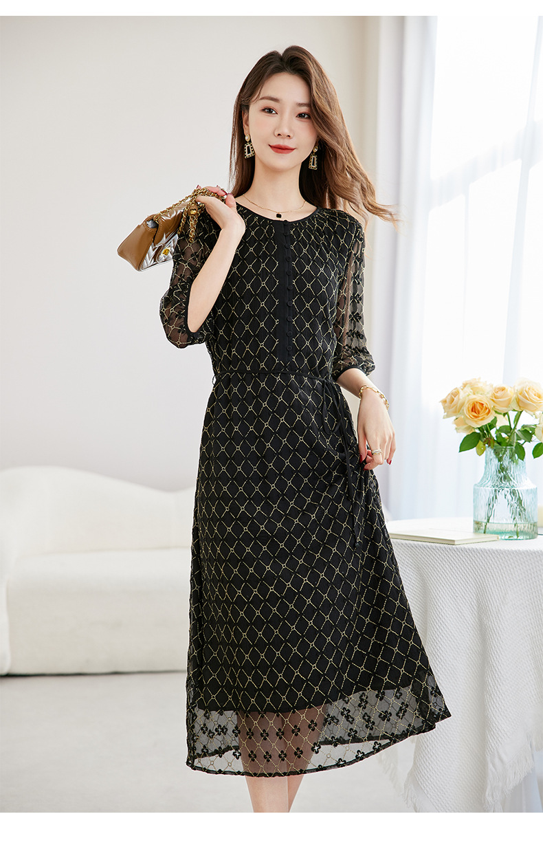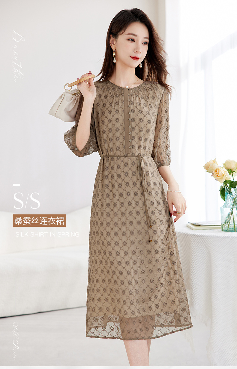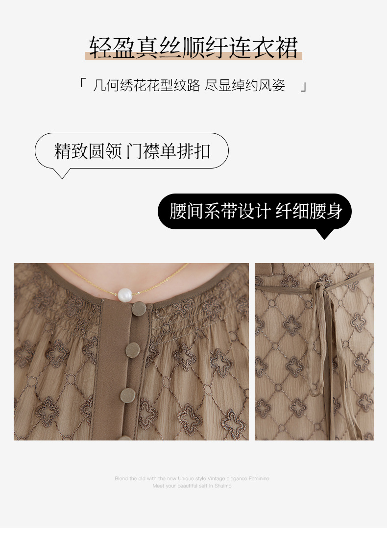丁摩真丝绣花连衣裙收腰圆领减龄桑蚕丝连衣裙女AL9092