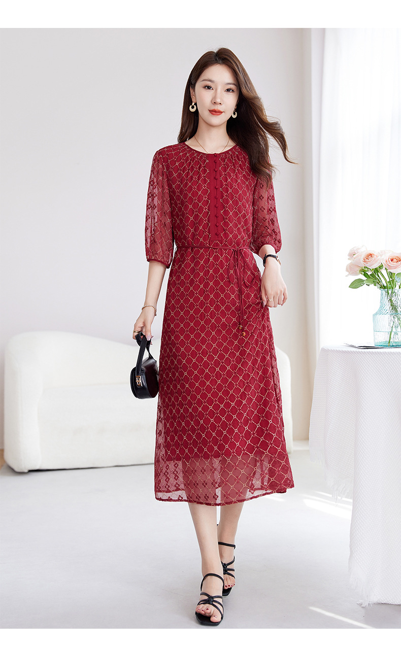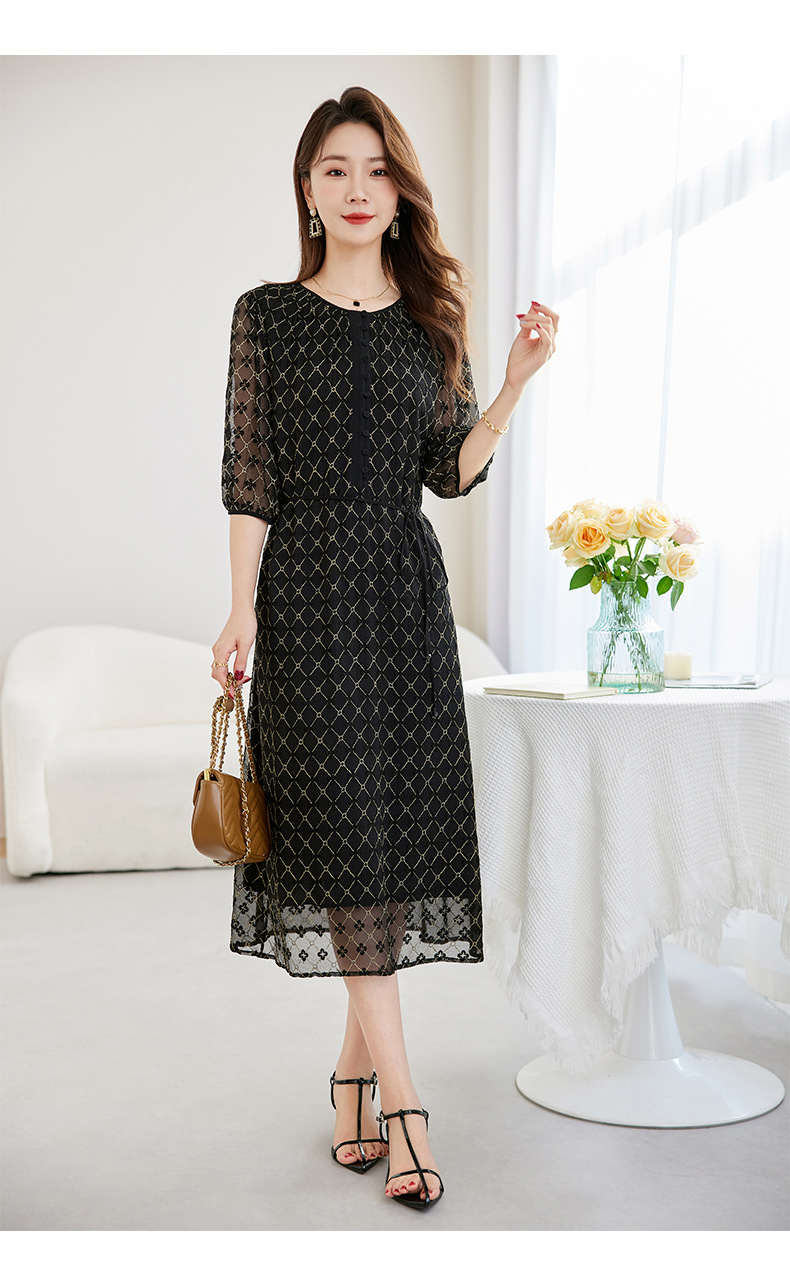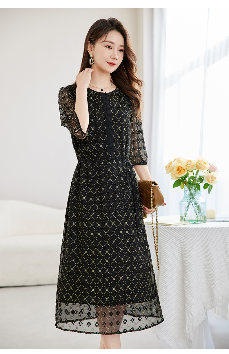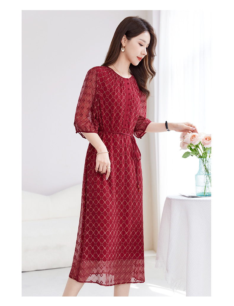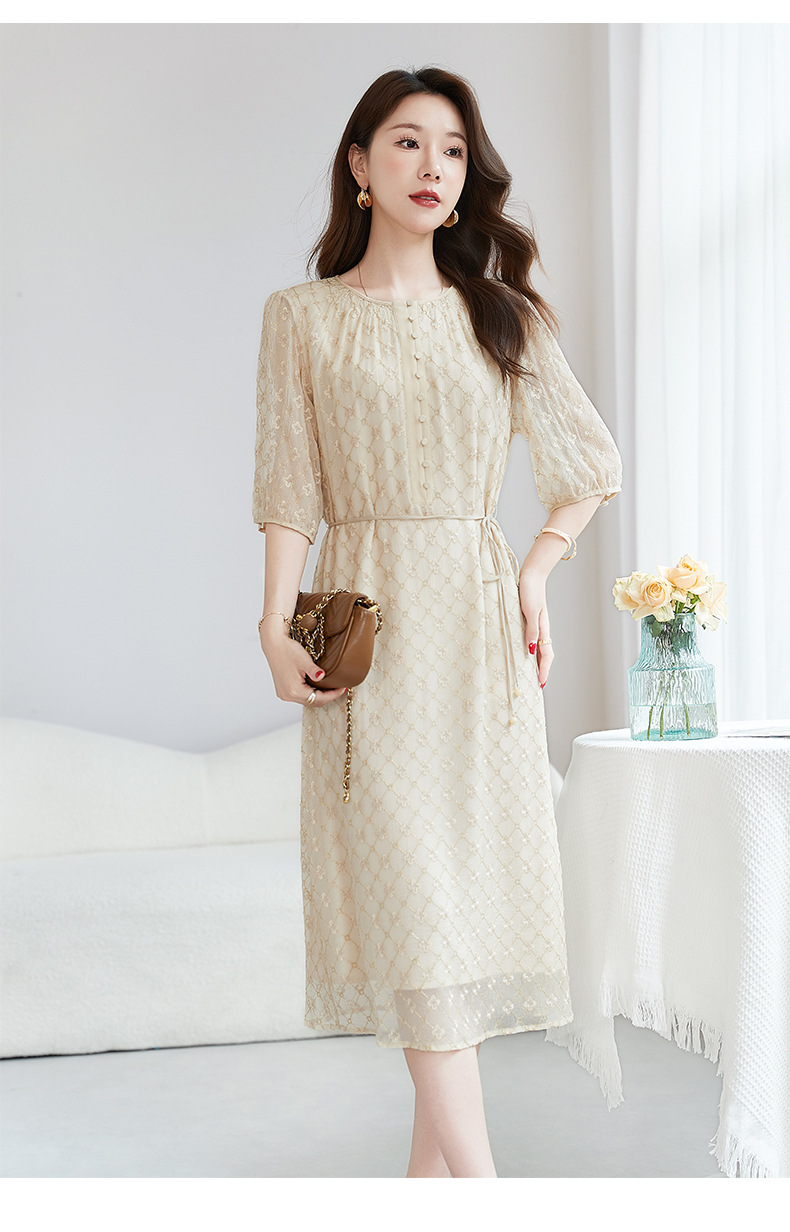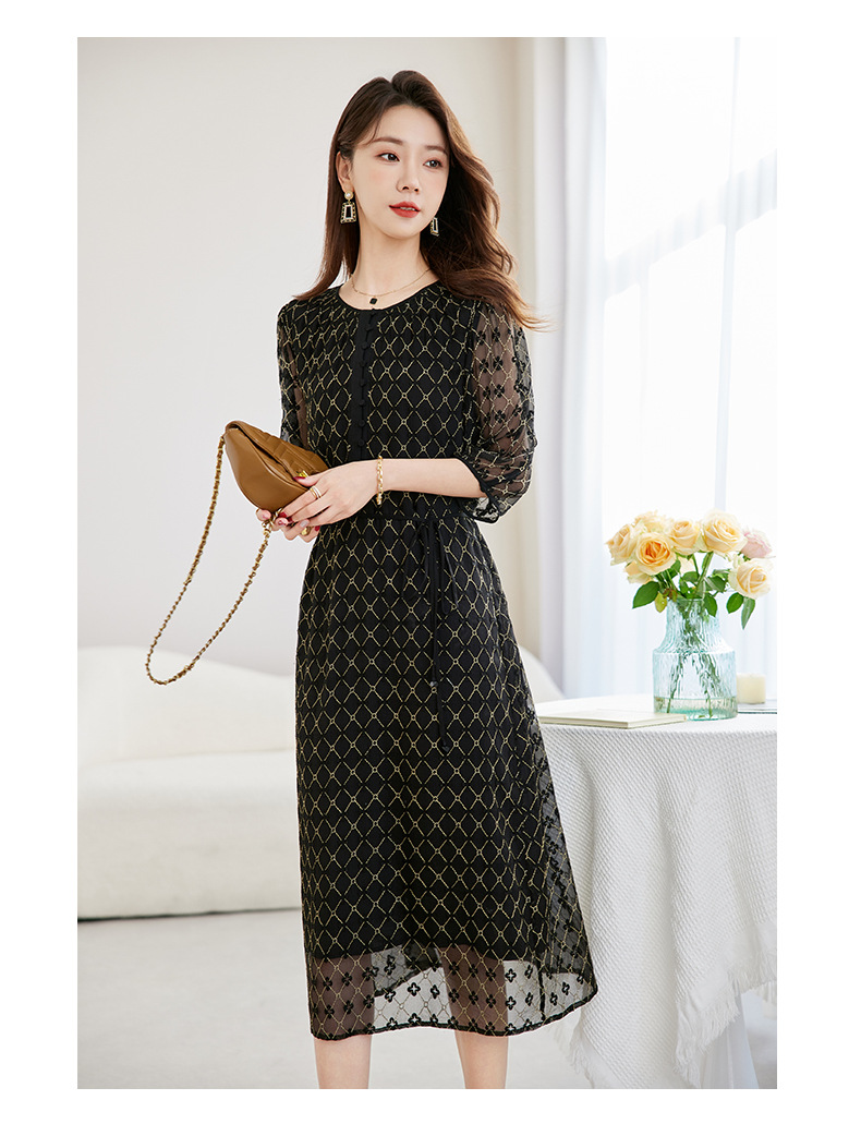 丁摩真丝绣花连衣裙收腰圆领减龄桑蚕丝连衣裙女AL9092