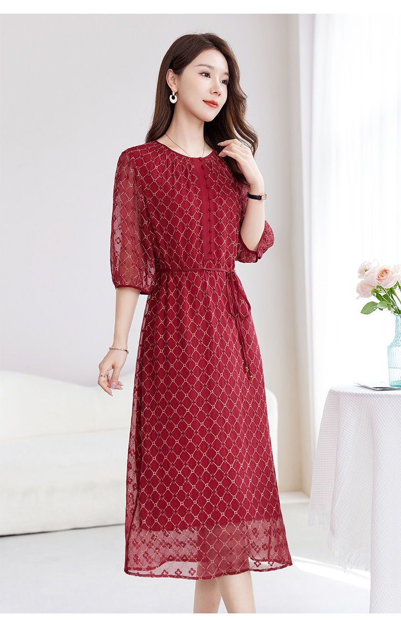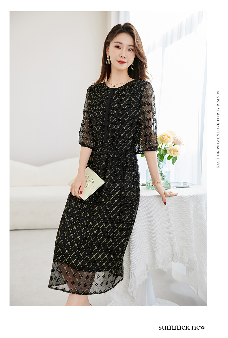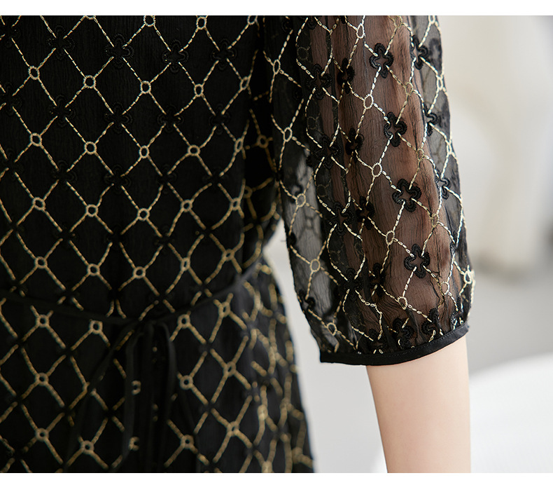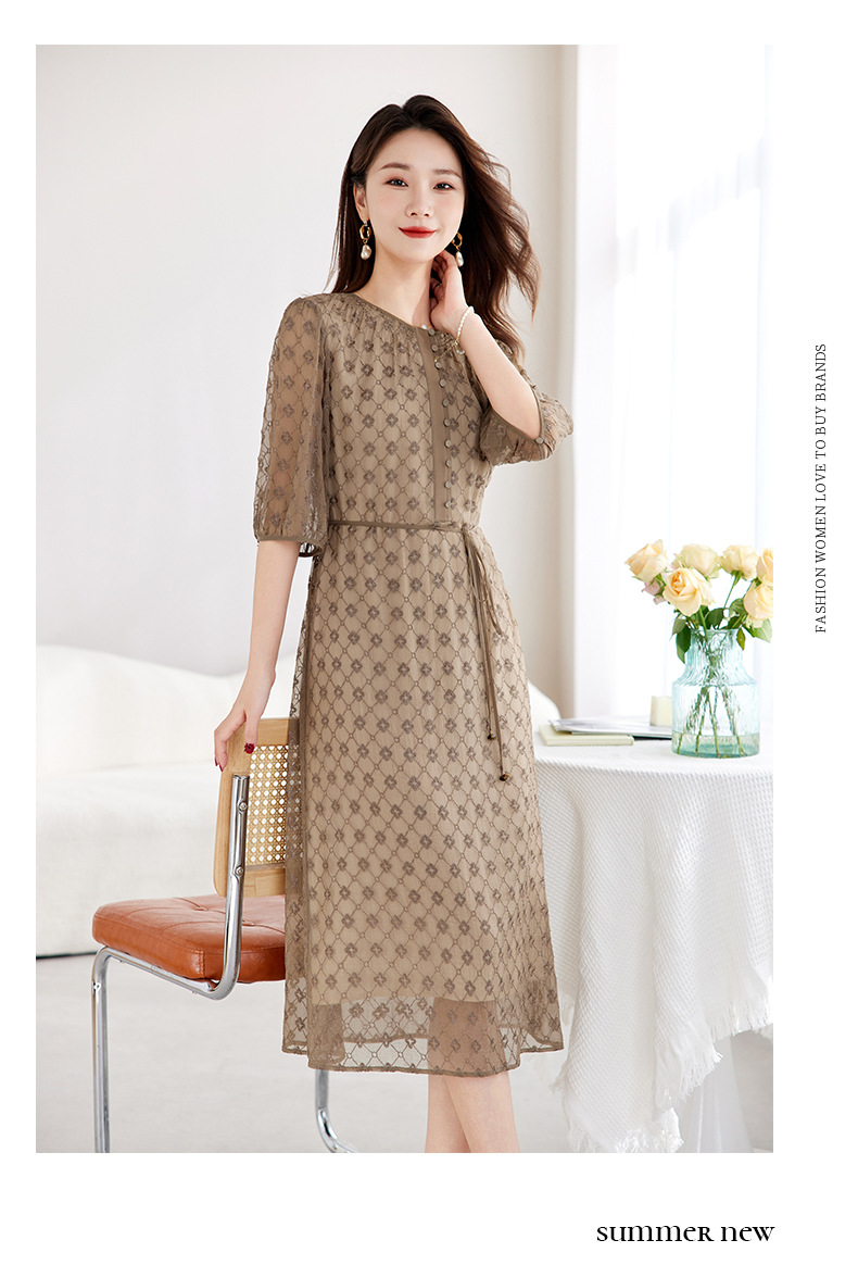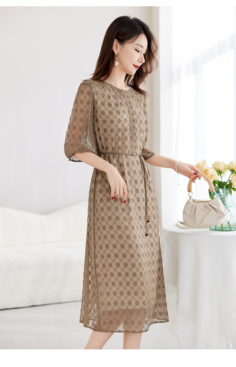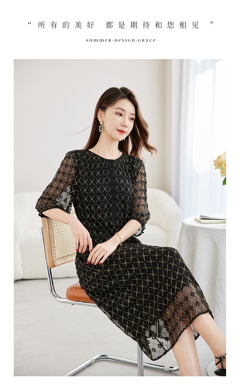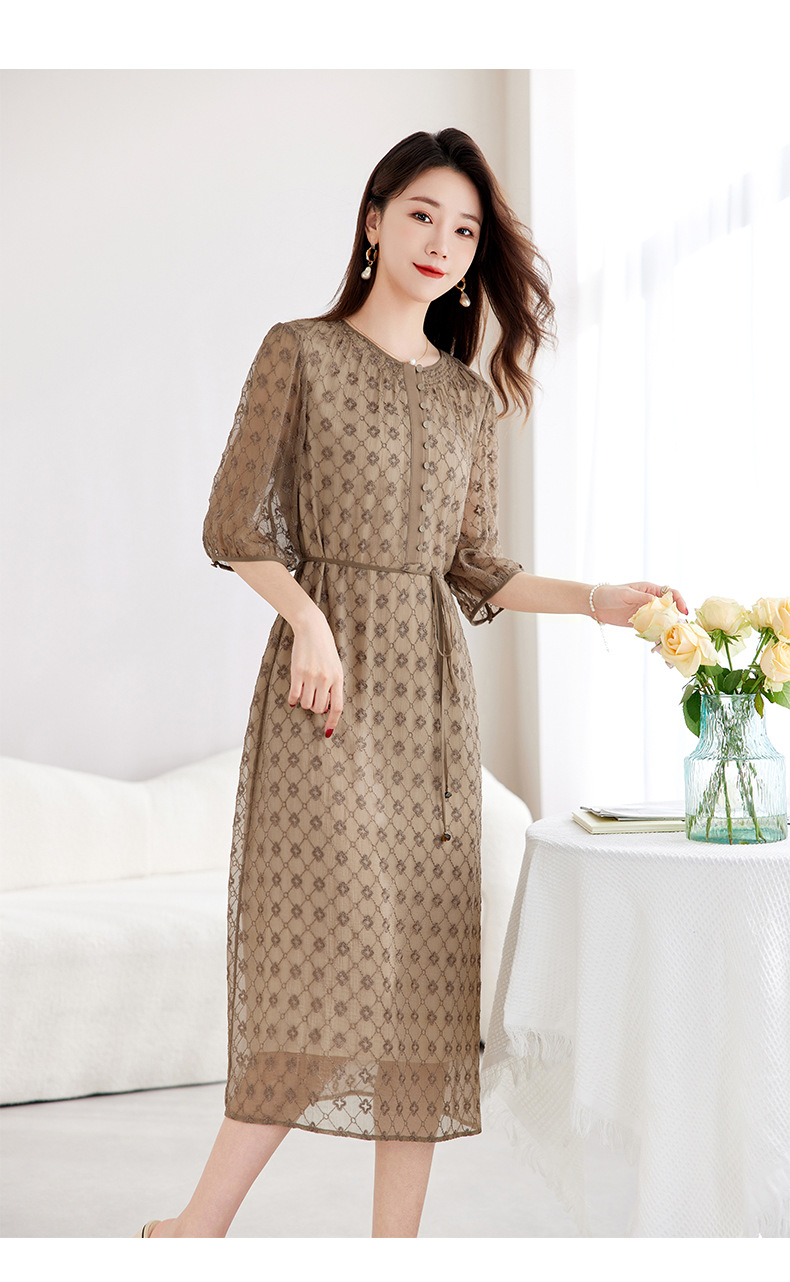 丁摩真丝绣花连衣裙收腰圆领减龄桑蚕丝连衣裙女AL9092