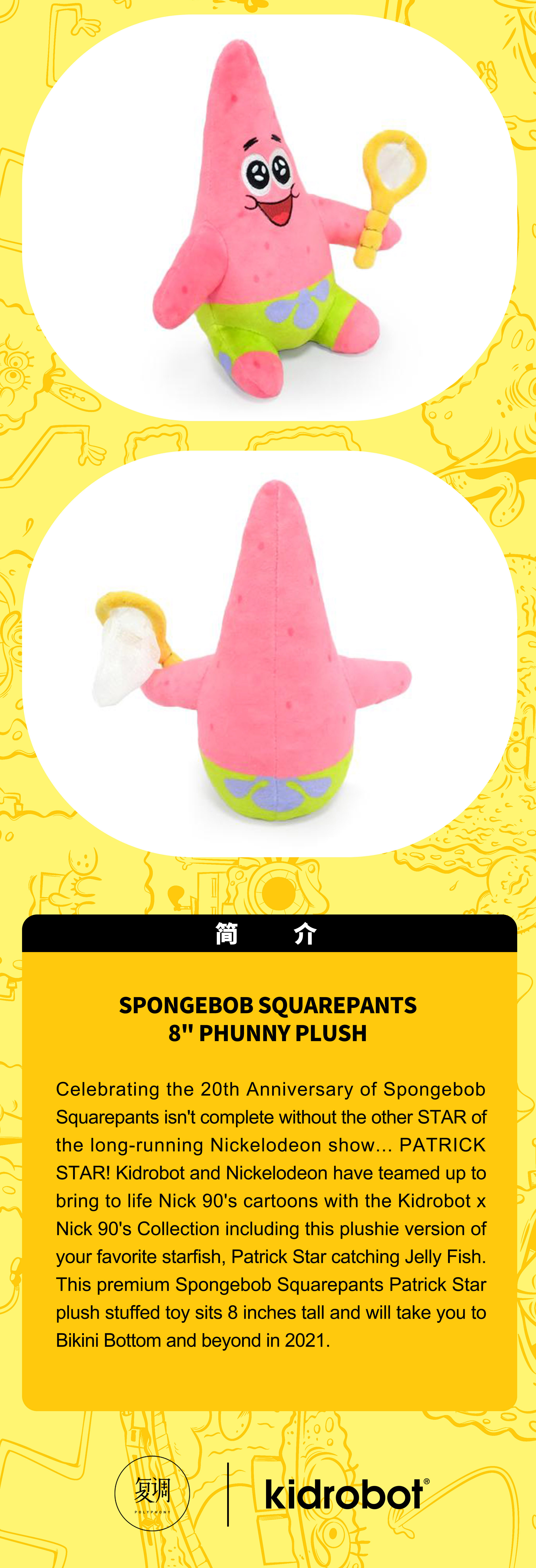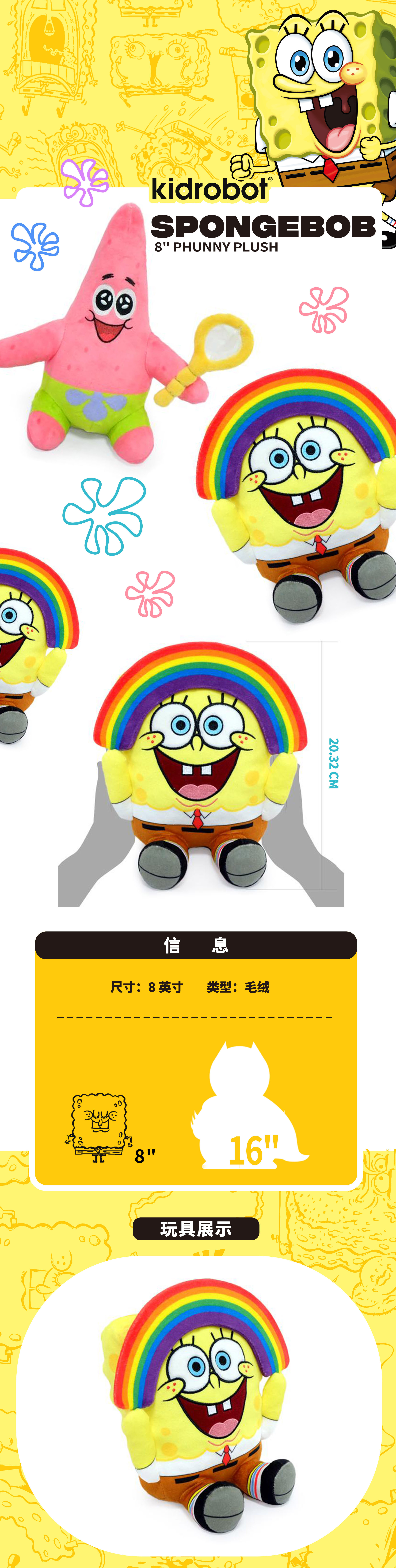 现货 Kidrobot 海绵宝宝 派大星 Phunny 8英寸 毛绒抱枕 摆件 可爱