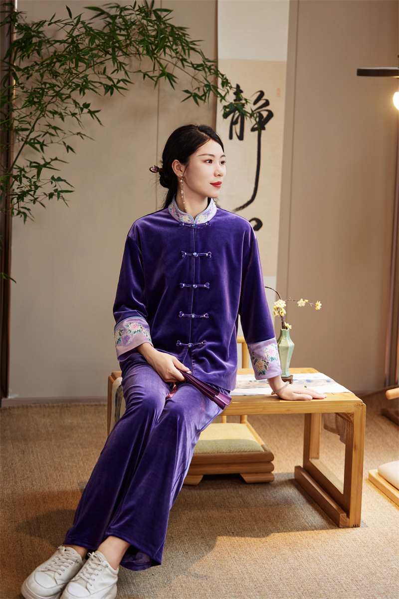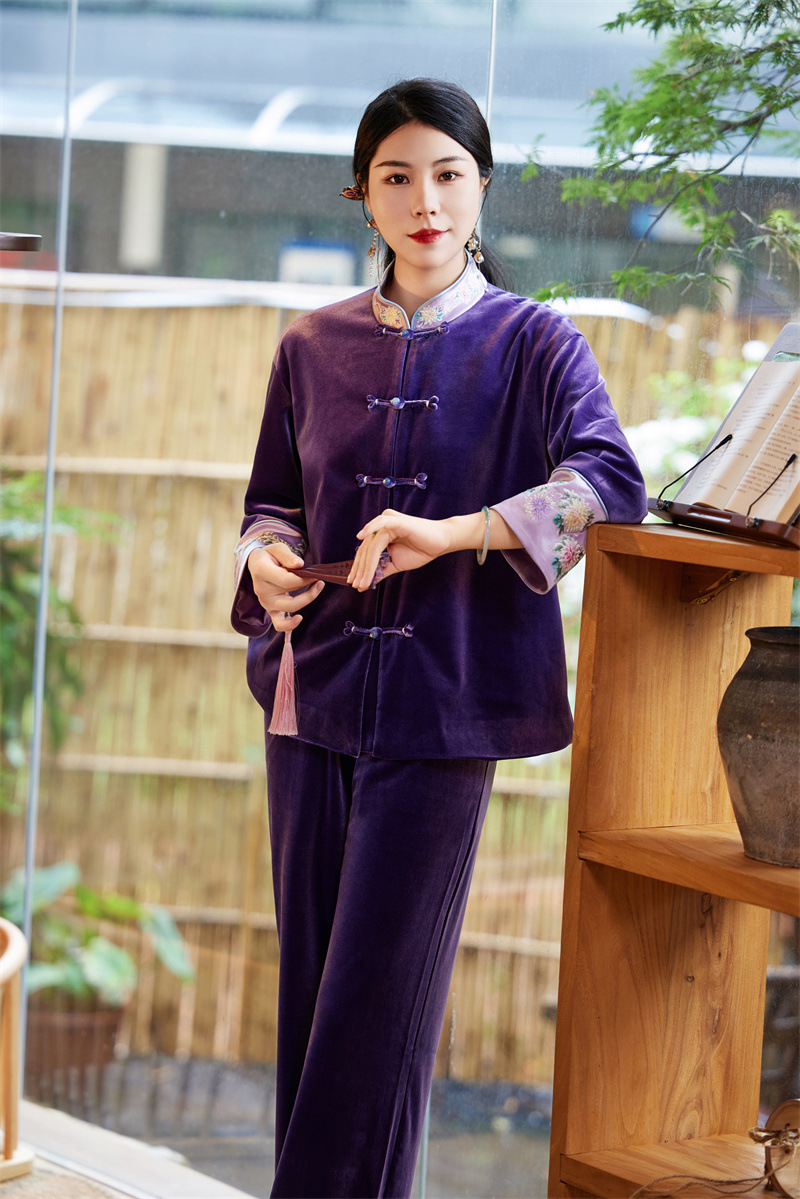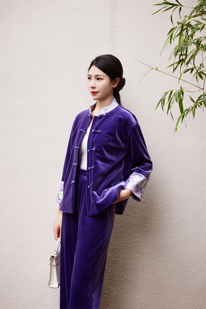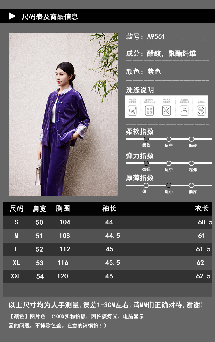 FLZD新中式唐装丝绒拼接外套女装开衫上衣盘扣刺绣气质感国风女