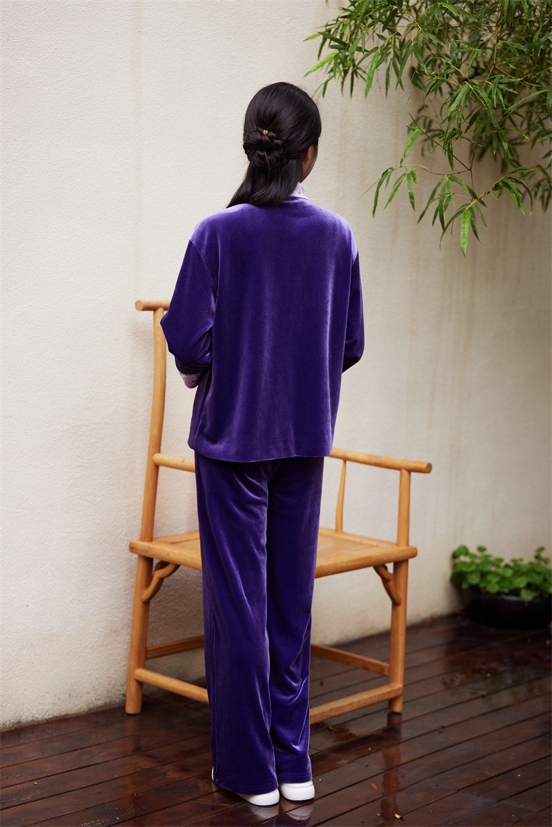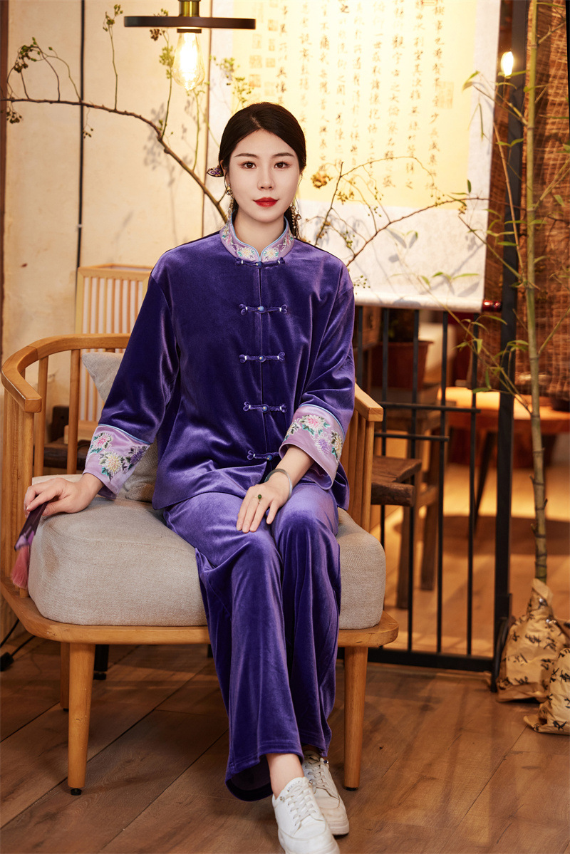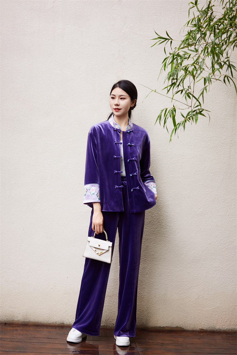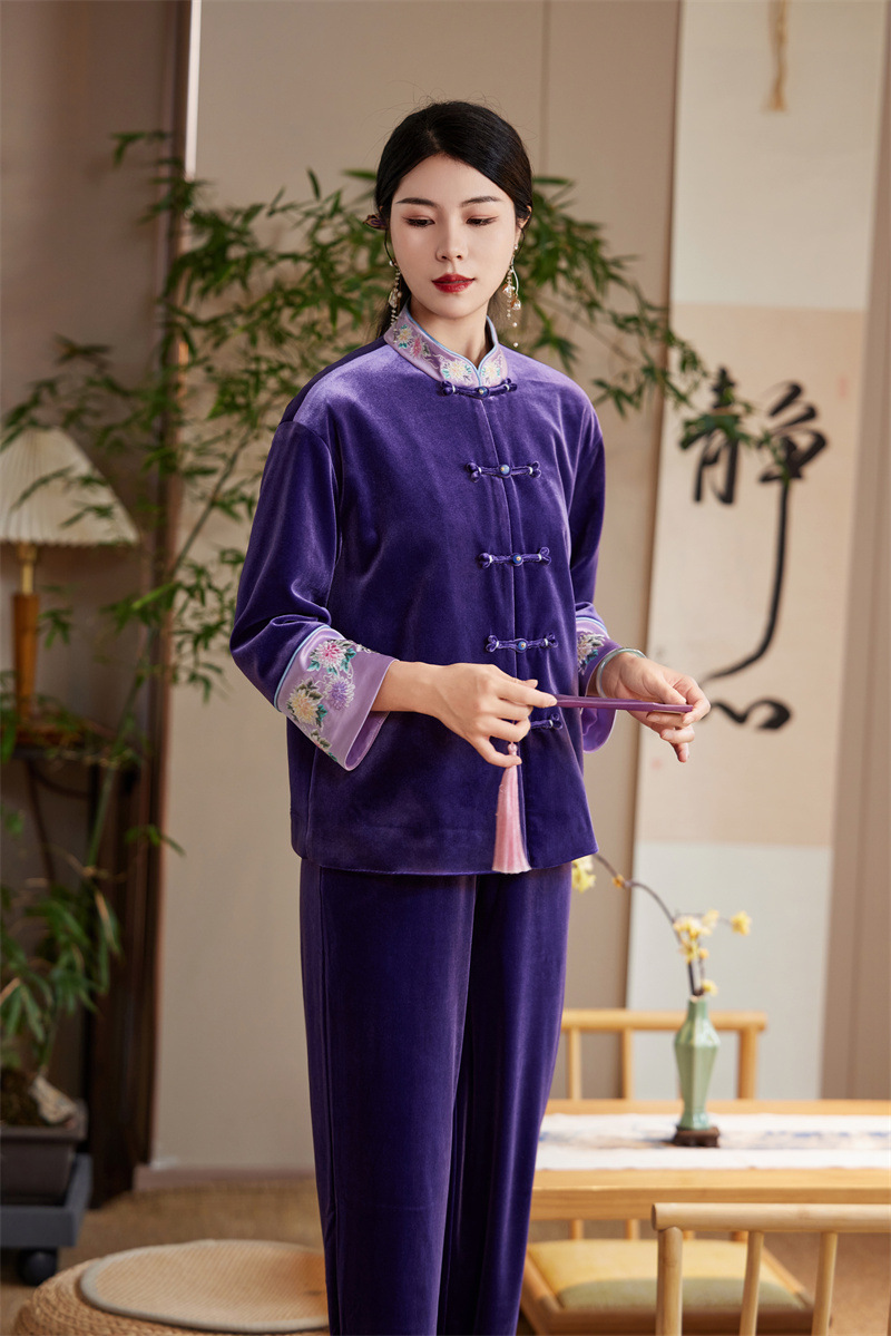 FLZD新中式唐装丝绒拼接外套女装开衫上衣盘扣刺绣气质感国风女