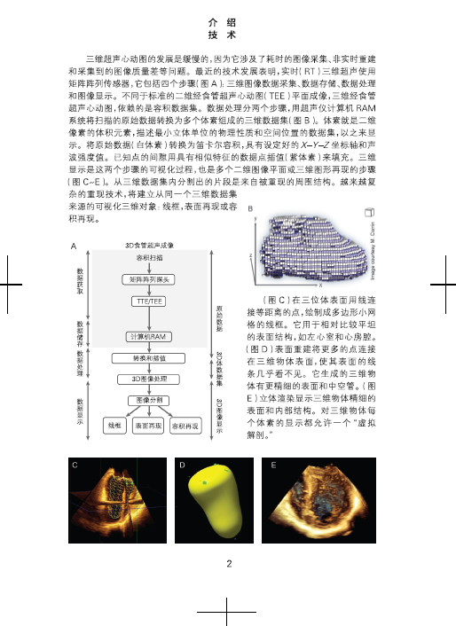 三维经食管超声心动图( TEE)是一种有效的视觉媒体,可由初学或有经验的超声心动图医生、心脏内科和心脏外科医生使用。它可以对正常和病理性的心脏功能和解剖实现更好的了解和评估。这项新技术填补了传统二维成像的不足,并从多个角度实现任何心脏结构的可视化。三维技术使超声心动图在图像采集和处理方面获得了不同的技能设置。