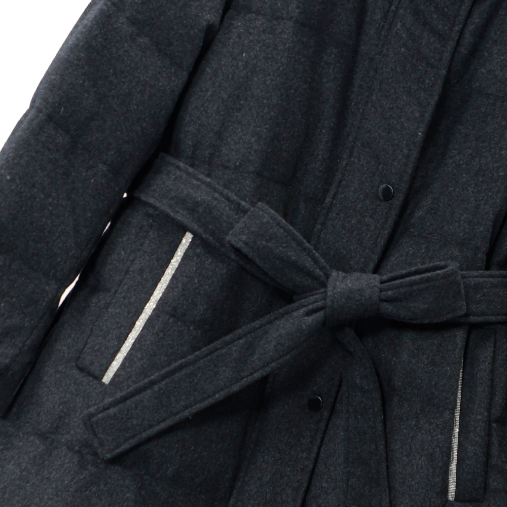 面料A:10%桑蚕丝 90%羊毛(澳洲)面料B:7%桑蚕丝93%聚酯纤维 胆布:100%聚酯纤维 配料:92%莱赛尔纤维8%氨纶 填充物:霍尔多巴吉95白鹅绒(绒子含量91%)以上 充绒量:M码,195g;L码,202g;XL码,209g;XXL码,216g
