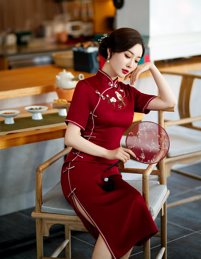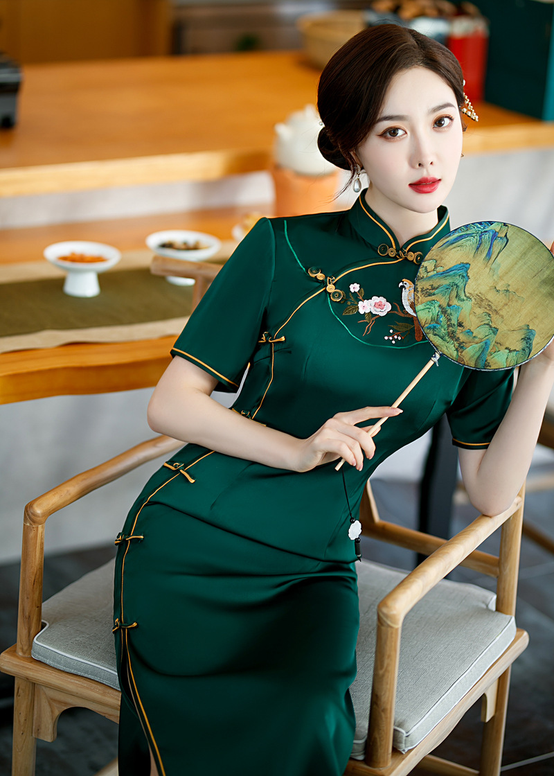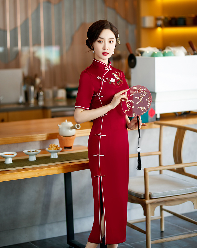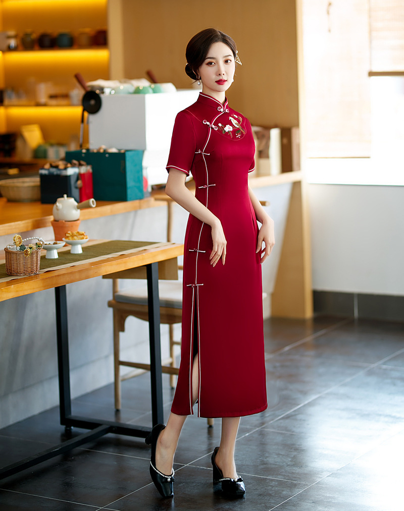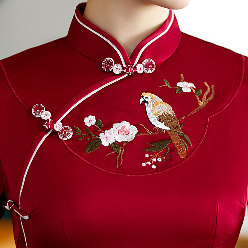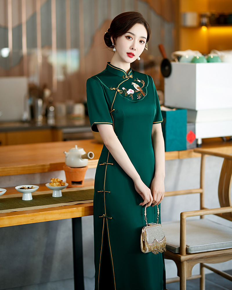 气质仿醋酸长款八扣走秀绣花立领旗袍YMT-602