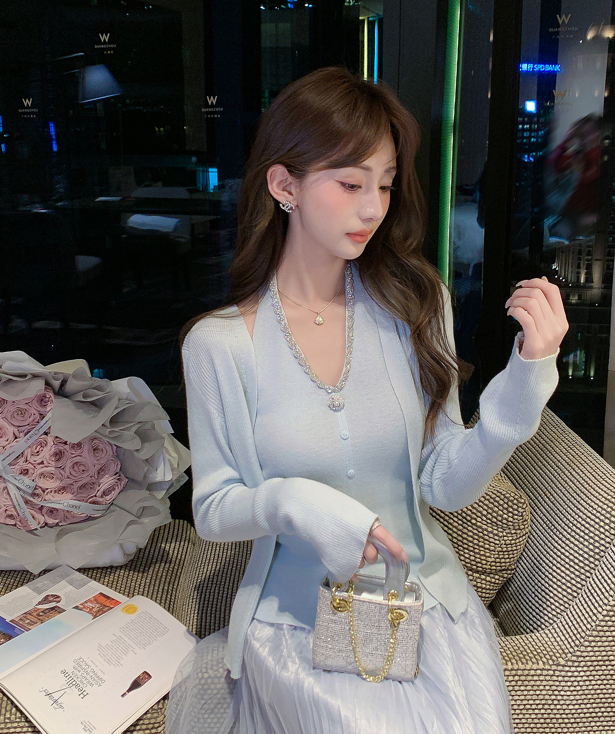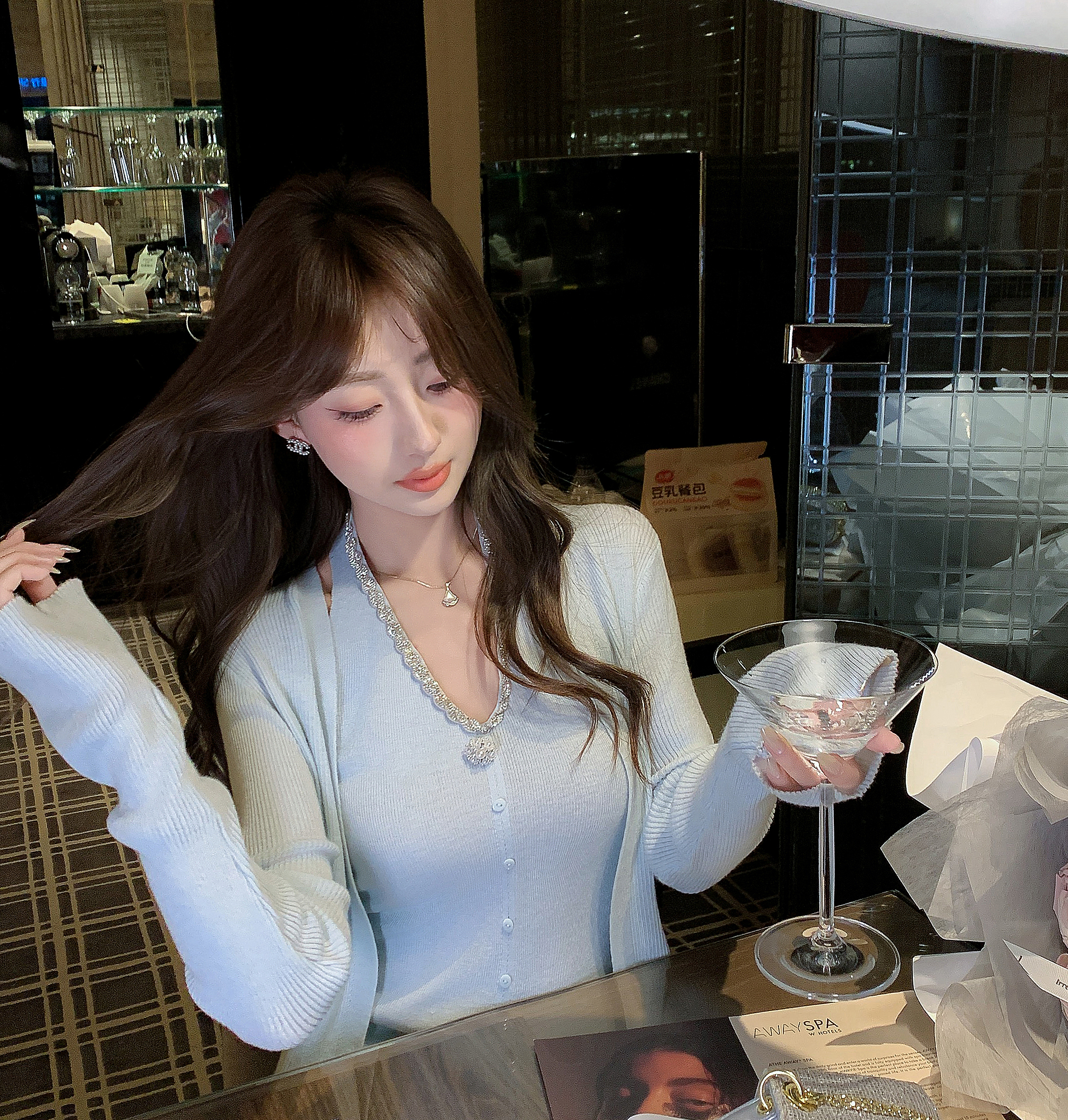 张心子【浪漫绮想】法式挂脖上衣开衫两件套女春新款性感修身套装 U2602068