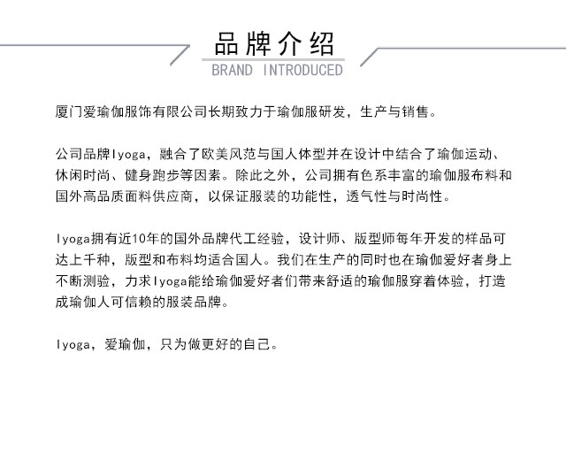 IYOGA品牌的产生源于对瑜伽以及各种运动的热爱, 并努力把瑜伽运动的理念,融入于服装的每一个细节与每一个工艺之中。我们的设计结合了瑜伽运动,休闲时尚,健身跑步等因素,让服装对运动起到良好的保护。