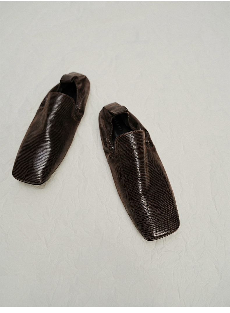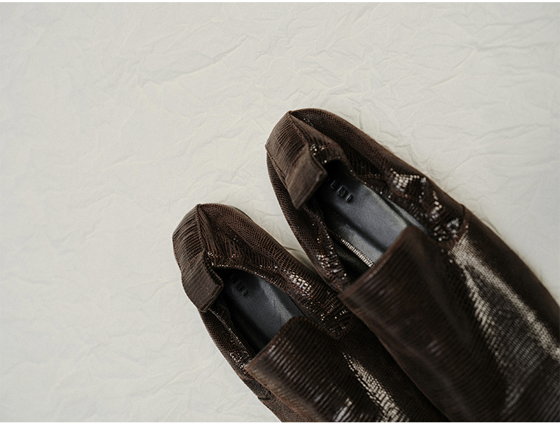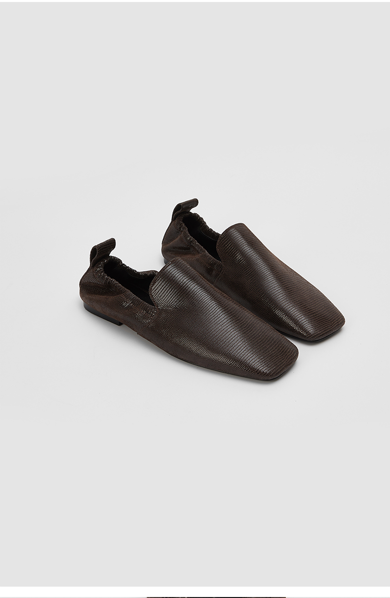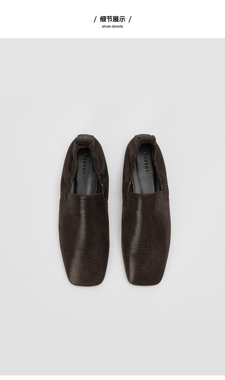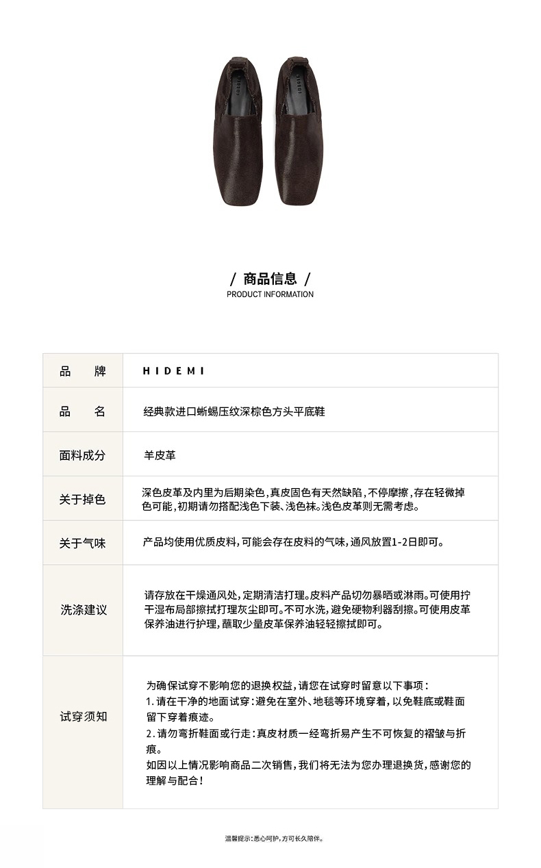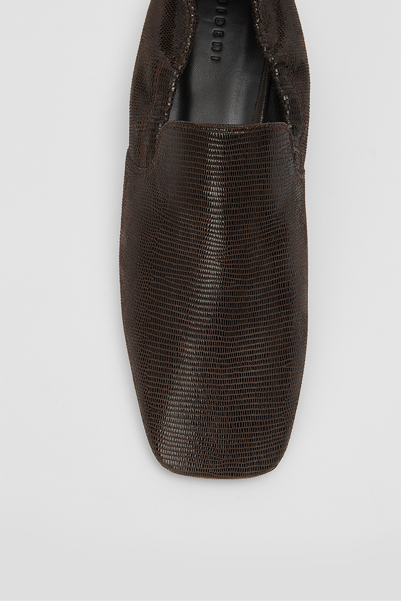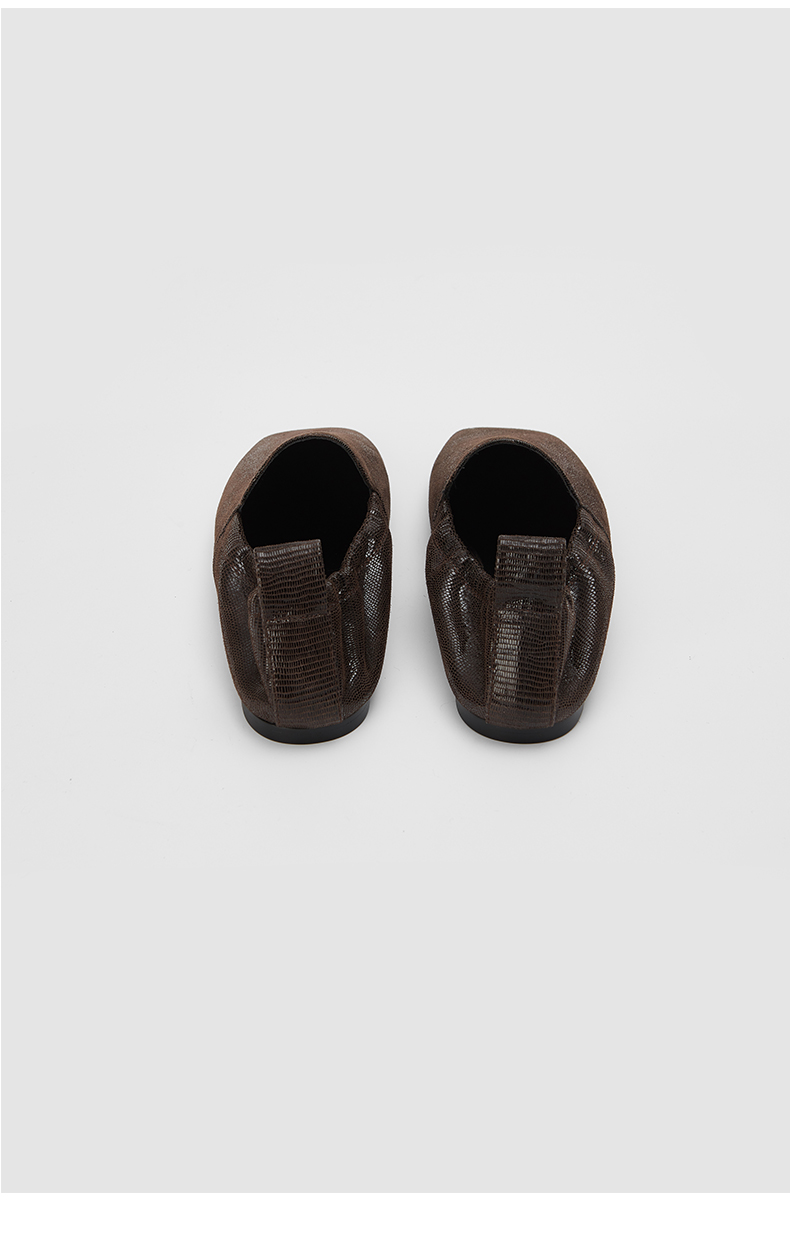 HIDEMI 经典款蜥蜴压纹深棕色方头平底鞋