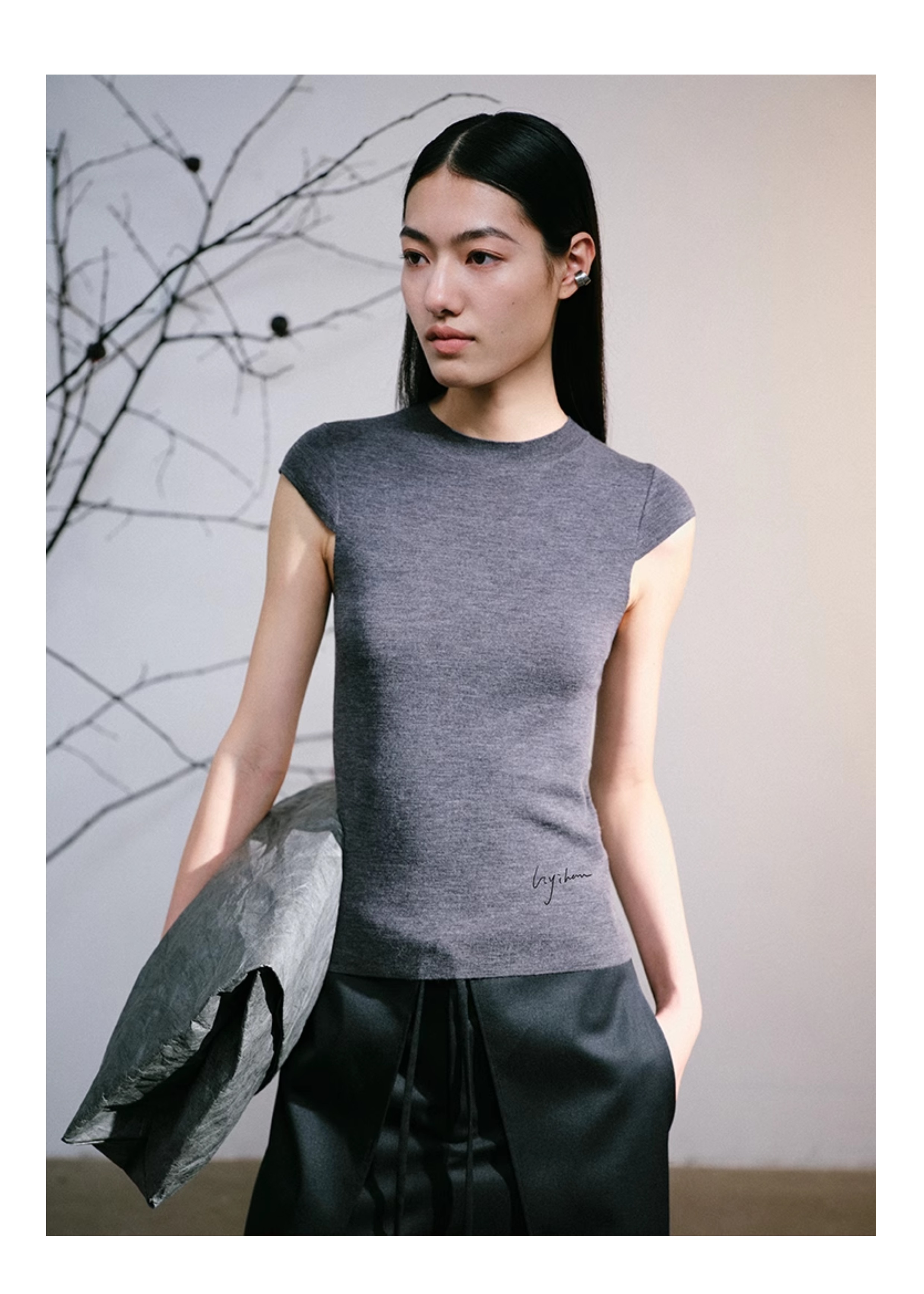 LIYIHAN 2025秋季新款醋酸羊绒圆领灰色打底衫女毛衣高级感针织衫
