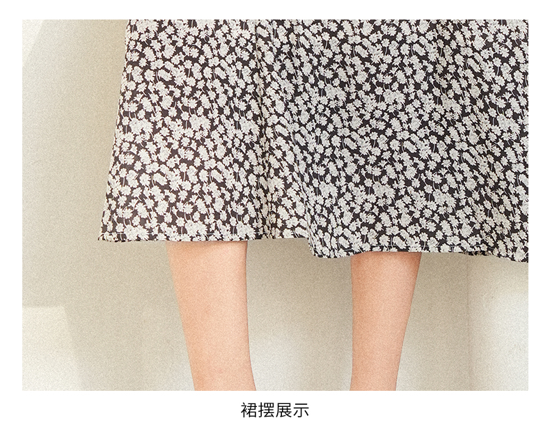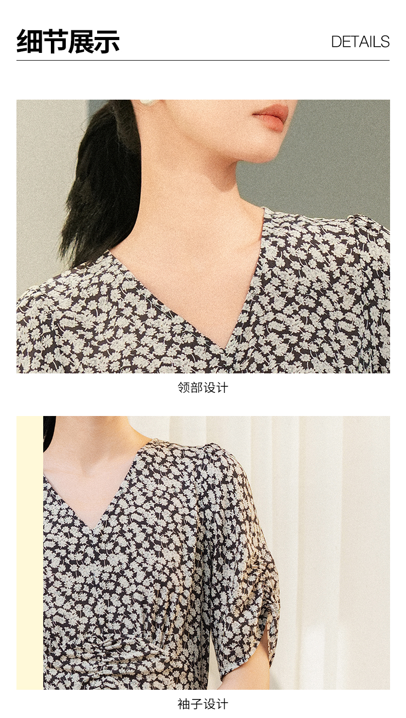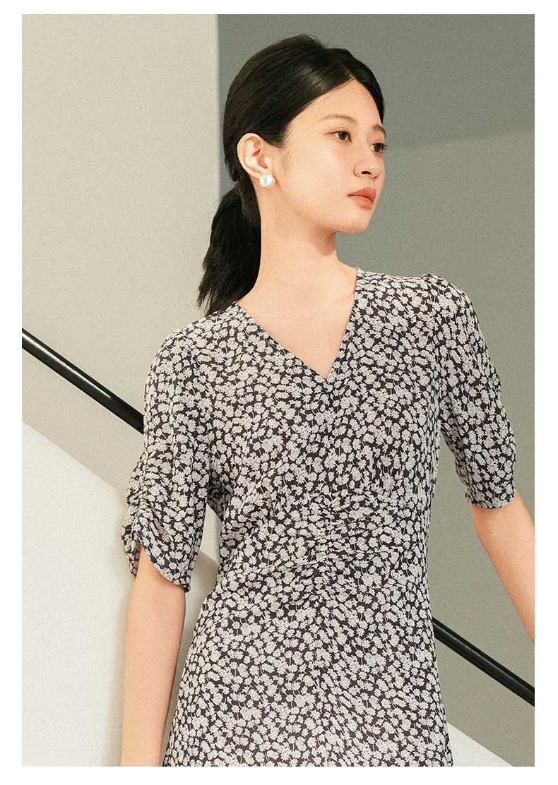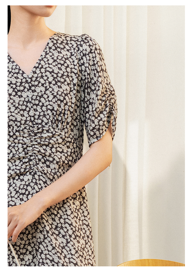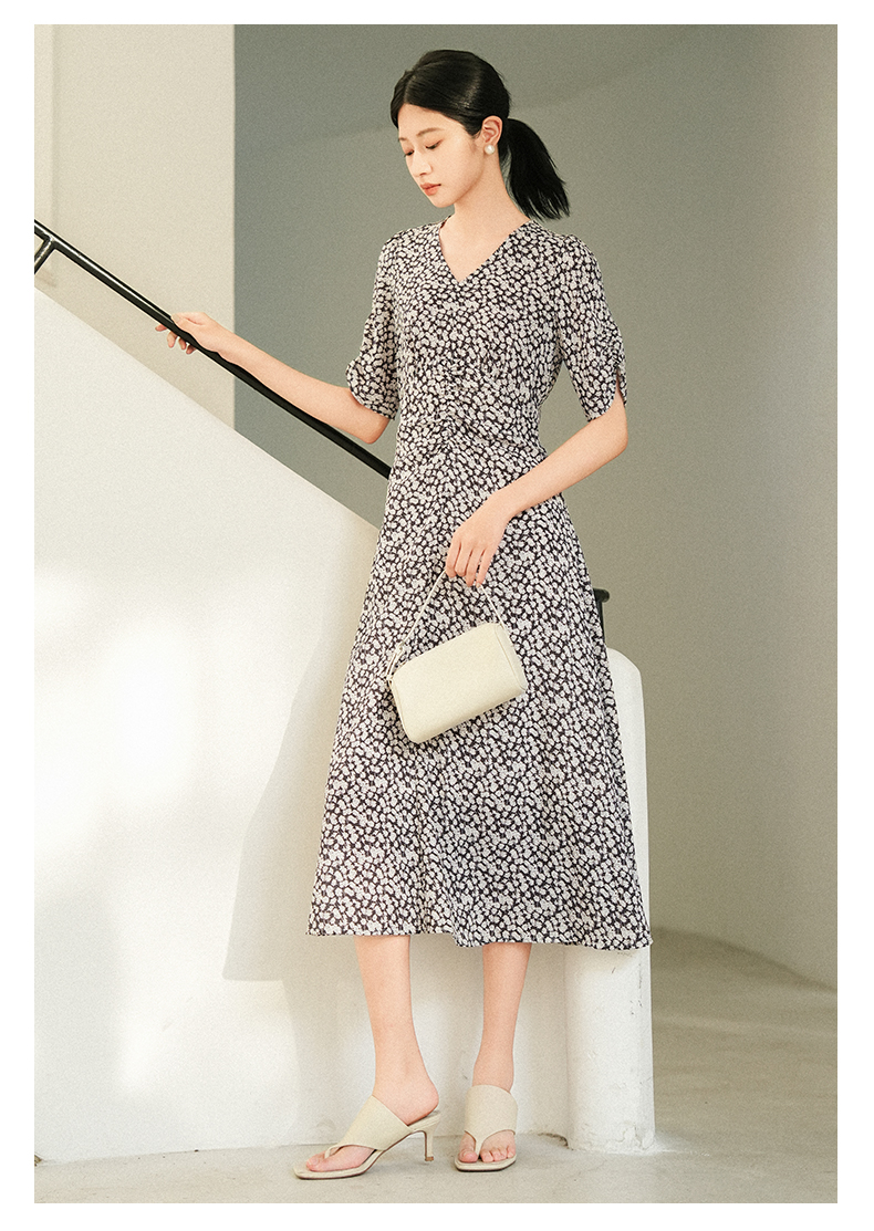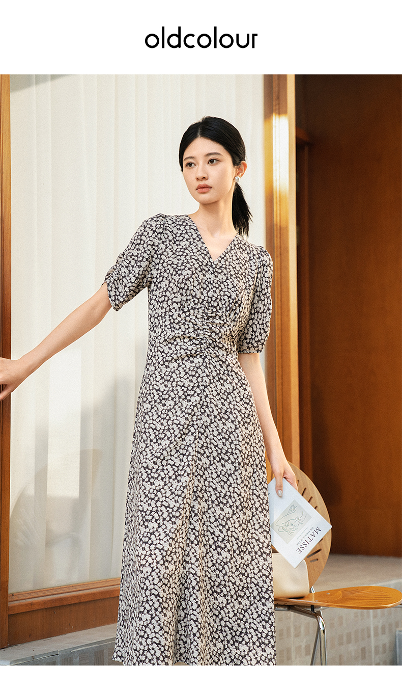 oldcolour夏季新款优雅气质高腰显瘦V领短袖碎花连衣裙女Q241007A1