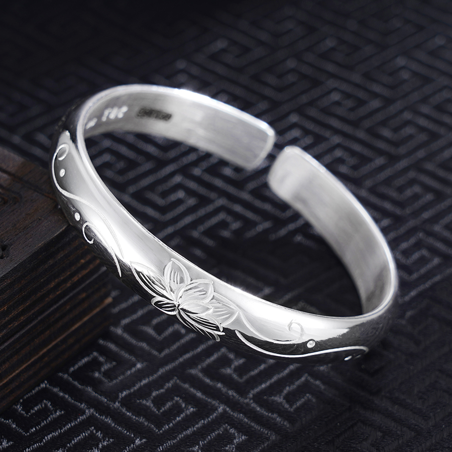【寓意】:纯银开口手镯,镯面錾刻莲花图案。花瓣肌理分明,灵动之感扑面而来。寓意清雅相伴,静享美好流年。