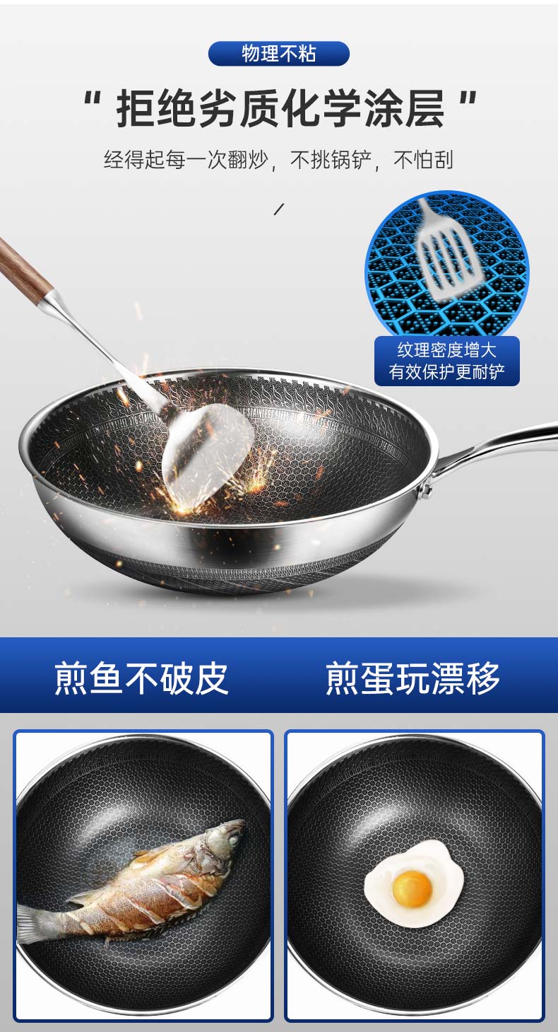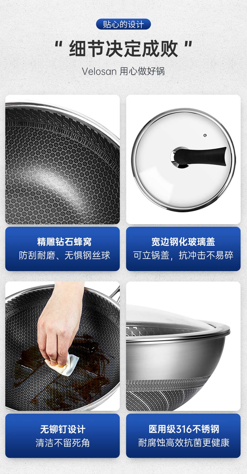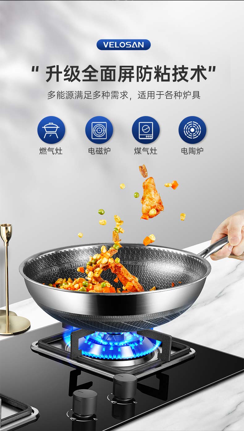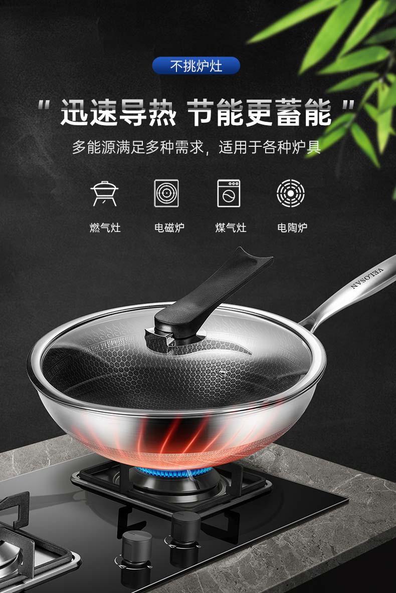 velosan不粘锅炒锅家用316不锈钢蜂窝炒菜锅平底电磁炉煤气灶适用