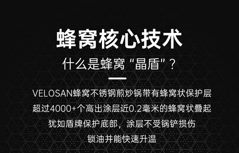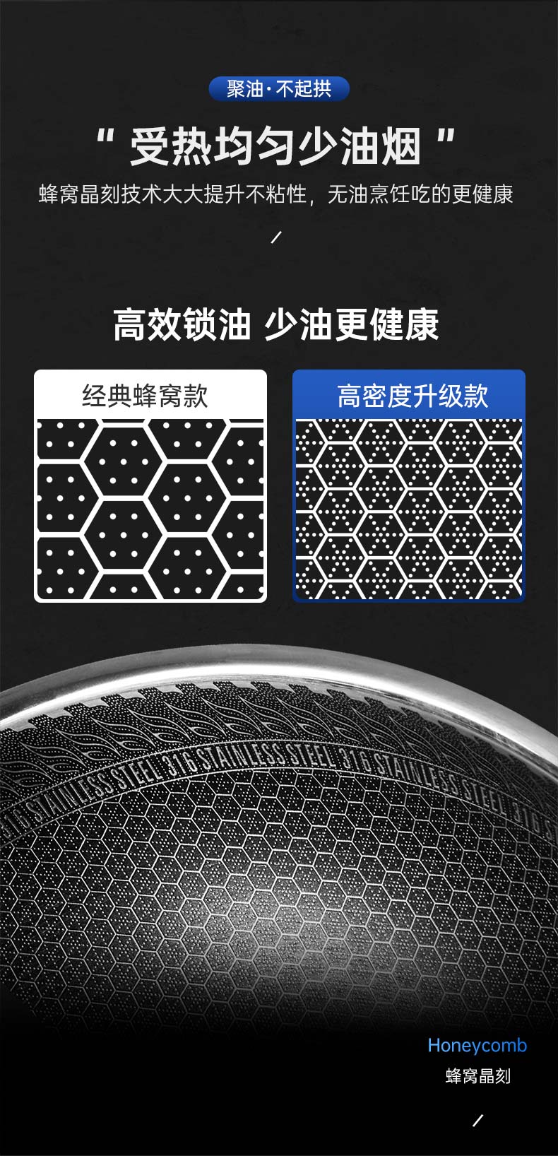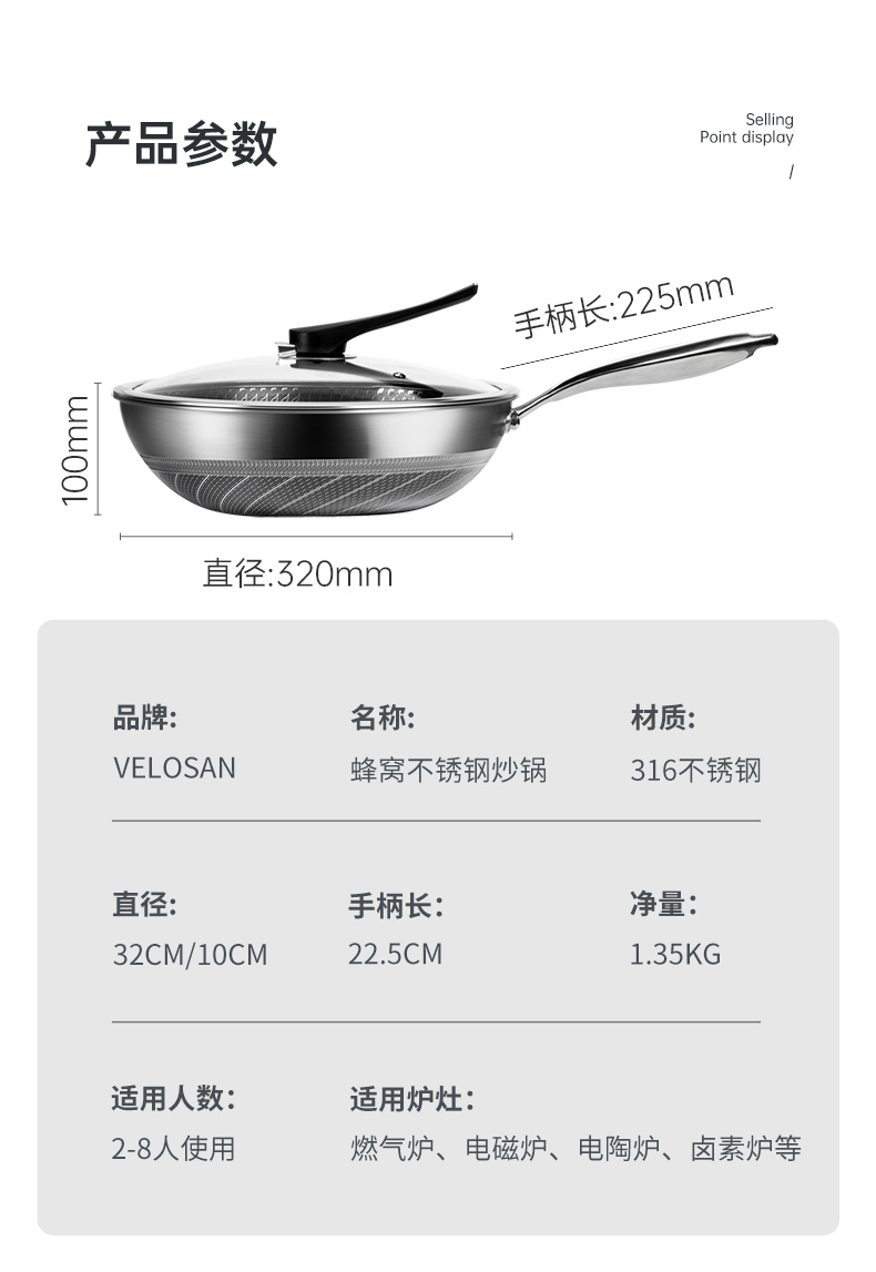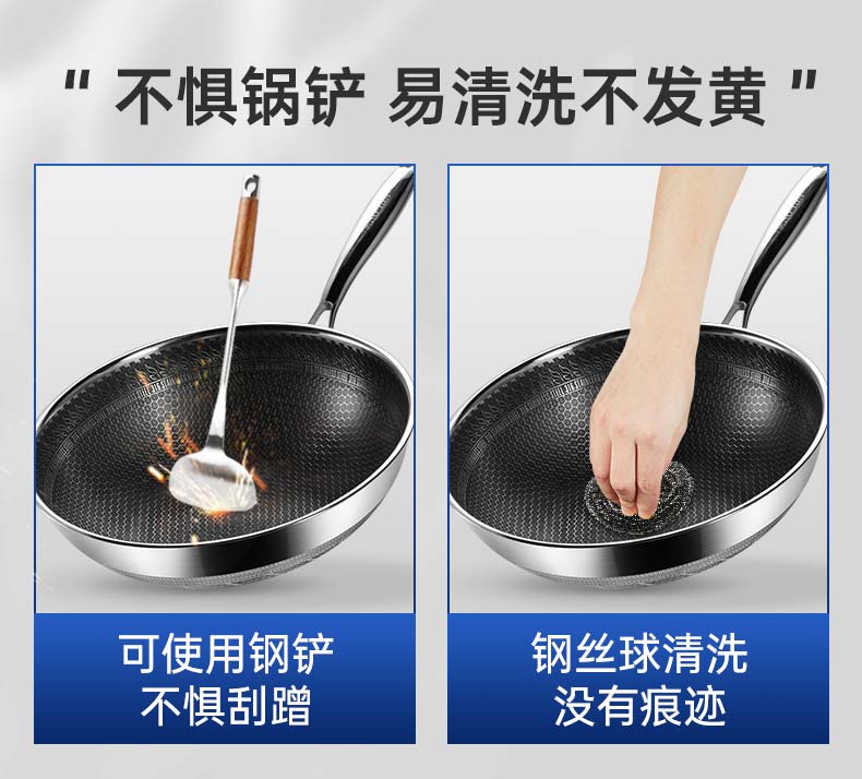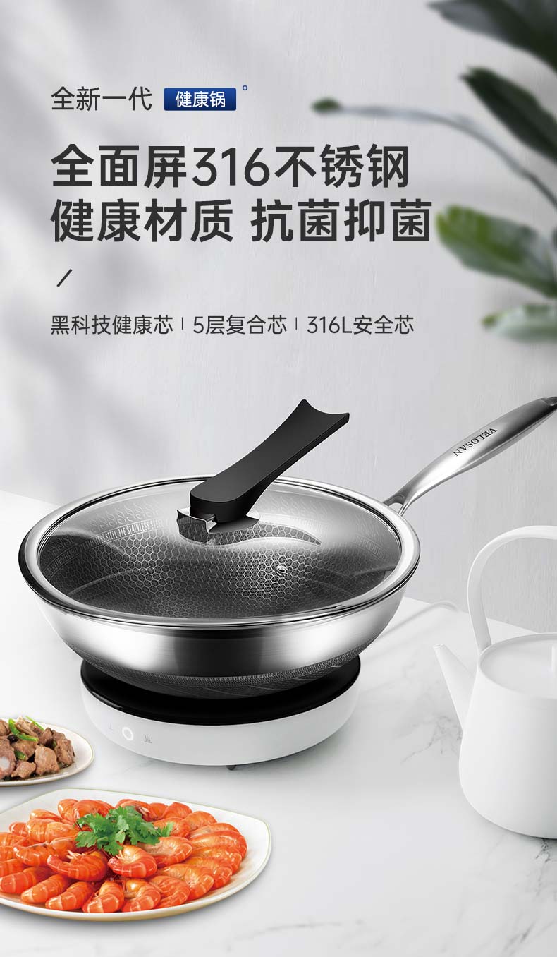 velosan不粘锅炒锅家用316不锈钢蜂窝炒菜锅平底电磁炉煤气灶适用