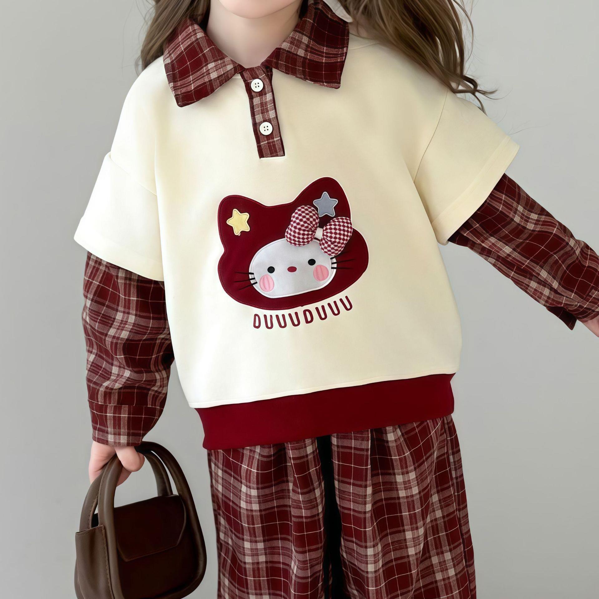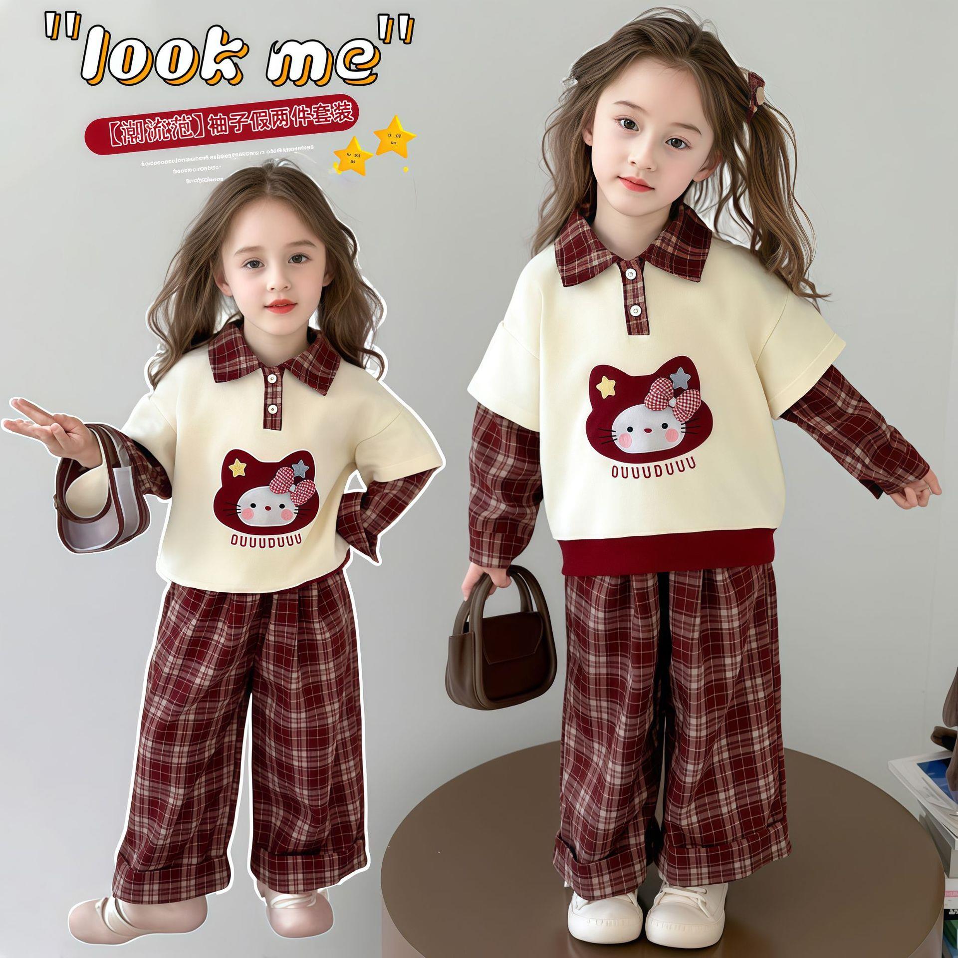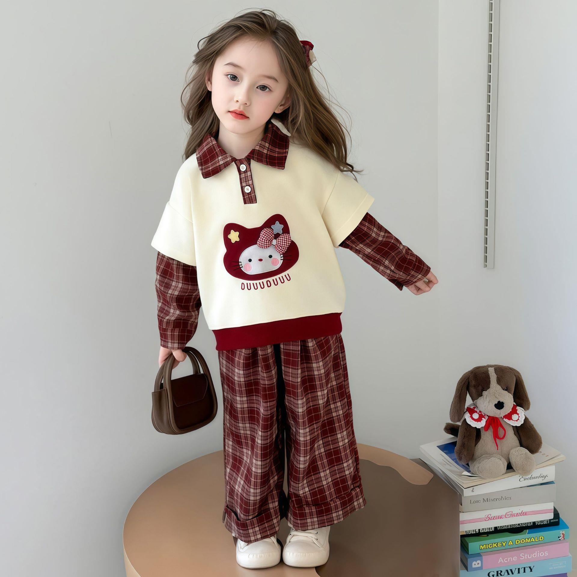 Laffey & Monkey儿童春秋款卫衣套装 女童可爱格子套装 宝宝假两件Polo长袖阔腿裤80-150