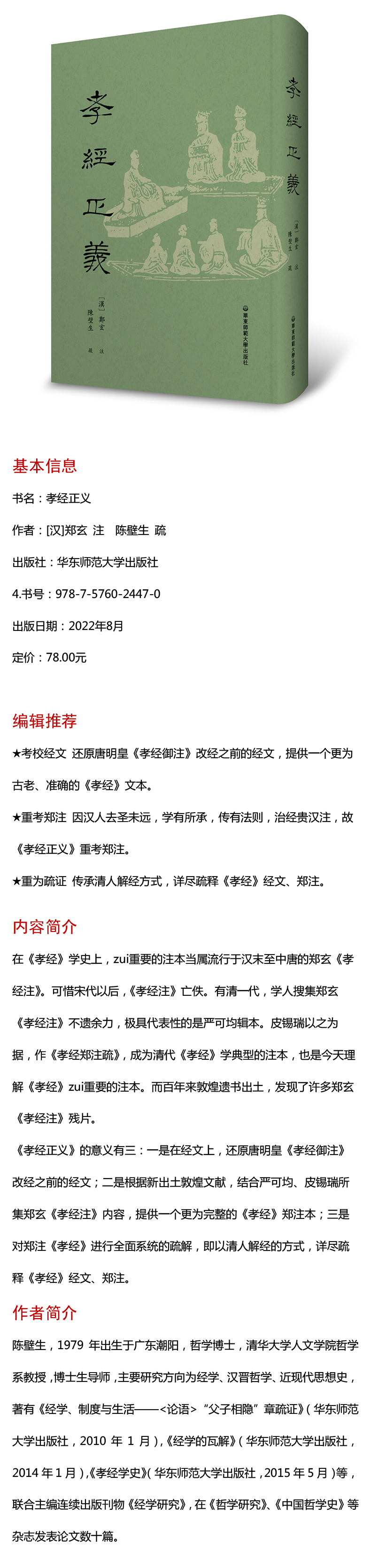 《孝经正义》是对《孝经》郑注的疏解,旨在以传统的方式,提供一部对郑玄《孝经注》的详尽的疏解本。 在《孝经》学目前,最重要的注本当属流行于汉末至中唐的郑玄《孝经注》。可惜宋代以后,《孝经注》亡佚。有清一代,学人蒐集郑玄《孝经注》不遗余力,拥有代表性的是严可均辑本。皮锡瑞以之为据,作《孝经郑注疏》,成为清代《孝经》学最典型的注本,也是今天理解《孝经》最重要的注本。而百年来敦煌遗书出土,发现了许多郑玄《孝经注》残片。 《孝经正义》的特点有三:一是在经文上,还原唐明皇《孝经御注》改经之前的经文,提供一个更为古老的今文《孝经》文本。二是根据新出土敦煌文献,结合严可均、皮锡瑞所集郑玄《孝经注》内容,提供一个今天可见最为完整的《孝经》郑注本。三是对郑注《孝经》进行全面系统的疏解,即以清人解经的方式,详尽疏释《孝经》经文、郑注,力求提供一个能够代替皮锡瑞《孝经郑注疏》的注本。