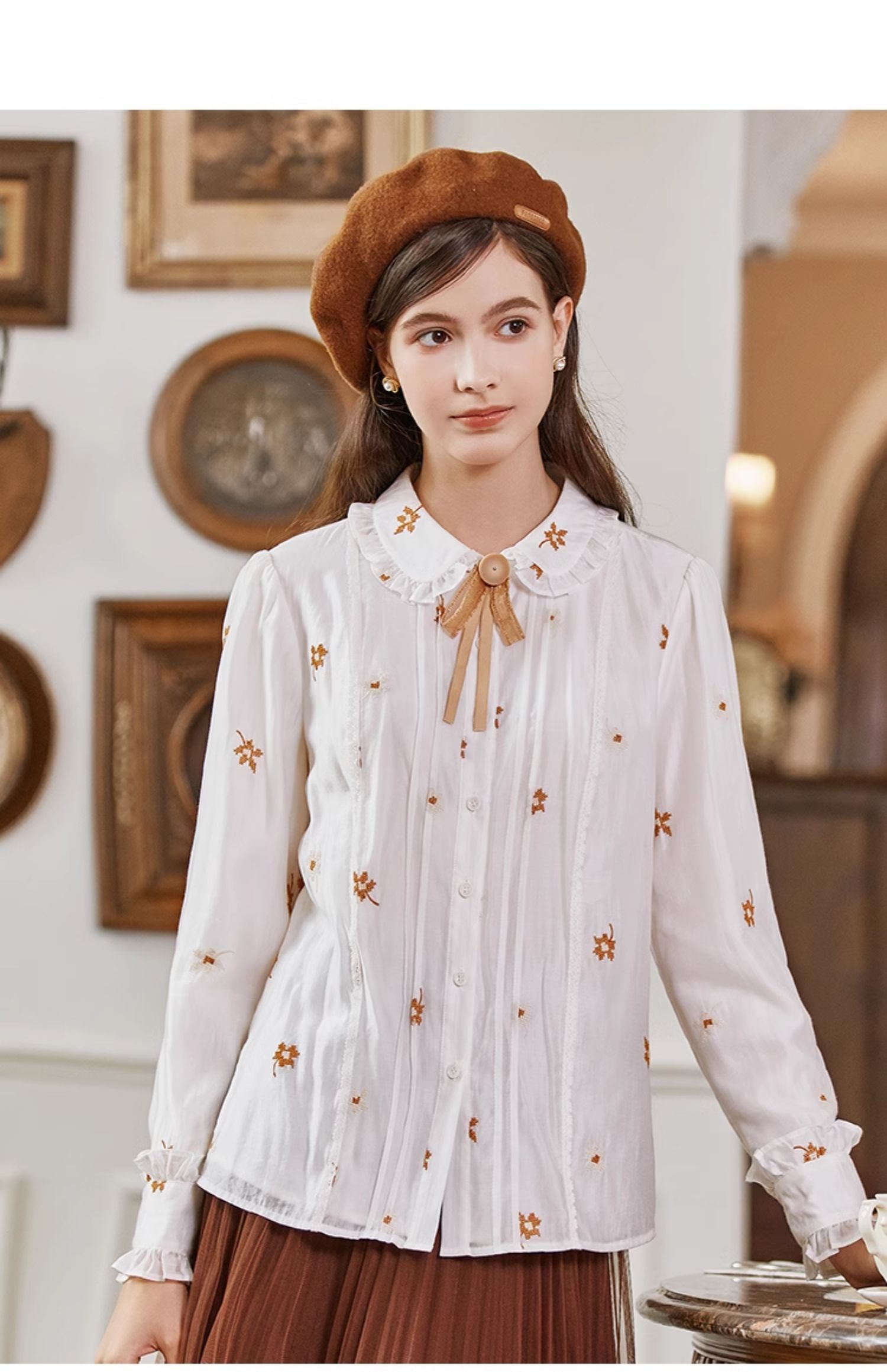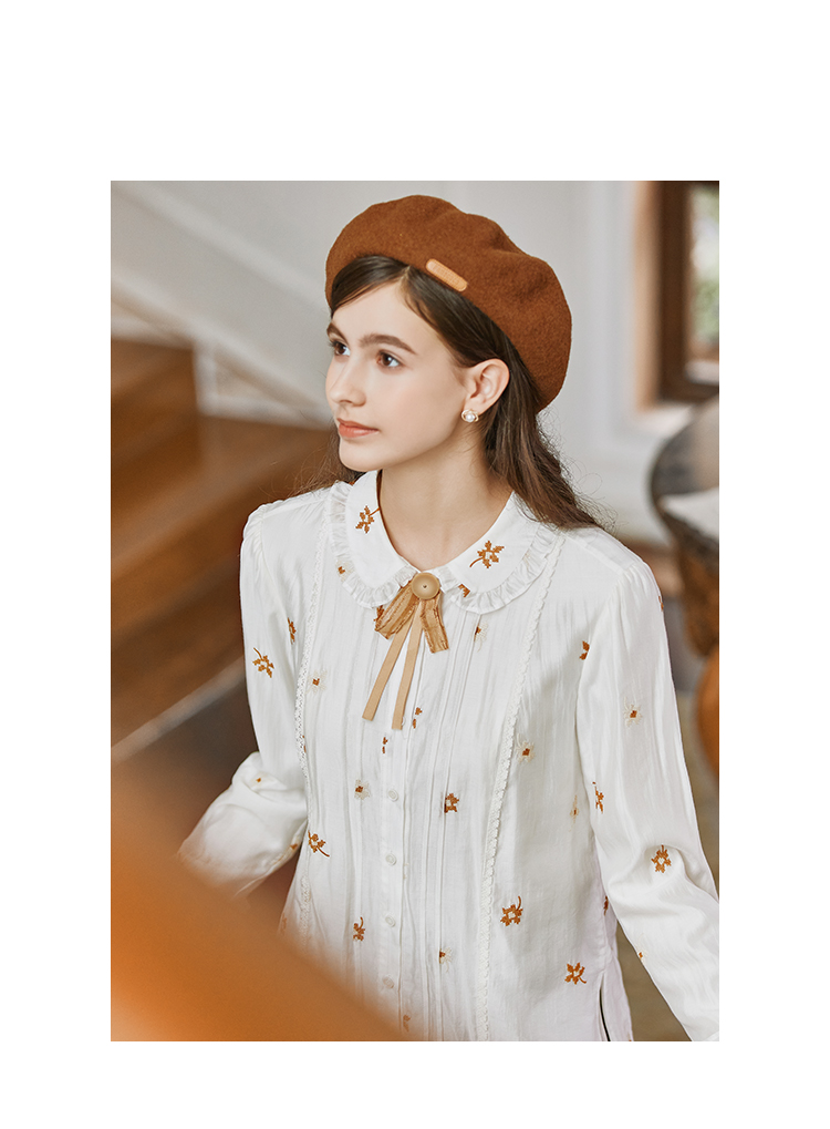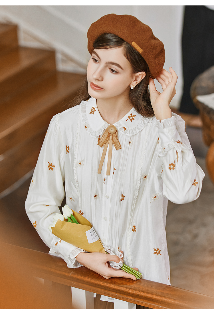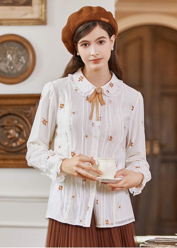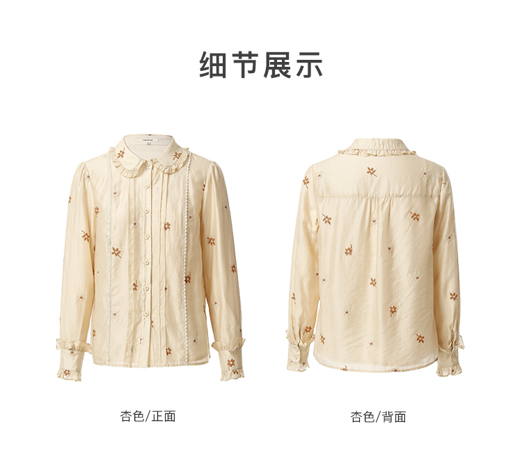 Famecoco花朵刺绣莱赛尔天丝白衬衣女优雅长袖打底FAB8BH002