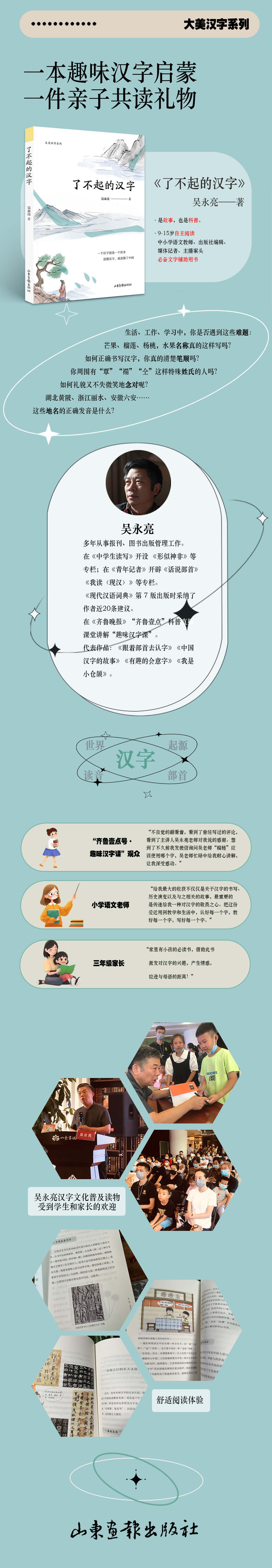 吴永亮 1962年1月生,江苏溧水人。作者结合多年报刊、图书出版管理工作,在《中学生读写》开设 《形似神非》等专栏;在《青年记者》开辟《读报札记》《话说部首》《编校杂谈》《我读〈现汉〉》等专栏。《现代汉语词典》第 7 版出版时采纳了作者近20条建议。2021年5月起,在《齐鲁晚报》“齐鲁壹点”科普直播课堂讲解“趣味汉字课”,受到了中小学生及家长的欢迎,反响强烈。代表作品有《跟着部首去认字》《中国汉字的故事》《有趣的会意字》《我是小仓颉》。