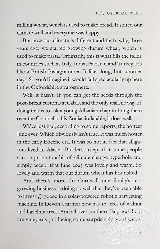 The spring barley crop failed. Just like the oil seed rape. And the durum wheat. Then the oats turned the colour of a hearing aid and the mushrooms went mouldy. Farming sheep, pigs and cows was hardly more lucrative. Jeremy would be better off trying to breed ostriches.