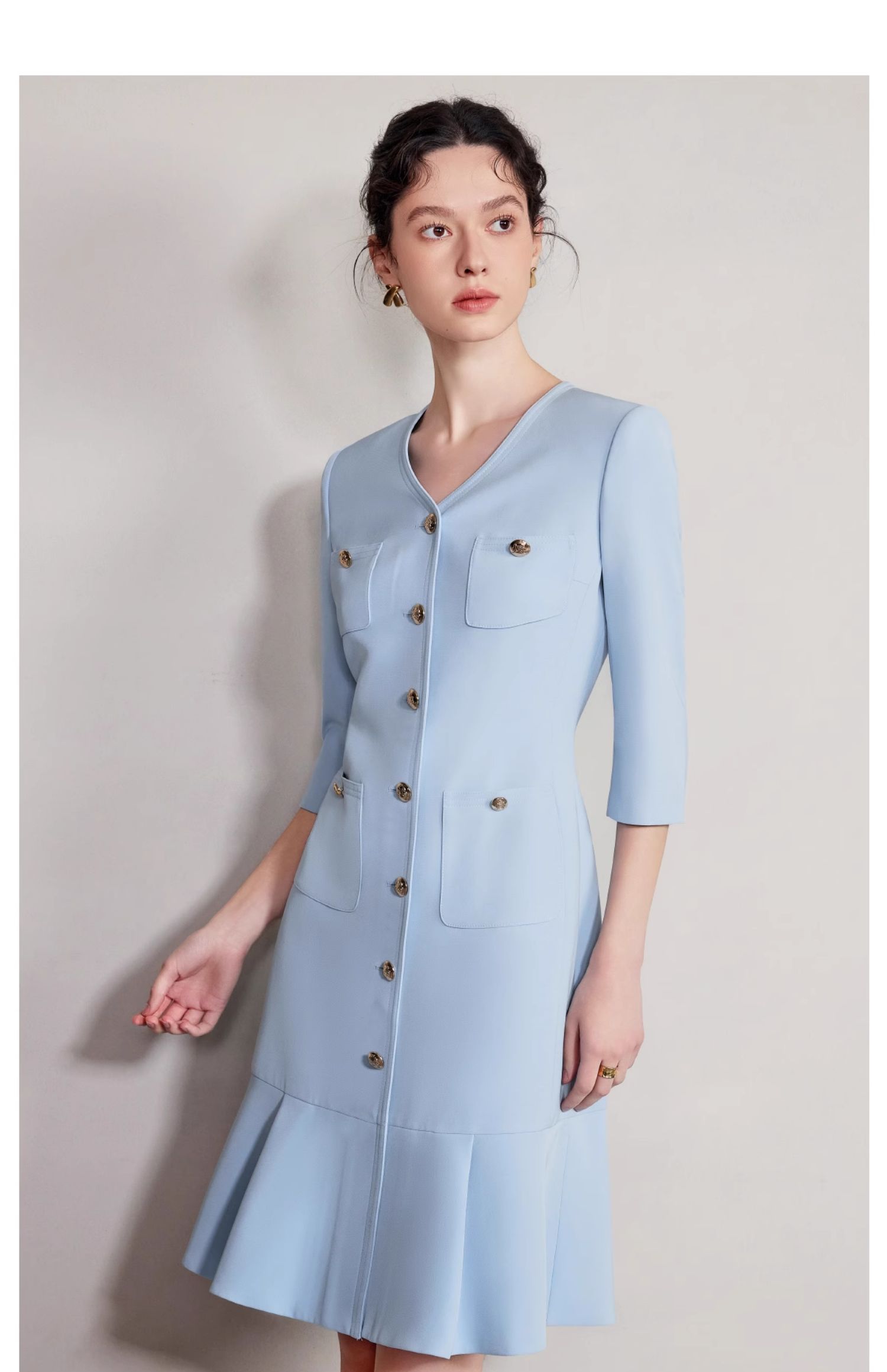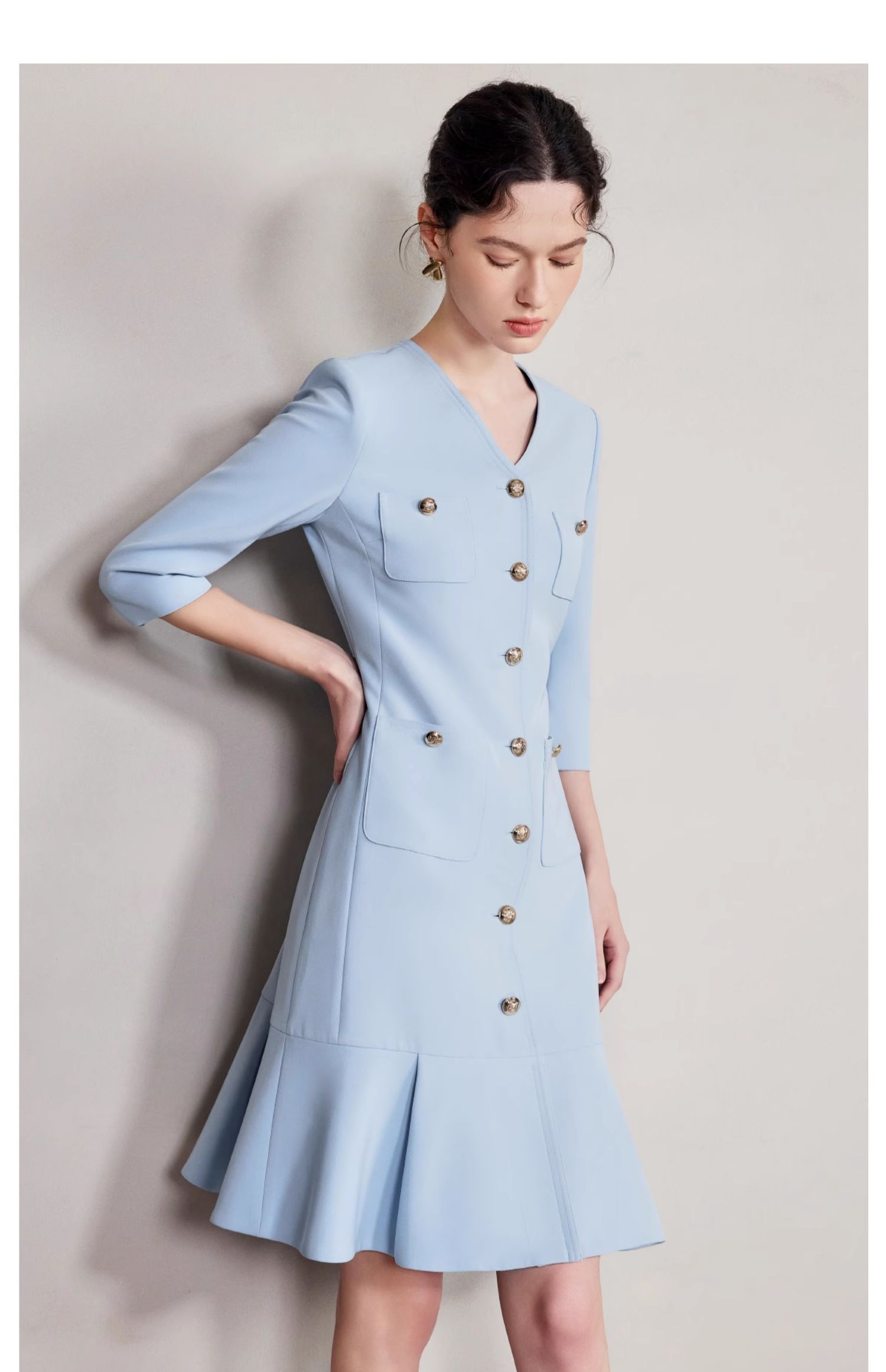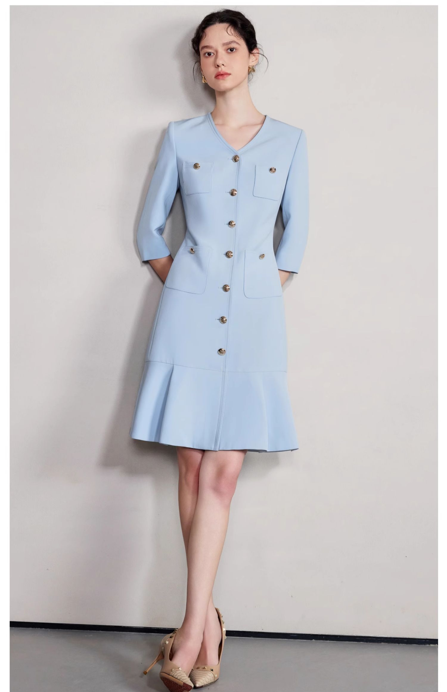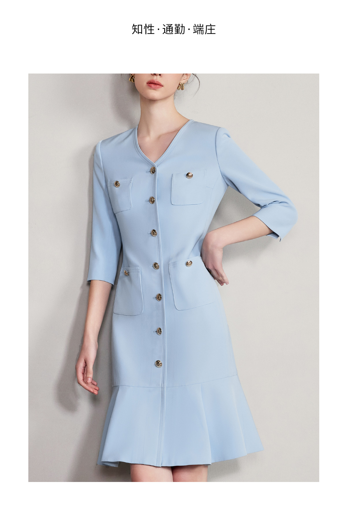IWY/气质V领蓝色连衣裙女士职业装西服裙新款单排扣荷叶边裙子Q1269