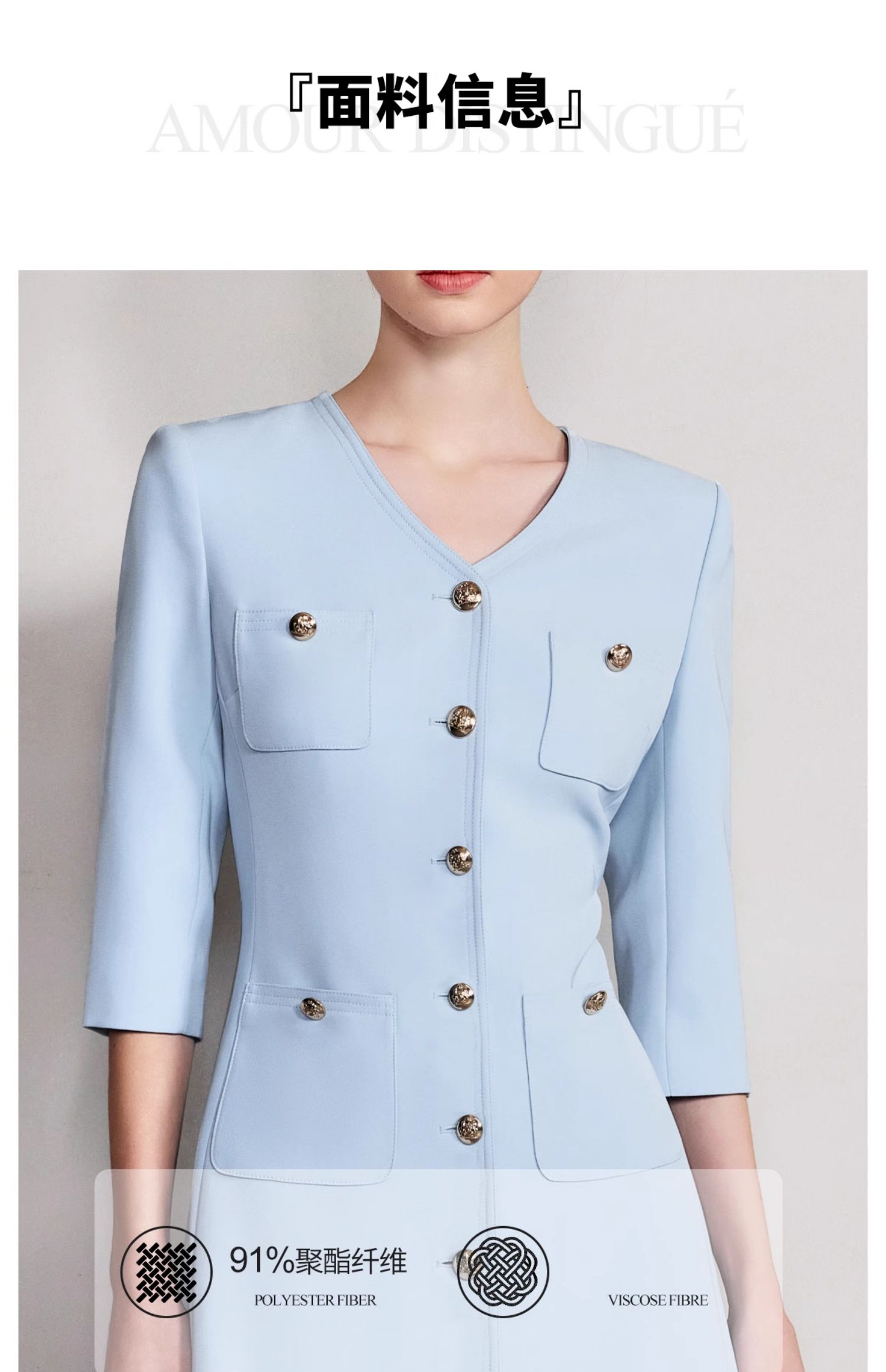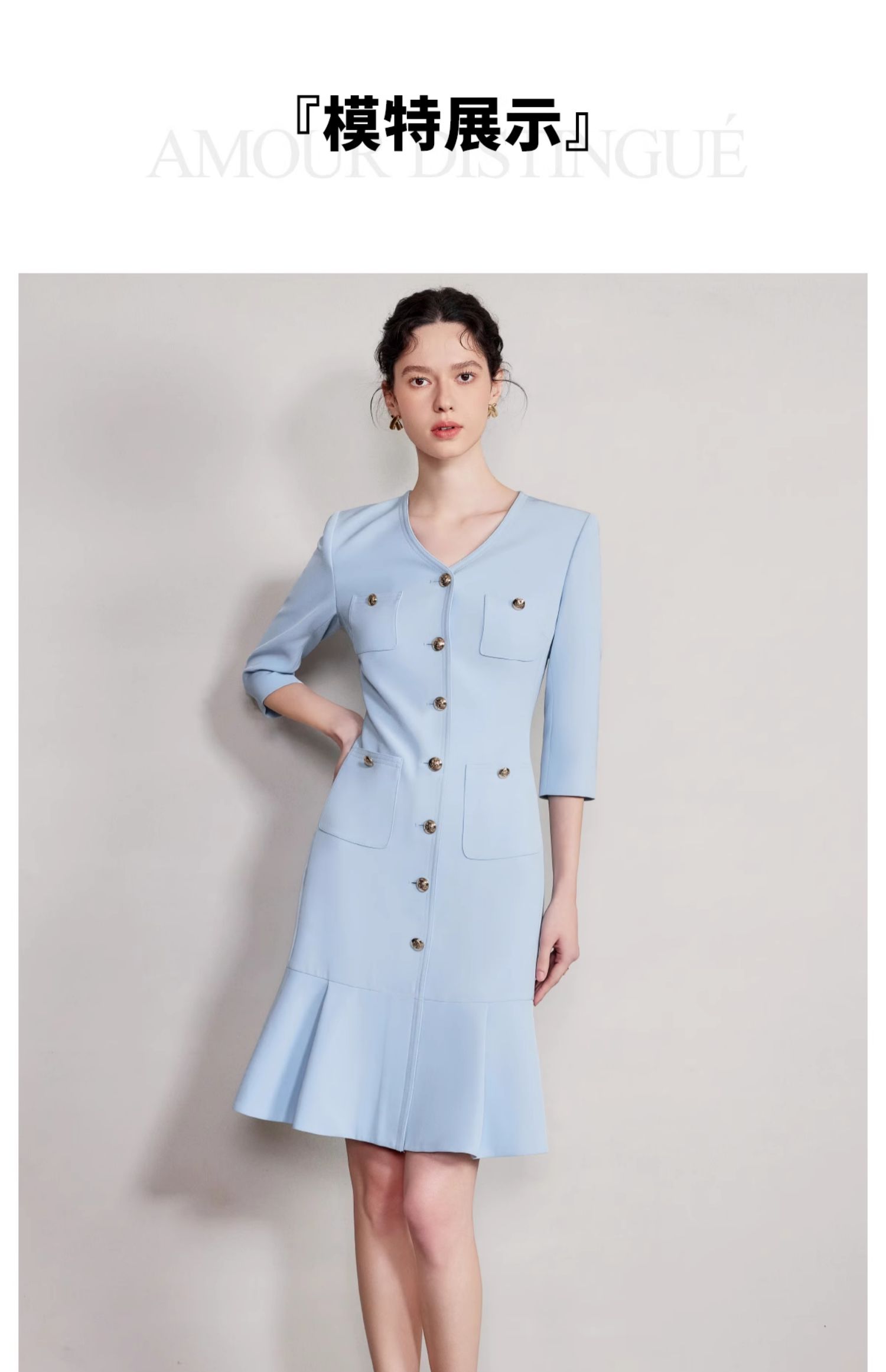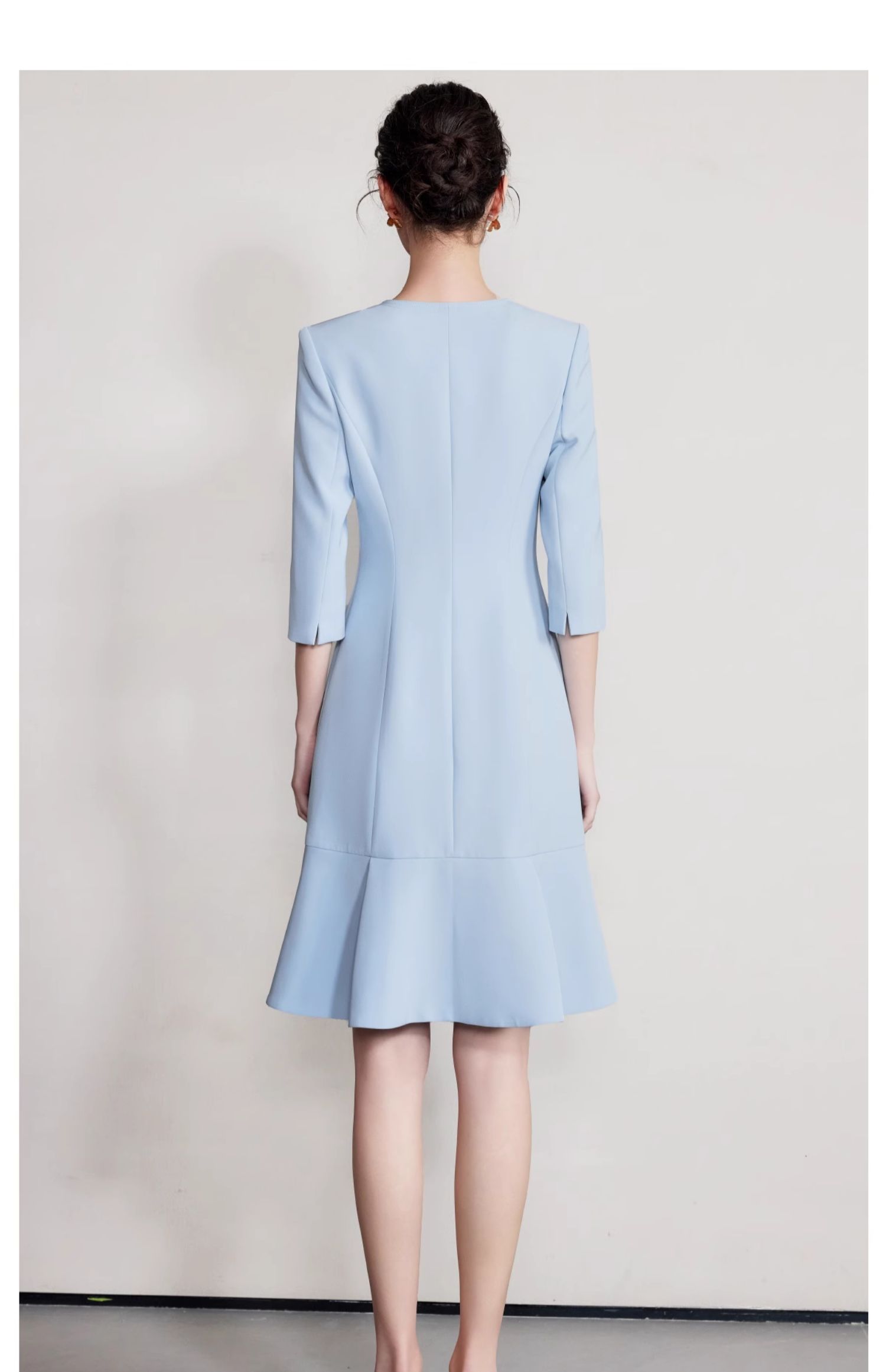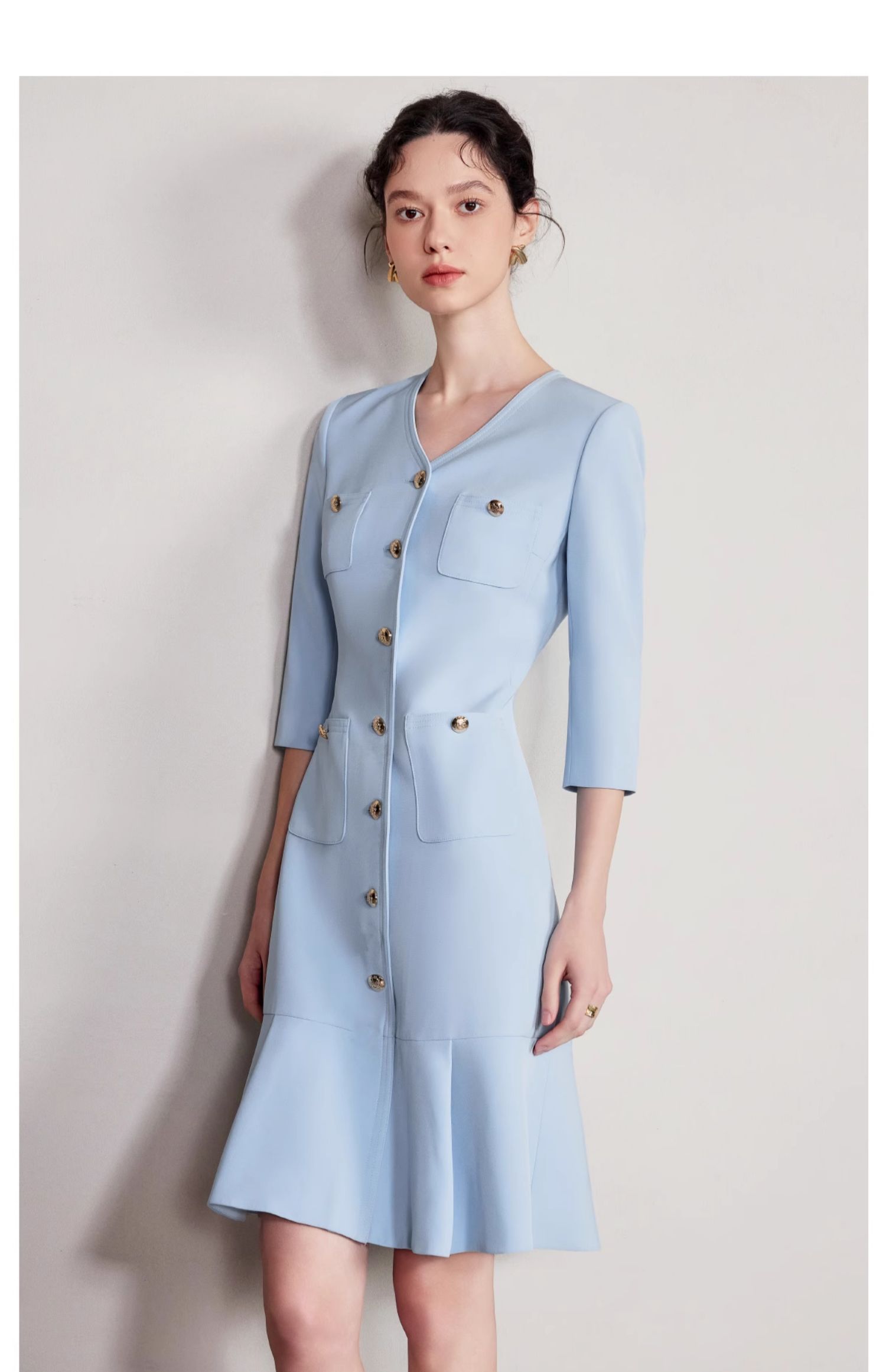 IWY/气质V领蓝色连衣裙女士职业装西服裙新款单排扣荷叶边裙子Q1269