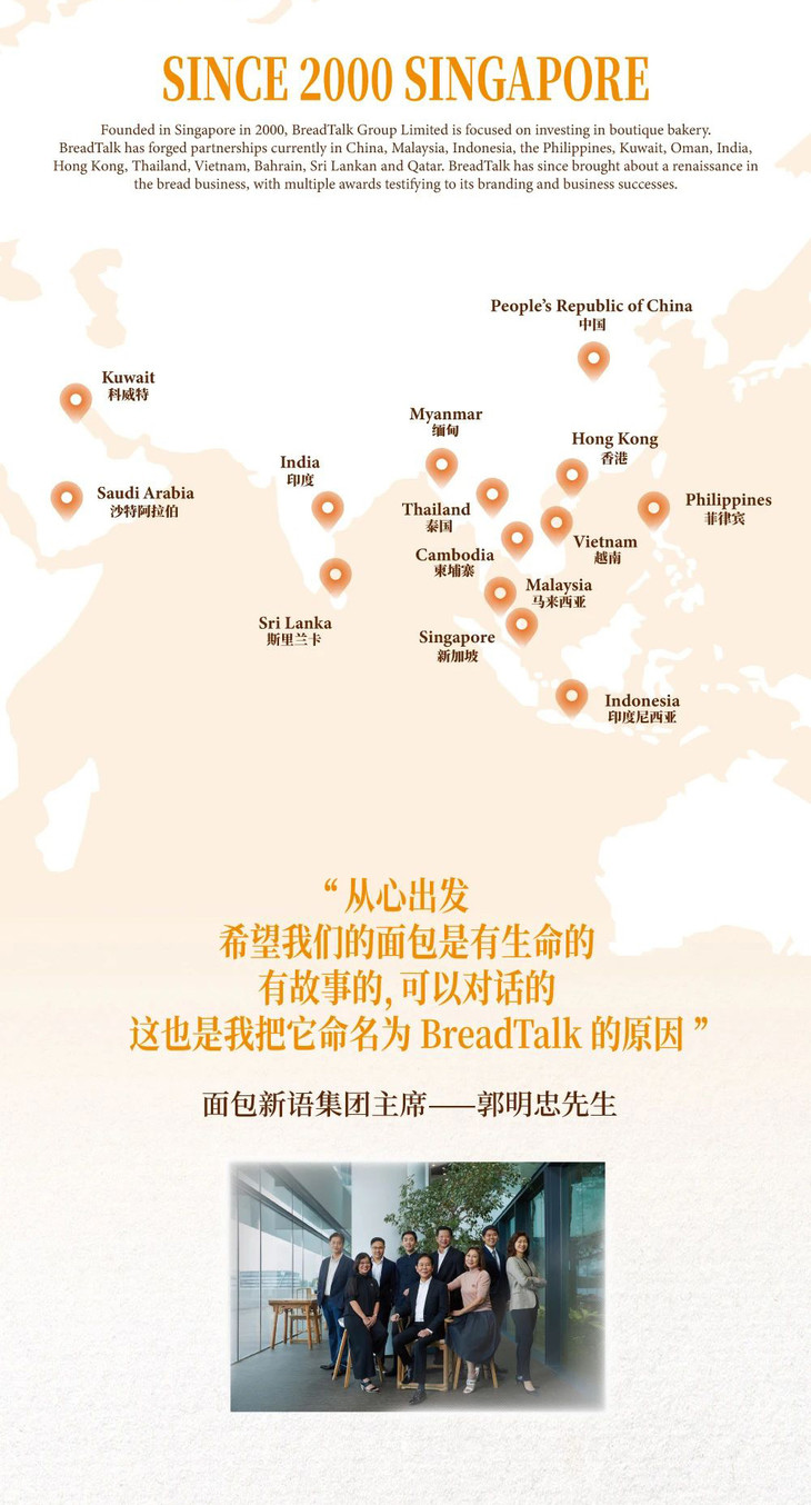 自新加坡起步,面包新语已成功将门店拓展至全球多个国家和地区 包括中国、中国香港、中国台湾、中东、东南亚、印度等,拥有数百家门店。 它不仅是消费者信赖的日常烘焙选择 更是大型商场、交通枢纽和繁华商业区的一道亮丽风景线 引领着现代烘焙消费的潮流