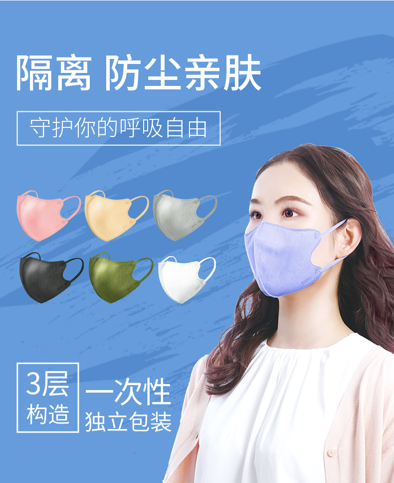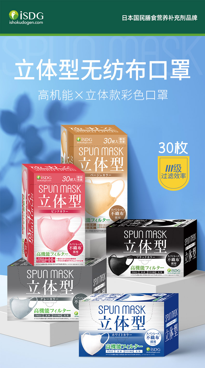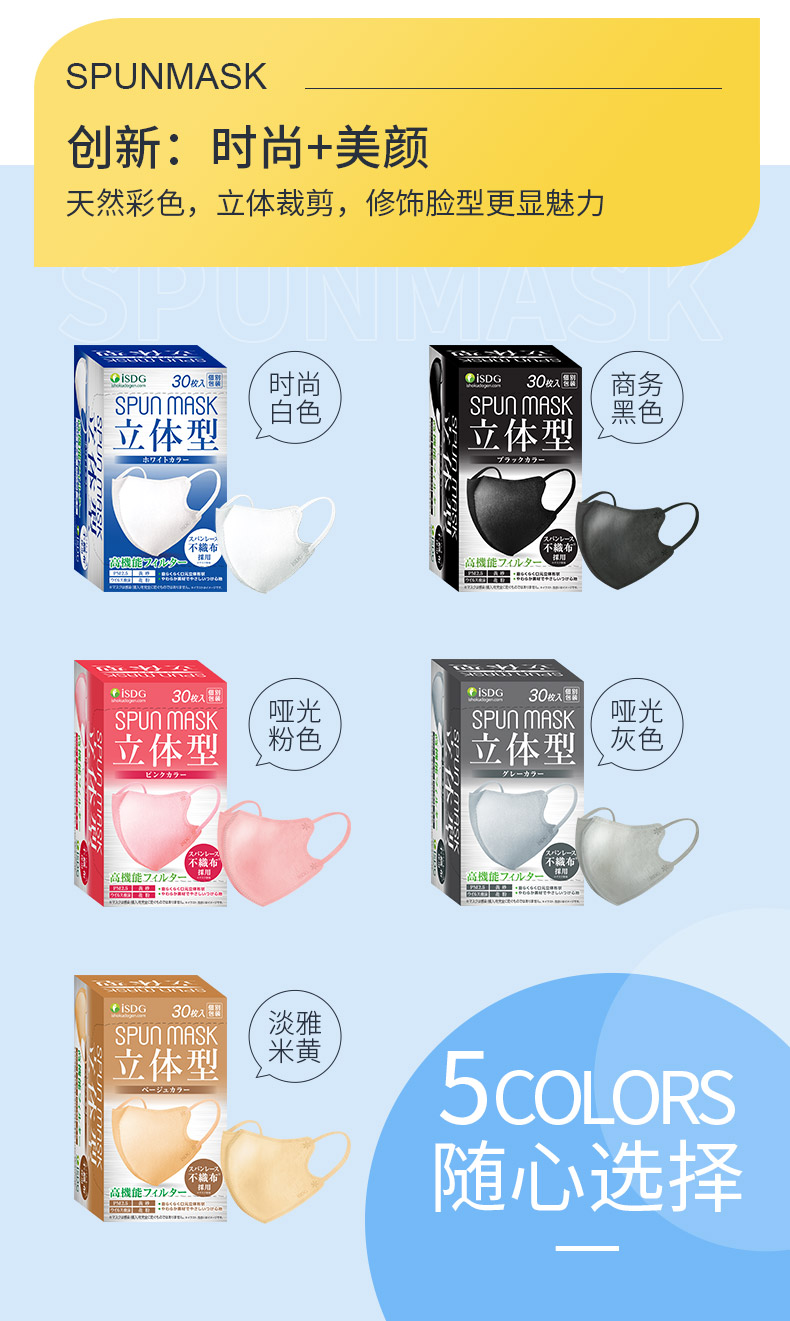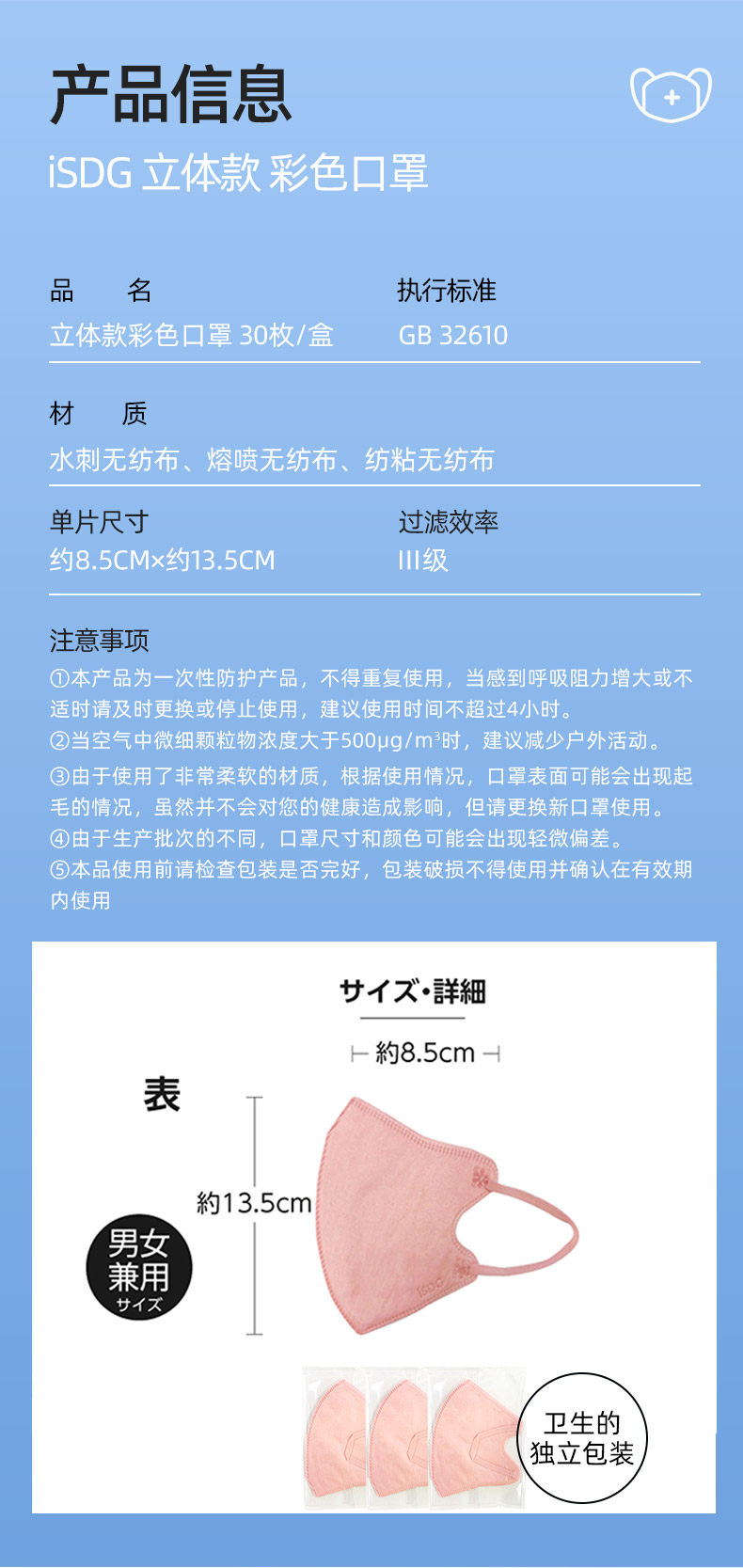 ISDG 日本品牌监制出口日本口罩 立体型彩色口罩 显脸小不勒耳 年轻时尚口罩30枚/盒独立包装