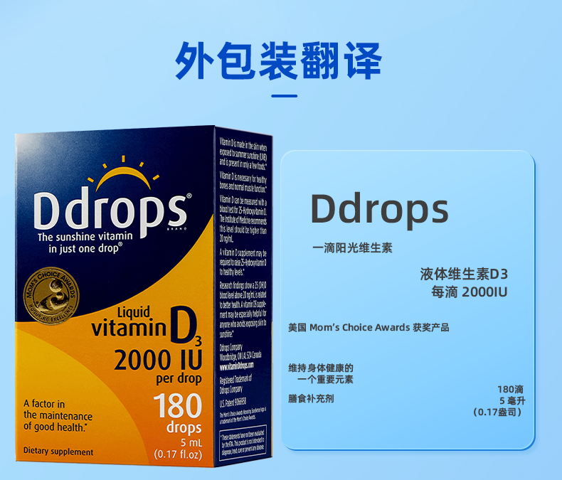Ddrops滴卓思成人维生素D3滴剂2000IU 5ml/瓶180滴DD小滴瓶 SC