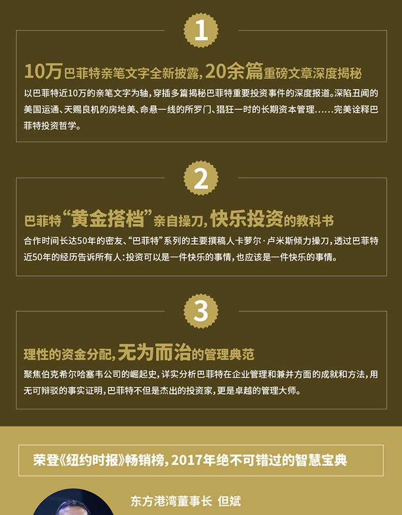 本书形式上以时间为线索,用巴菲特近10万的亲笔文字为轴,系统地剖析了通货膨胀、利率、企业利润、交易费用等要素对于股票投资的影响,厘清股票、股票指数期货、金融衍生品、债券、黄金等投资品种的优劣,提供了分析整个股市的完整框架。在这些体现思想精髓的文字之间,穿插多篇揭秘巴菲特重要投资事件的深度报道。深陷丑闻的美国运通、天赐良机的房地美、命悬一线的所罗门、猖狂一时的长期资本管理……它们完美地充当了诠释巴菲特投资哲学的实际案例。