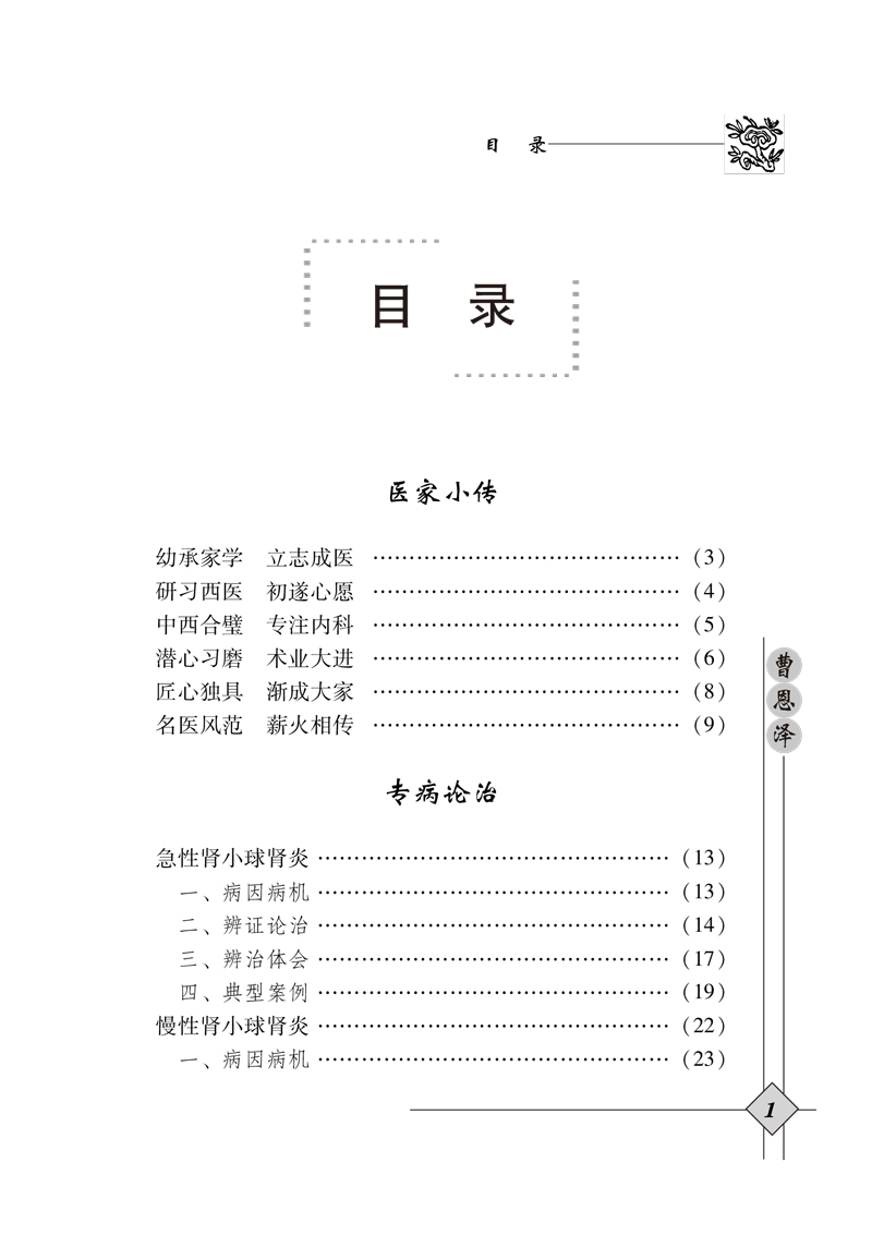 《曹恩泽》主要分4部分,即医家小传、专病论治、诊余漫话及年谱。医家小传主要介绍医家经历。着重介绍从医的经历及学术思想的形成过程;专病论治以中医的病证或西医的病名统医论、医话、医案几部分内容,以病统论,以论统案,以案统话,即把与某一病证相关的医论、医话、医案放在一起,使读者对这一病证的经验有清晰全面的了解,从不同侧面、不同角度了解这一病证辨证、治疗的独特经验;诊余漫话则主要是医家们的读书体会、用药心得等;年谱则按照时间顺序。将医家经历中具有重要意义的事件逐年逐月列出。