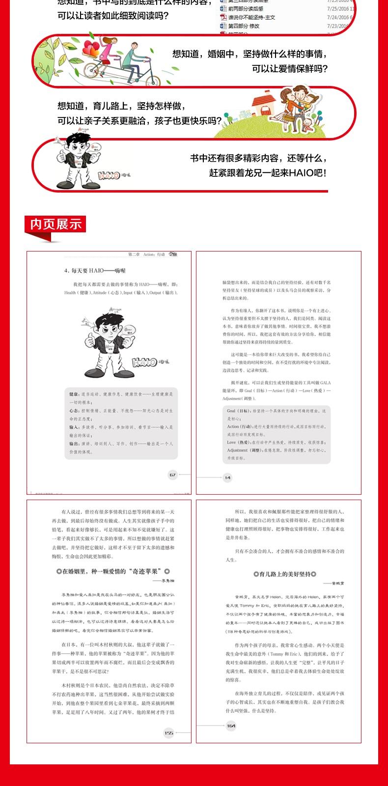 这可能是一本给你带来巨大改变的图书,可以帮你有效告别三分钟热度,让你真正找到一生热爱的事情,并持之以恒地快乐坚持。本书不仅仅是一本个人成长书,还有健康的生活方式,可以让你的生活充满活力;这里有巧妙的心理学运用,可以让你的心态越来越好;这里有润物细无声的爱情滋养剂,可以让你的夫妻关系更和谐;这里有育儿路上的美好坚持方法,可以让你的亲子关系更融洽…….本书不仅仅有方法论――GALA能量环,还有行动指导,而且有很多来自身边人的真实故事,很重要的是简单、接地气、易吸收,可以让你行动起来,并坚持,进而产生量到质的改变,在提升个人能力的同时,全方面提高你的幸福指数。这是一本能帮助你养成.人生中很好习惯、优选品质?――""坚持”的好书。"
