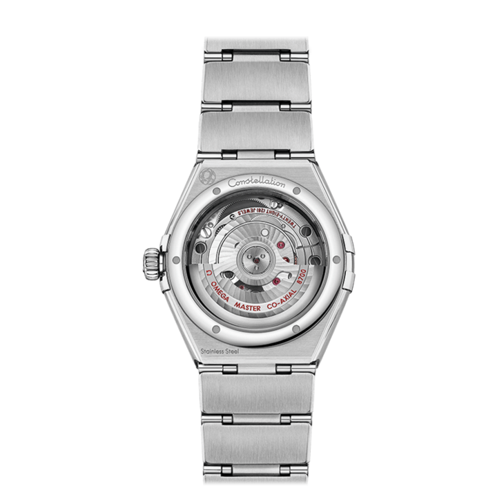 镜面材质 | 蓝宝石水晶玻璃 | 表盘 | 精钢表壳、表圈,星座系列特有的“托爪”设计。 表圈镌刻罗马数字刻度,珍珠母贝表盘珠光闪耀,6点钟位置设有日历窗口。指针、欧米茄品牌标识、星座徽标以及小时刻度以白色18K金打造而成。 透底 |