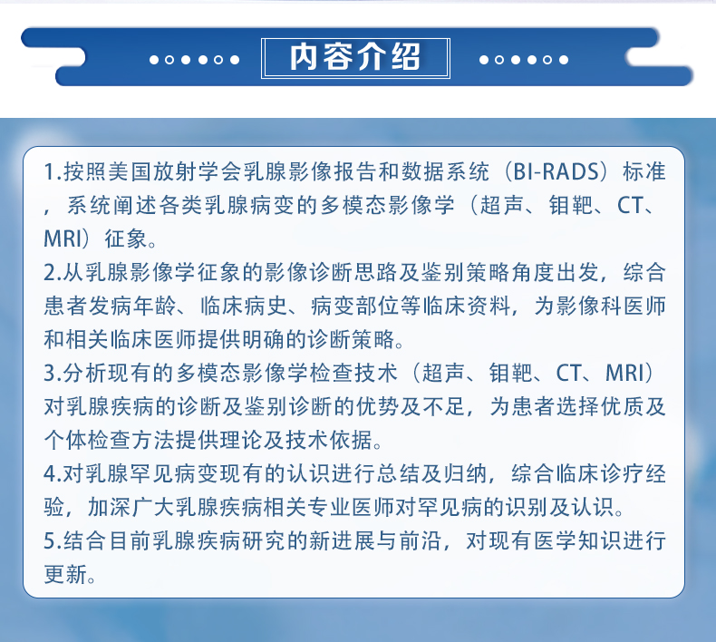 1.按照美国放射学会乳腺影像报告和数据系统(BI-RADS)标准,系统阐述各类乳腺病变的多模态影像学(超声、钼靶、CT、MRI)征象。 2.从乳腺影像学征象的影像诊断思路及鉴别策略角度出发,综合患者发病年龄、临床病史、病变部位等临床资料,为影像科医师和相关临床医师提供明确的诊断策略。 3.分析现有的多模态影像学检查技术(超声、钼靶、CT、MRI)对乳腺疾病的诊断及鉴别诊断的优势及不足,为患者选择优质及个体检查方法提供理论及技术依据。 4.对乳腺罕见病变现有的认识进行总结及归纳,综合临床诊疗经验,加深广大乳腺疾病相关专业医师对罕见病的识别及认识。 5.结合目前乳腺疾病研究的新进展与前沿,对现有医学知识进行更新。