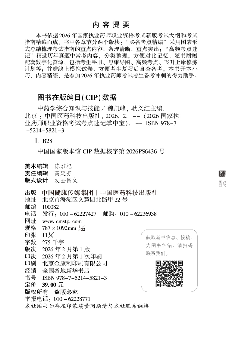 书名:2026国家执业药师职业资格考试考点速记掌中宝 中药学综合知识与技能