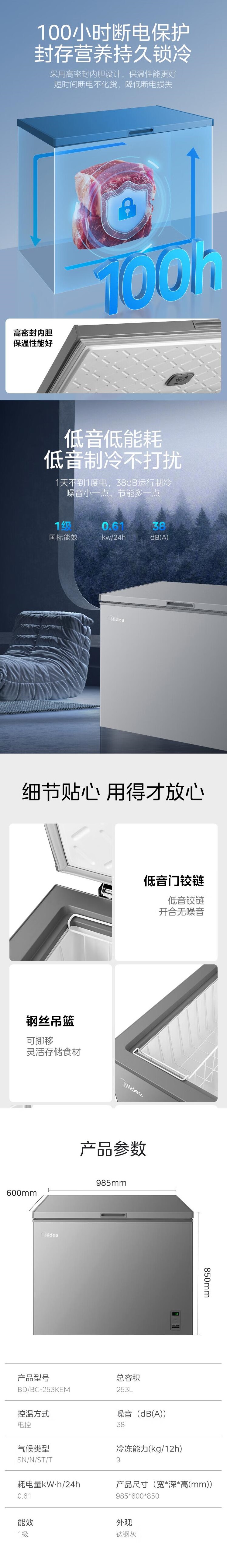 美的(Midea)(202747 )253升卧式冰柜冷柜一级能效节能低霜内胆冷藏冷冻转换精准全域控温BD/BC-253KEM