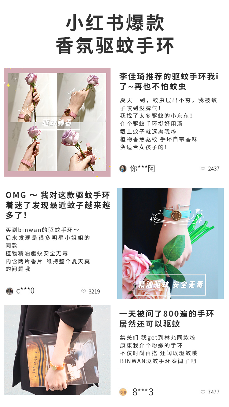 手环内安放驱蚊香片,淡淡的花香很好闻,是用纯植物安全配方,萃取柠檬香茅作为驱蚊的主原料,和薄荷、铃兰、薰衣草、郁金香等提取的精油科学搭配,通过这些植物精油散发的味道来遮盖掉人体气味,使蚊虫远离。并且无避蚊胺等有害物质添加,味道也很好闻,一点都不会刺鼻,完全可以放心使用!