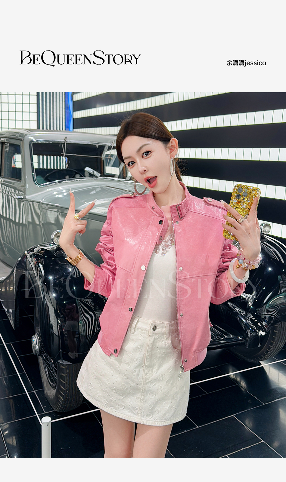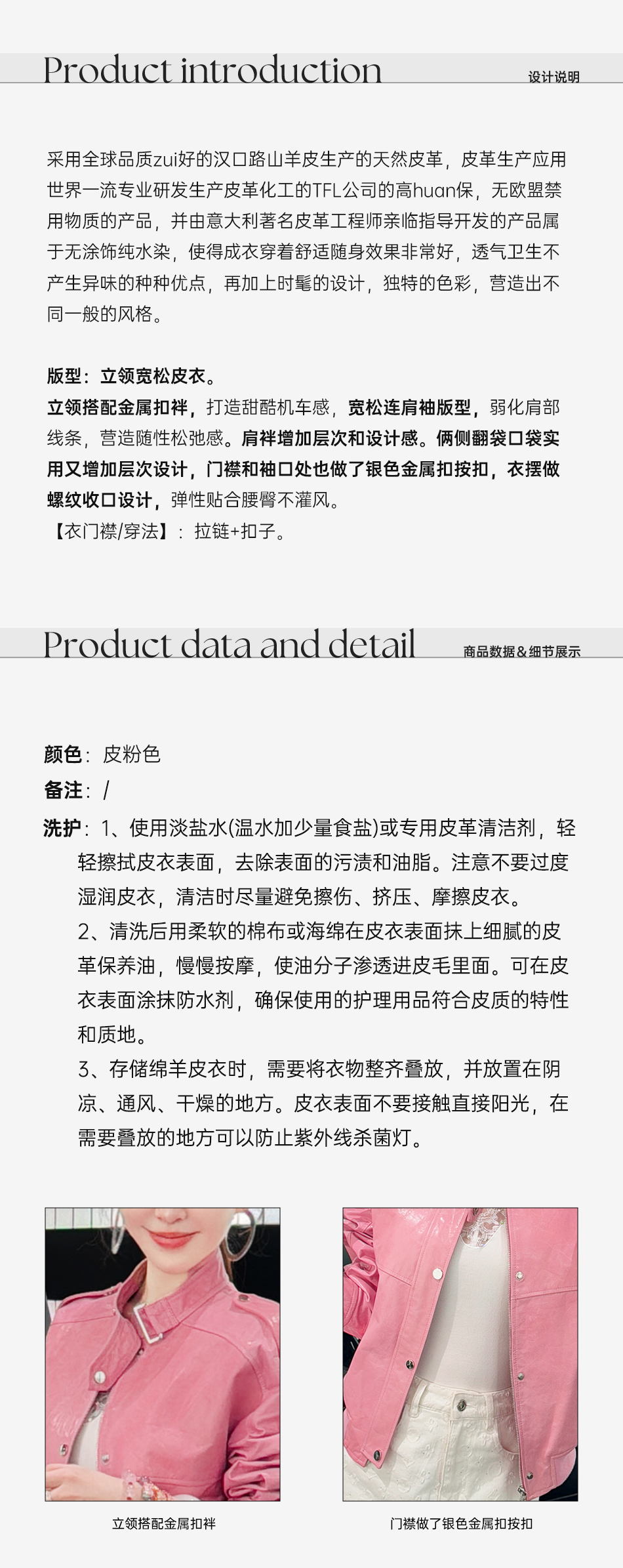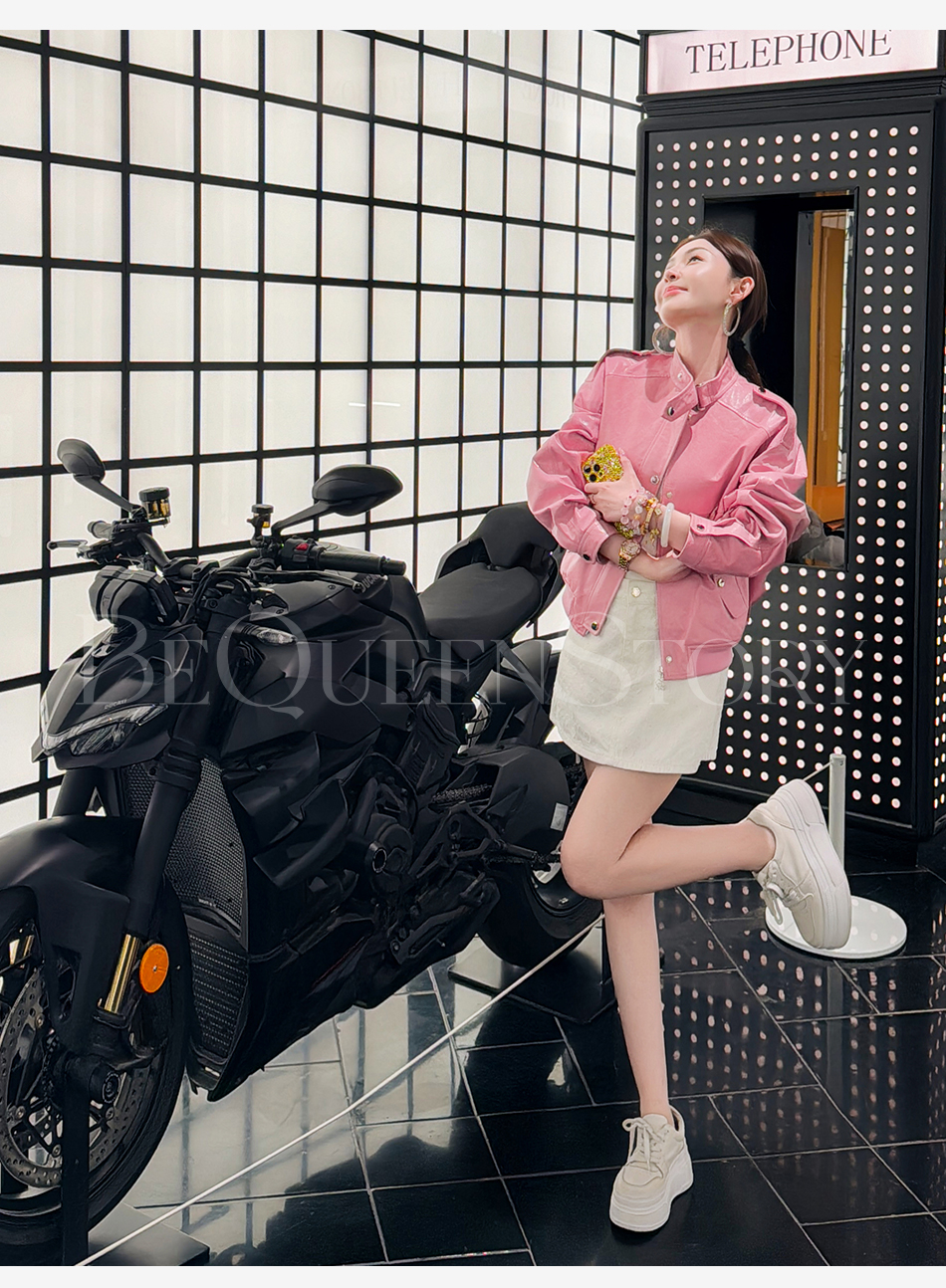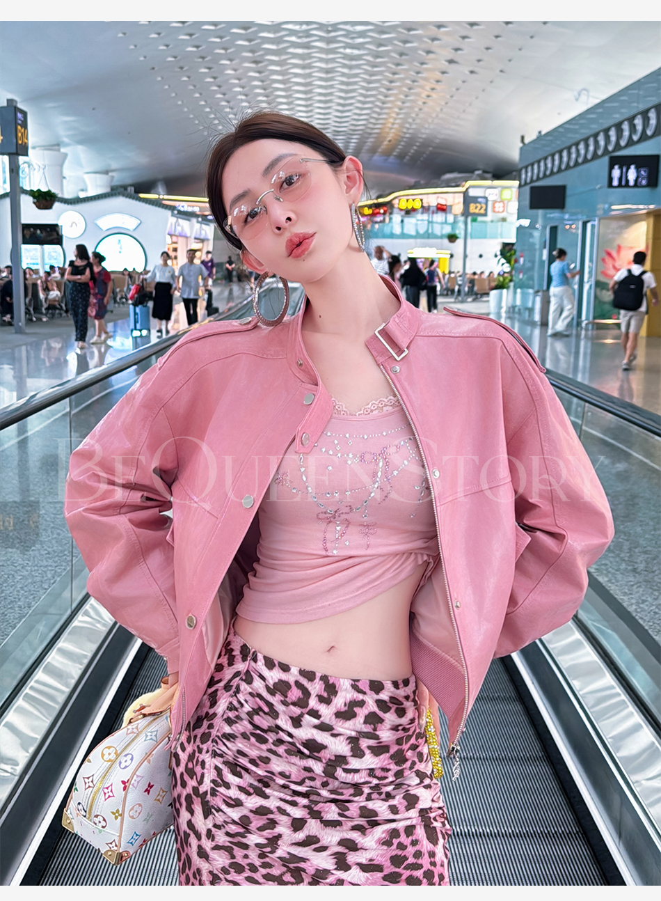 余潇潇【甜酷机车】天然山羊皮革复古时尚立领宽松皮衣2025早秋