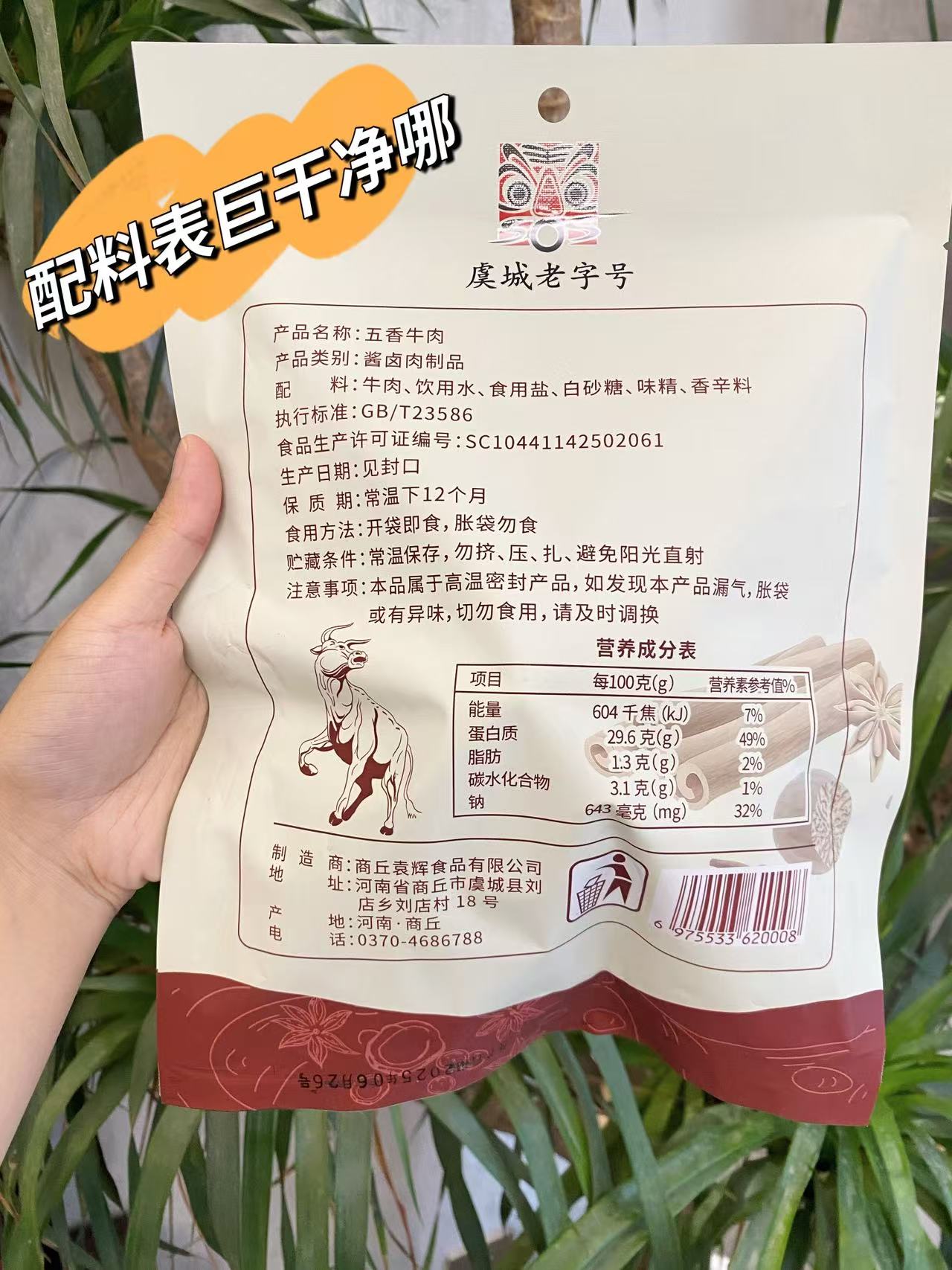 【产品配料】牛肉、饮用水、食用盐、白砂糖、味精、香辛料