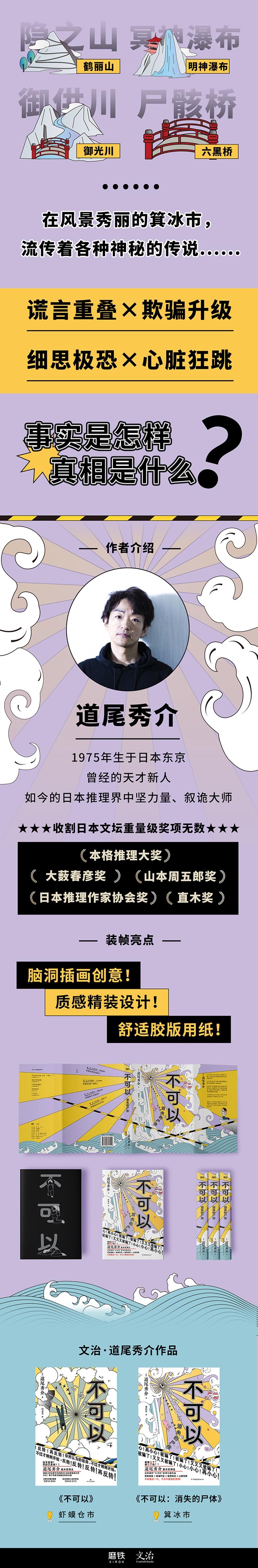 "★日本百万销量、获奖无数的推理大师道尾秀介全新叙诡力作!靠前的推理小说阅读体验! 本书使用方法:仔细阅读每一个字!用心观察每张照片!不好意思,你还得从头到尾再读一遍! ★系列作日本销售数据超越伊坂幸太郎、东野圭吾,《不可以》国内销量超10万册! 火爆日本!引发话题!两大推理权威奖项——周刊文春推理BEST 10、这本推理小说好想读BEST10力压东野圭吾、宫部美雪...... ★谎言重叠×欺骗升级!随书附赠道尾秀介“温馨提示”to中国读者独家印签 谁被杀了?谁杀了他?在山清水秀的箕冰市,民风淳朴却遍地尸体?!你能找到线索吗?你能揭开真相吗? ★细思极恐×心脏狂跳!百万悬疑推理博主@小玄夜说书长视频解读《不可以》,狂赞推荐!"