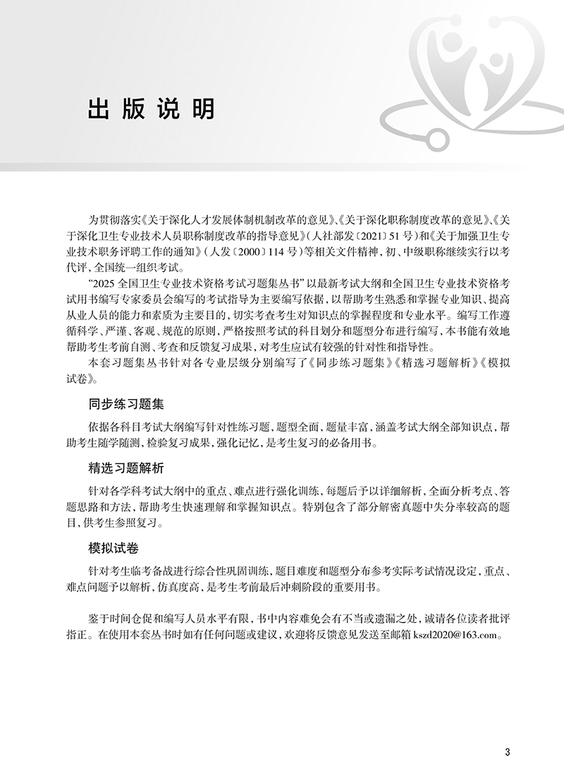 本套习题集是全国卫生专业技术资格考试专家委员会编写的推荐用书。《2025全国卫生专业技术资格考试习题集丛书》以最新考试大纲和全国卫生专业技术资格考试用书编写专家委员会编写的考试指导为依据,编写工作遵循科学、严谨、客观、规范的原则,严格按照实际考试的科目划分和题型分布进行编写,切实考查考生对知识点的掌握程度和专业水平,本套习题集丛书包括《同步练习题集》、《精选习题集》和《模拟试卷》,能够有效帮助考生考前复习、自测和反馈学习成果。精选习题解析针对各学科考试大纲中的重点难点进行强化训练,每题后附详细解析,全面分析考点、答题思路和方法,帮助考生尽快理解和掌握知识点。特别包含了部分解密真题中失分率较高的题目,供考生参照复习。