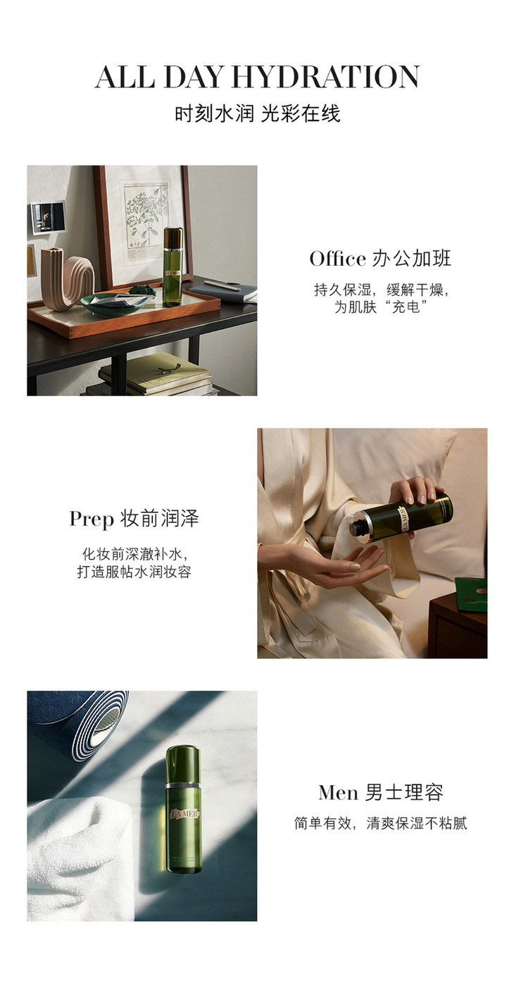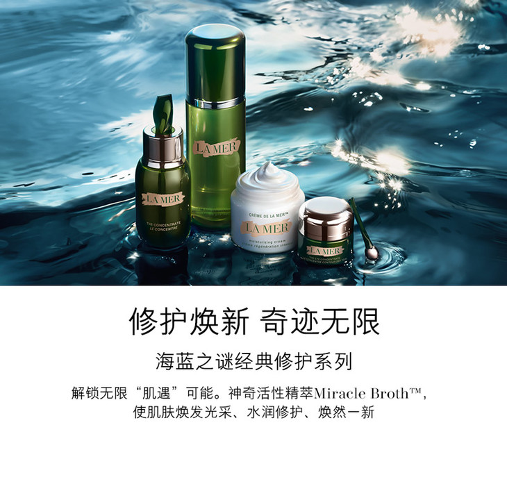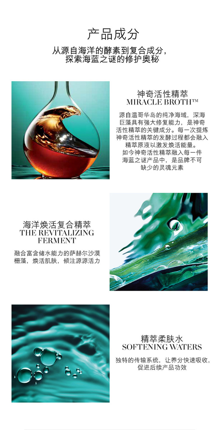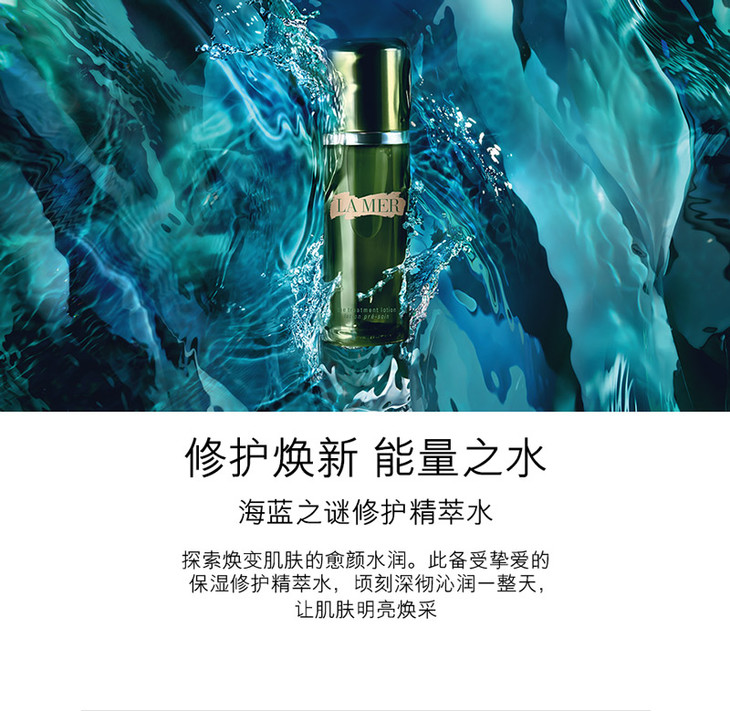 洁面后,以指尖或化妆棉取适量精萃水。轻轻拍于肌肤。然后涂抹海蓝之谜精华和经典精华面霜系列产品。