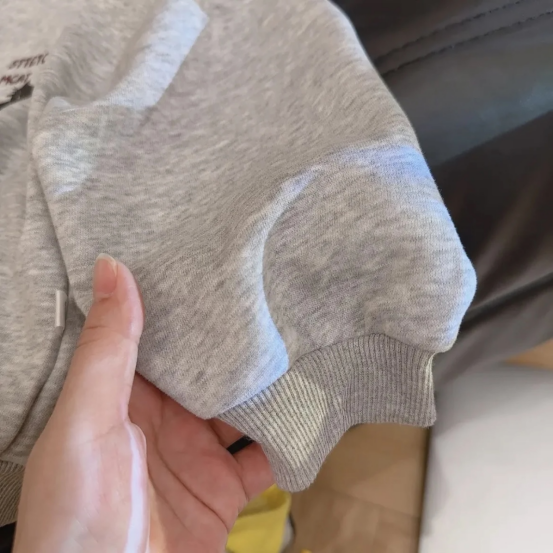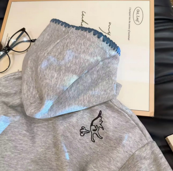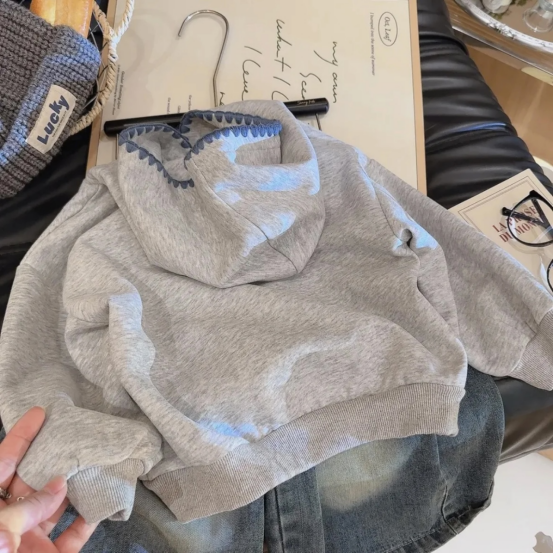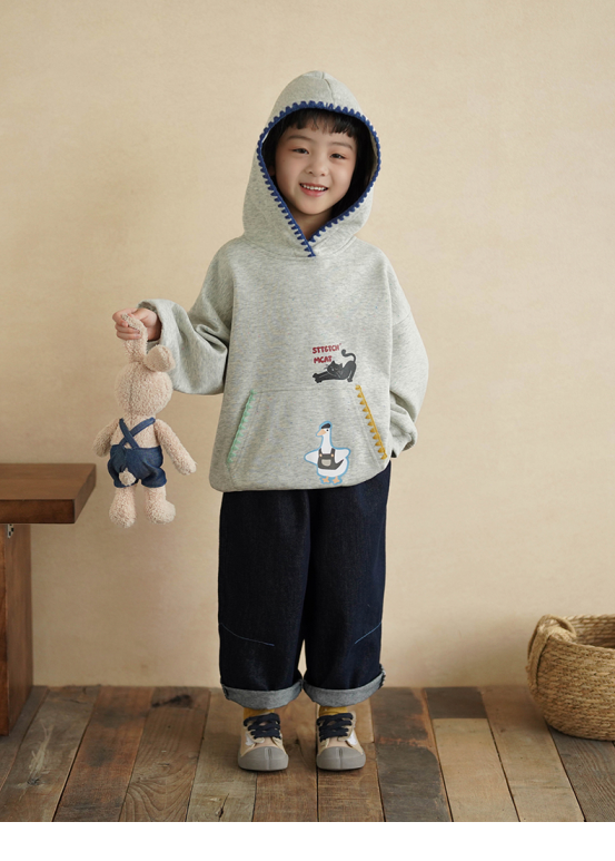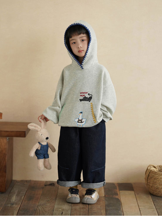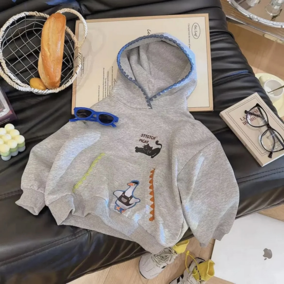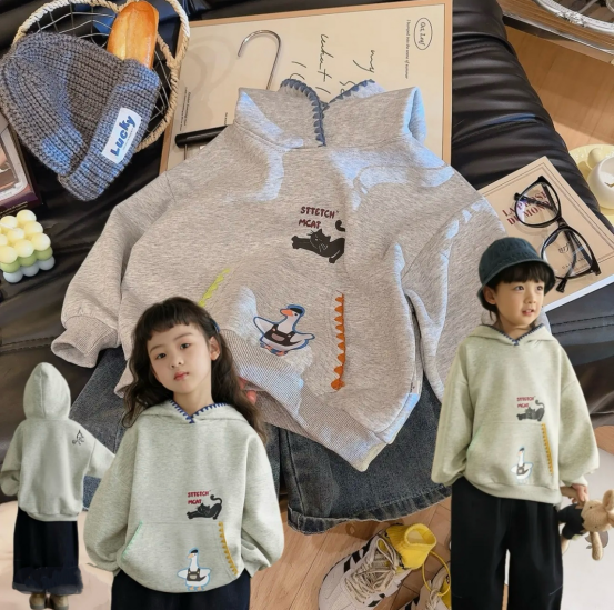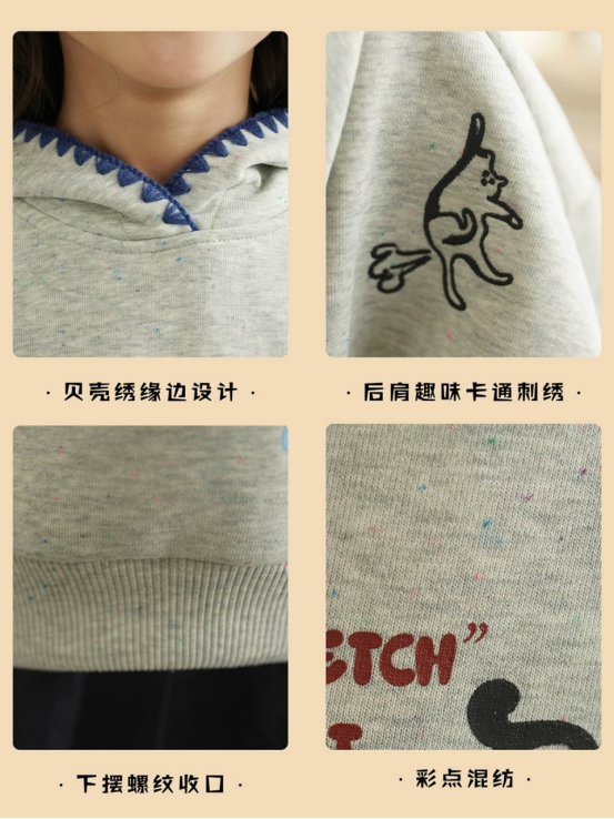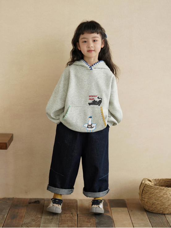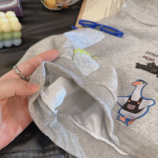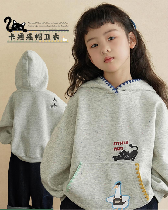 谁能拒绝一件软乎乎又充满童趣的连帽卫衣呢🥰 浅灰色的主调,温柔又百搭~ 帽檐的蓝色缝线,像给小帽子围了圈 “彩虹边”🌈 胸前还有小猫和大白鹅的可爱图案,仿佛在演绎一场童真小剧场🎭 大口袋设计超贴心,娃可以把小玩具、小零食统统装进去~