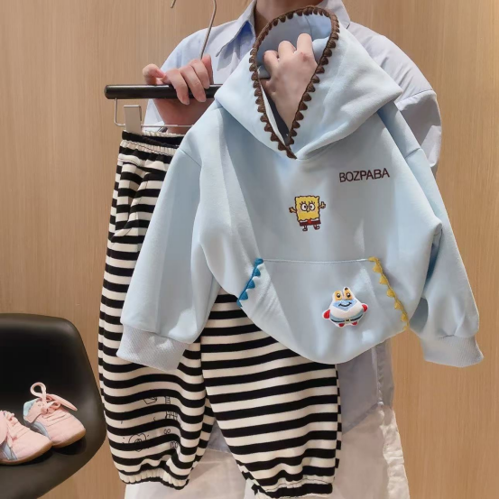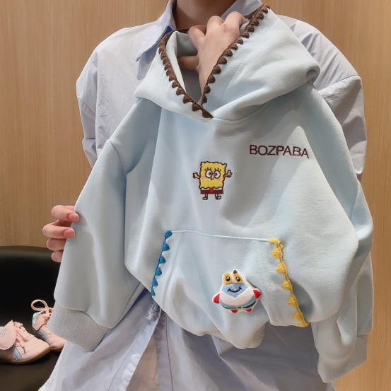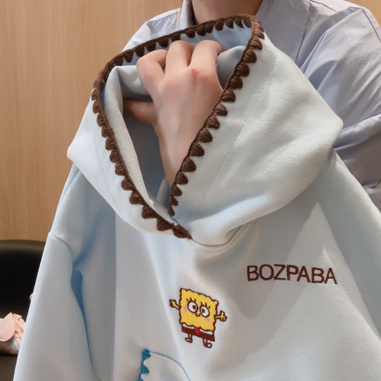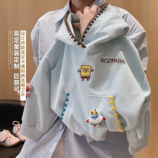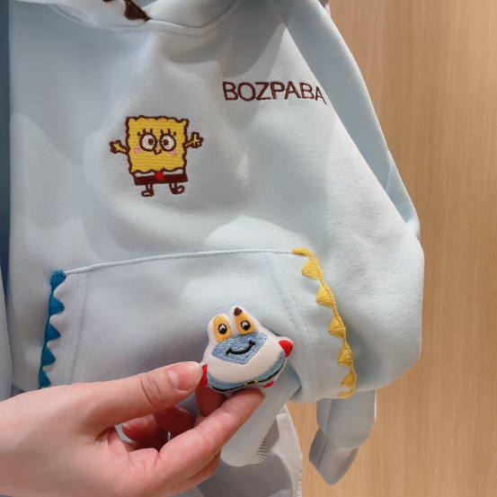 谁能拒绝海绵宝宝元素的童装呢~💛 清新浅蓝色超显白,连帽设计俏皮又保暖