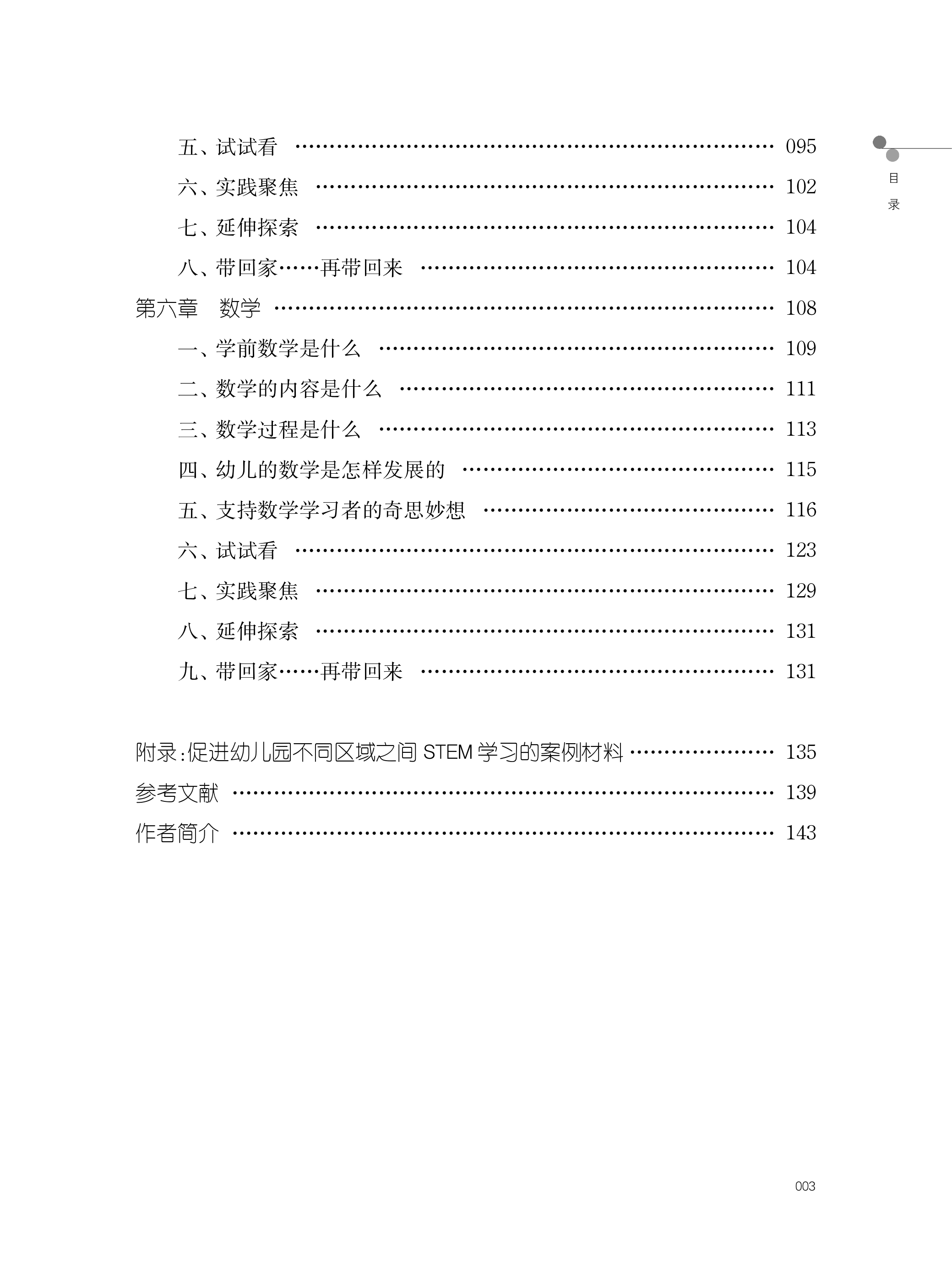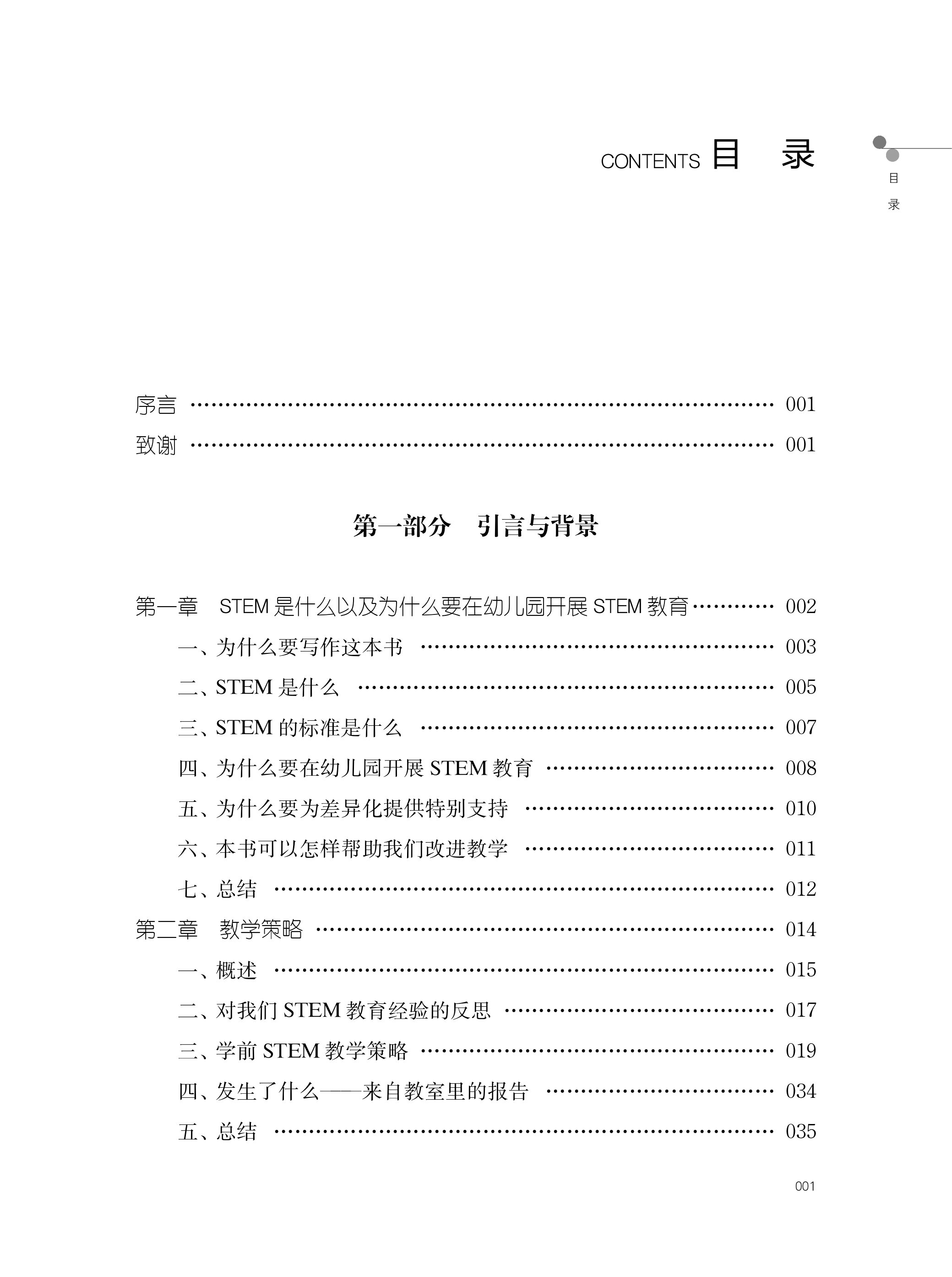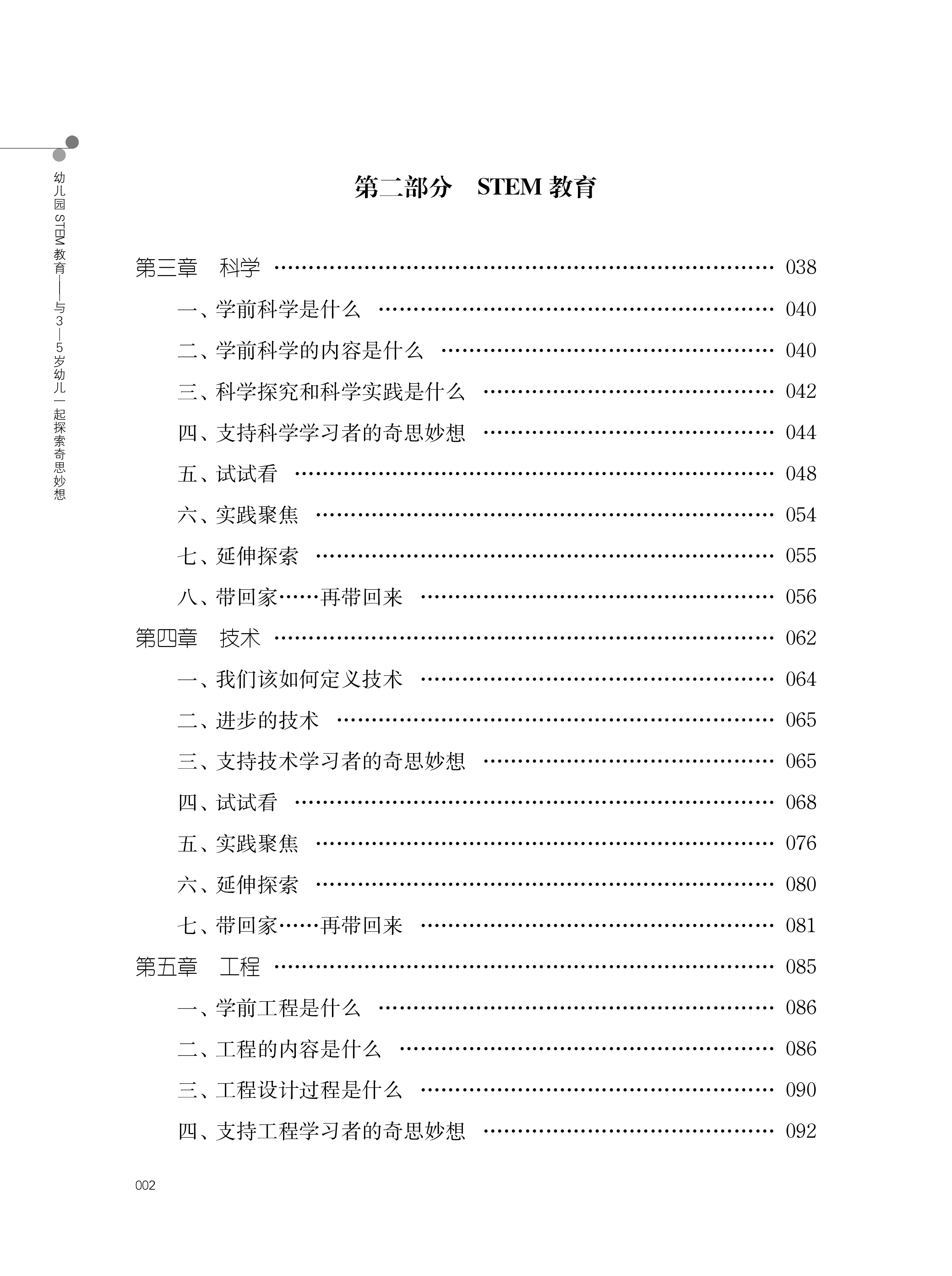 STEM教育在我国起步较晚,在学前阶段开展得更迟,但它对儿童的思维发展、想象力开发、科学探究精神和创造创新意识的启蒙非常重要。译者吴媛媛,是南京师范大学学前教育学博士、抗日战争研究中心中国史博士后,现任北京联合大学师范学院讲师。本书的引进无疑是对这块空白的有效填补和良好借鉴。本书最大的亮点是内容深入浅出,易于幼教工作者理解和把握。第一部分把“STEM”是什么、为什么要在幼儿园开展STEM教育、STEM教学策略等阐释得非常明白。第二部分将科学、技术、工程和数学分别单独成章,从概念到实践到反思,以及活动拓展、家园互动、资料链接和分享,通过实例全方位地向读者展示整个经验及过程,手把手指导幼教工作者如何开展学前STEM教育。