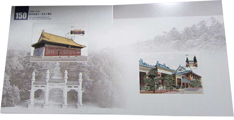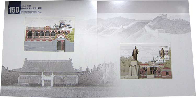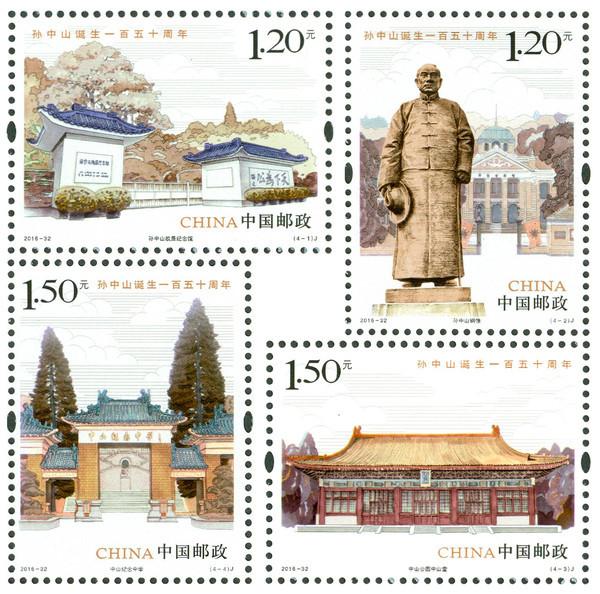 2016年11月12日是中国民主革命的伟大先驱孙中山先生诞生150周年纪念日。为缅怀孙中山先生为民族独立、社会进步、人民幸福所建立的历史功勋,学习、继承和发扬孙中山先生的爱国思想、革命意志和进取精神,中国邮政于2016年11月12日发行了《孙中山诞生一百五十周年》纪念邮票一套。内容分别为:孙中山故居纪念馆、孙中山铜像、中山公园中山堂、中山纪念中学。