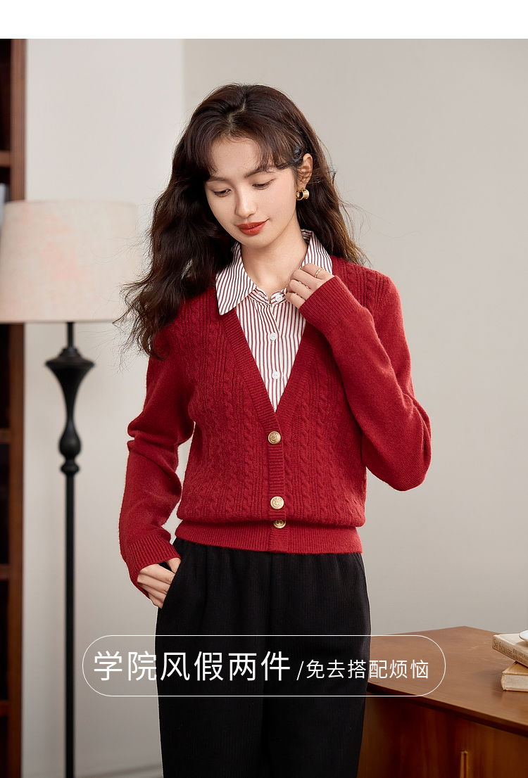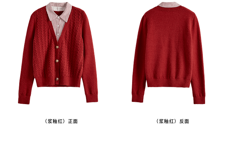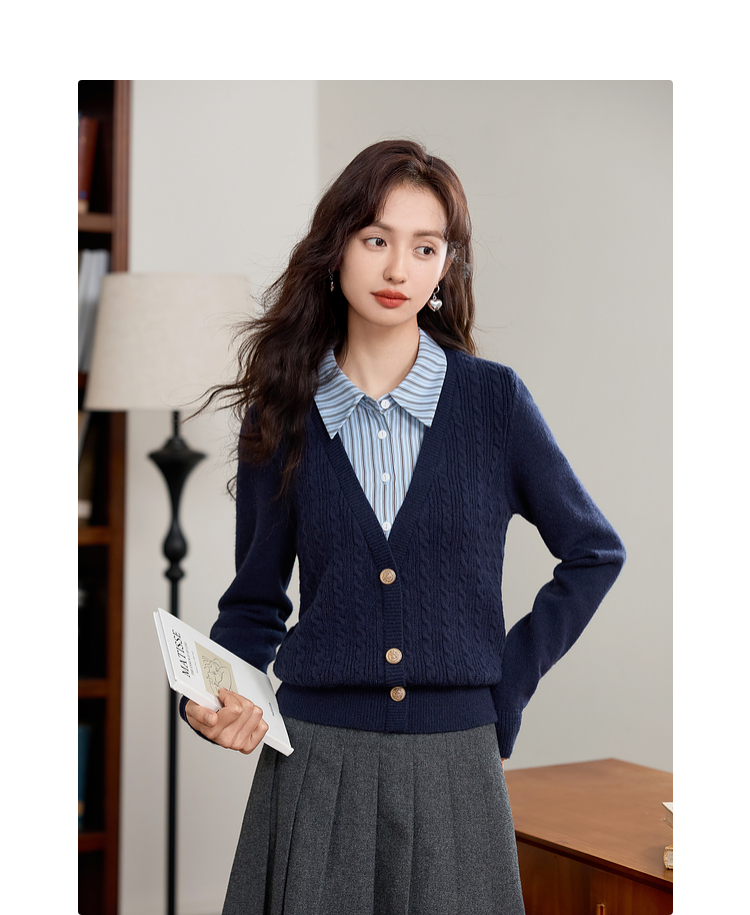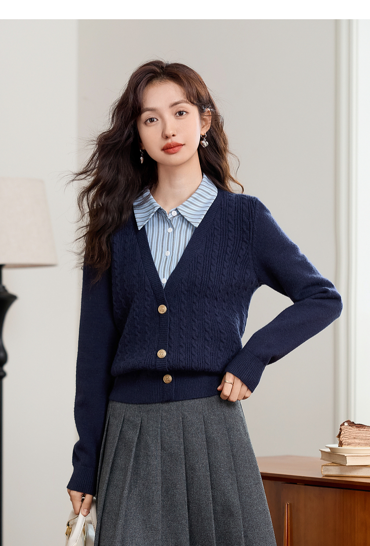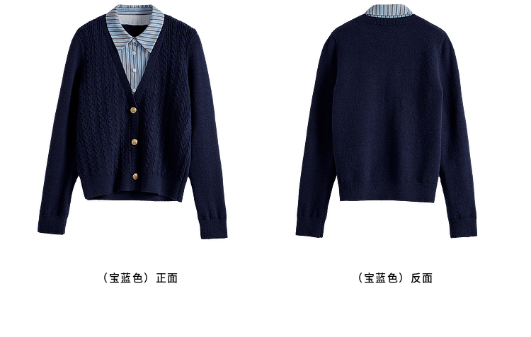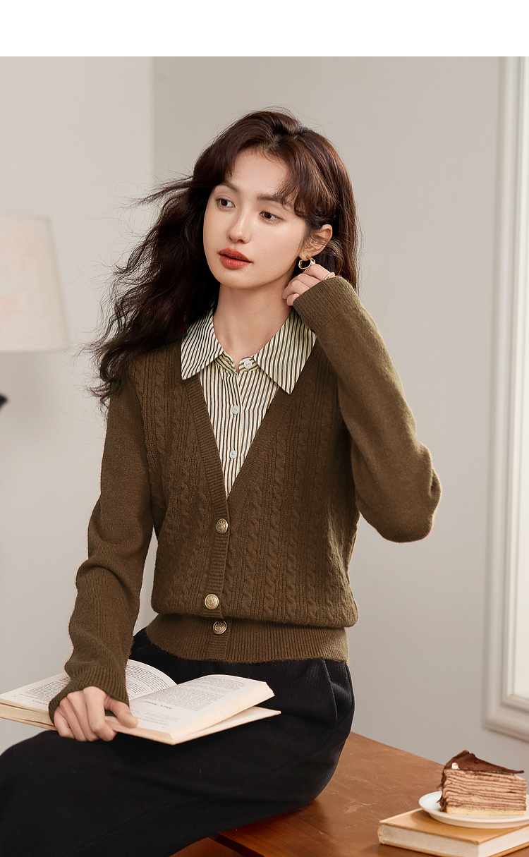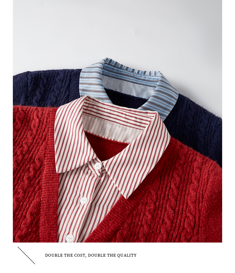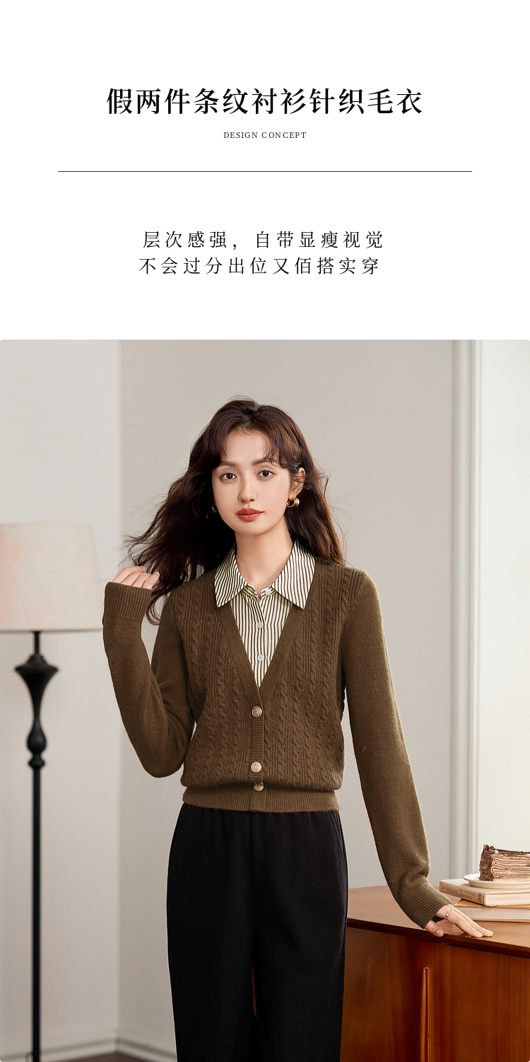 【年终特卖】熙世界秋冬款别致学院风条纹衬衫领假两件绞花针织衫毛衣