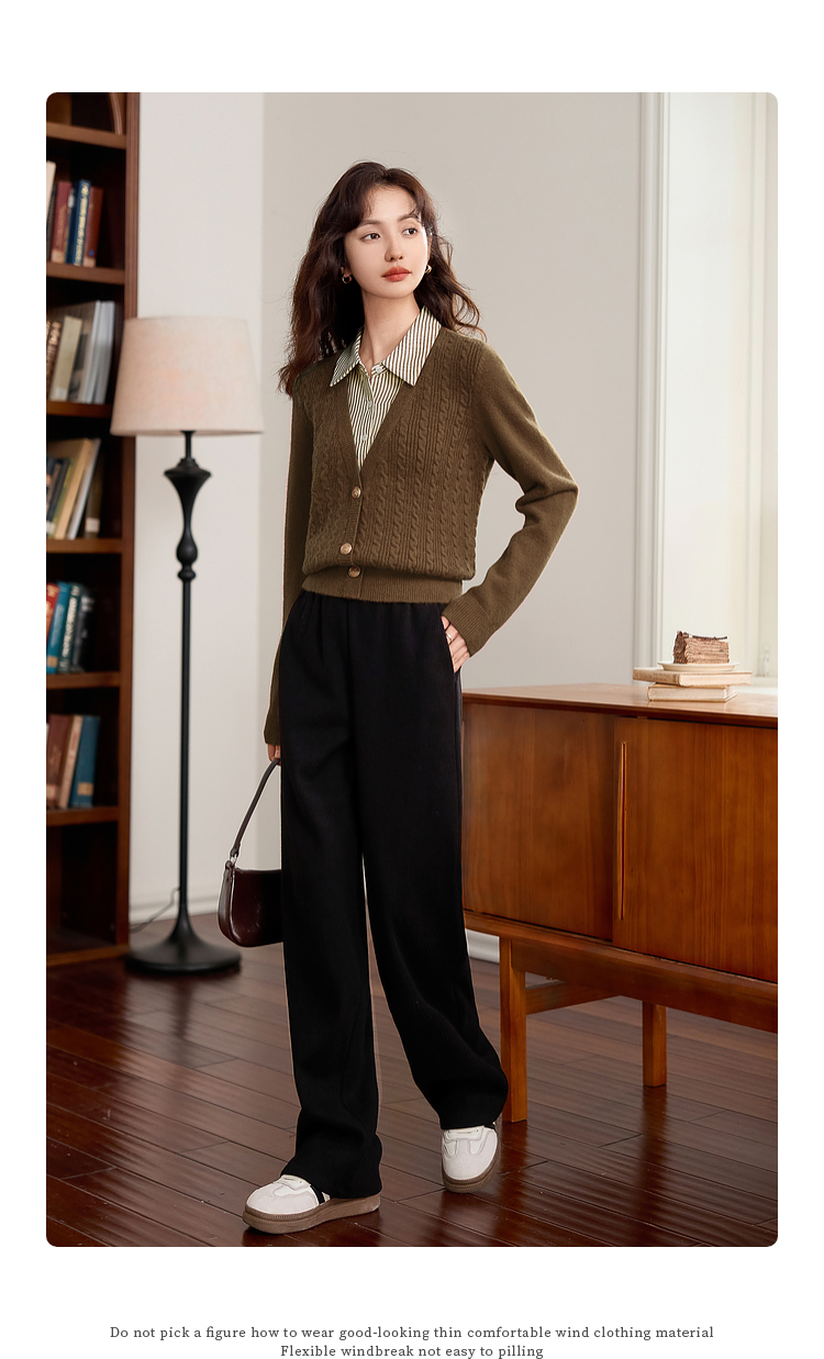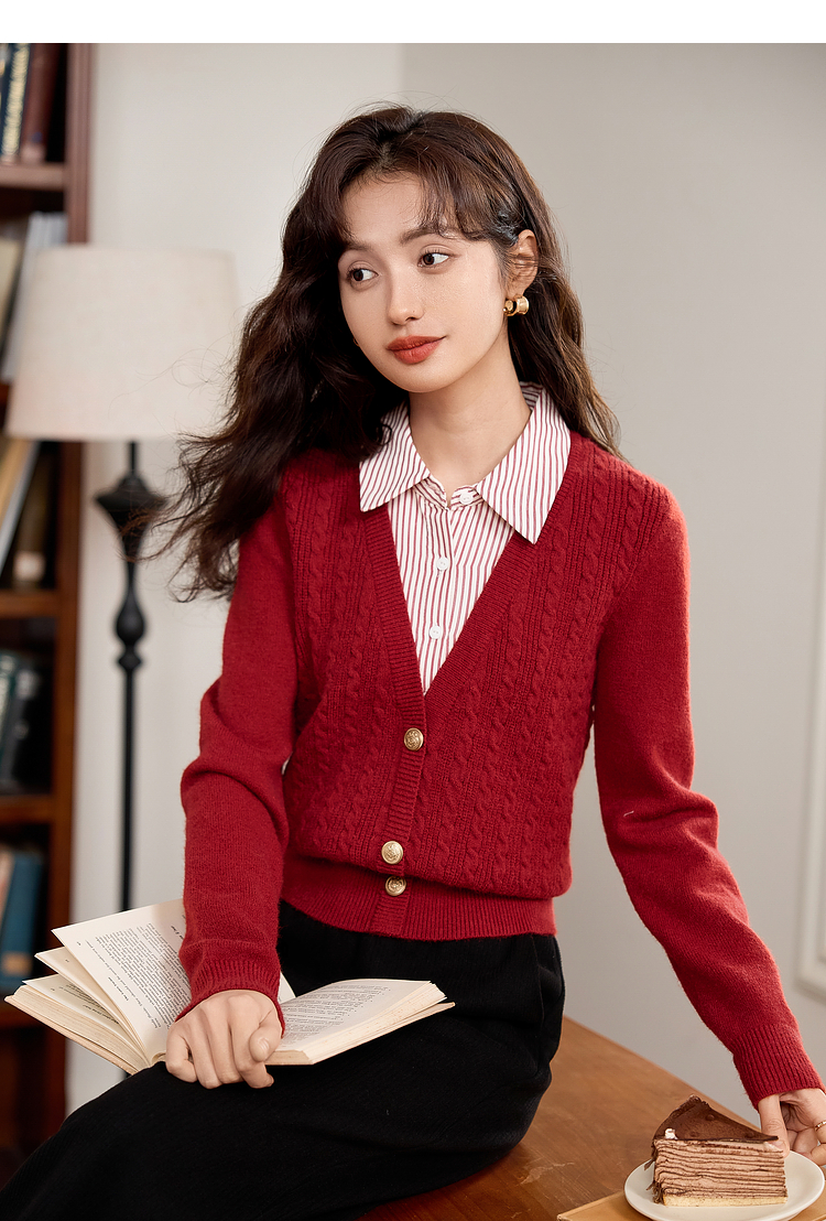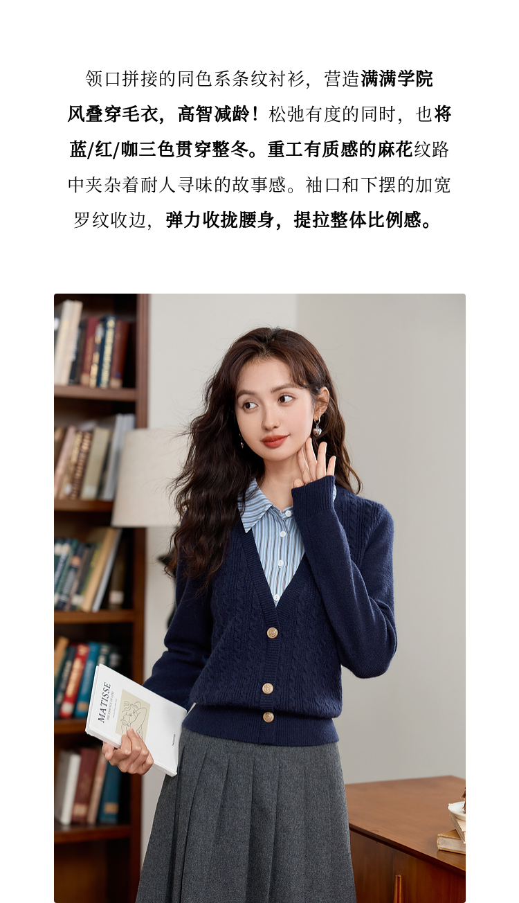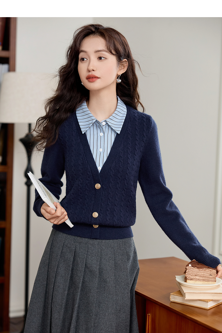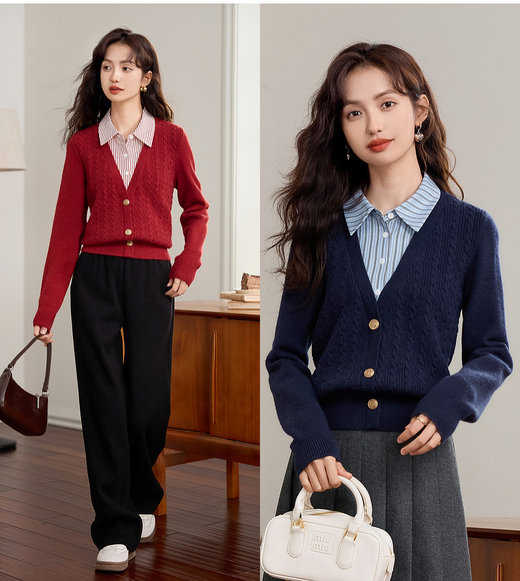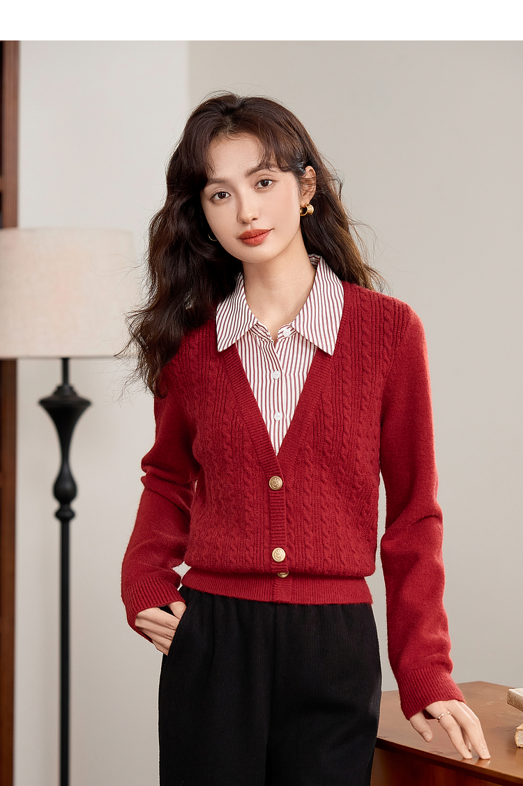 【年终特卖】熙世界秋冬款别致学院风条纹衬衫领假两件绞花针织衫毛衣