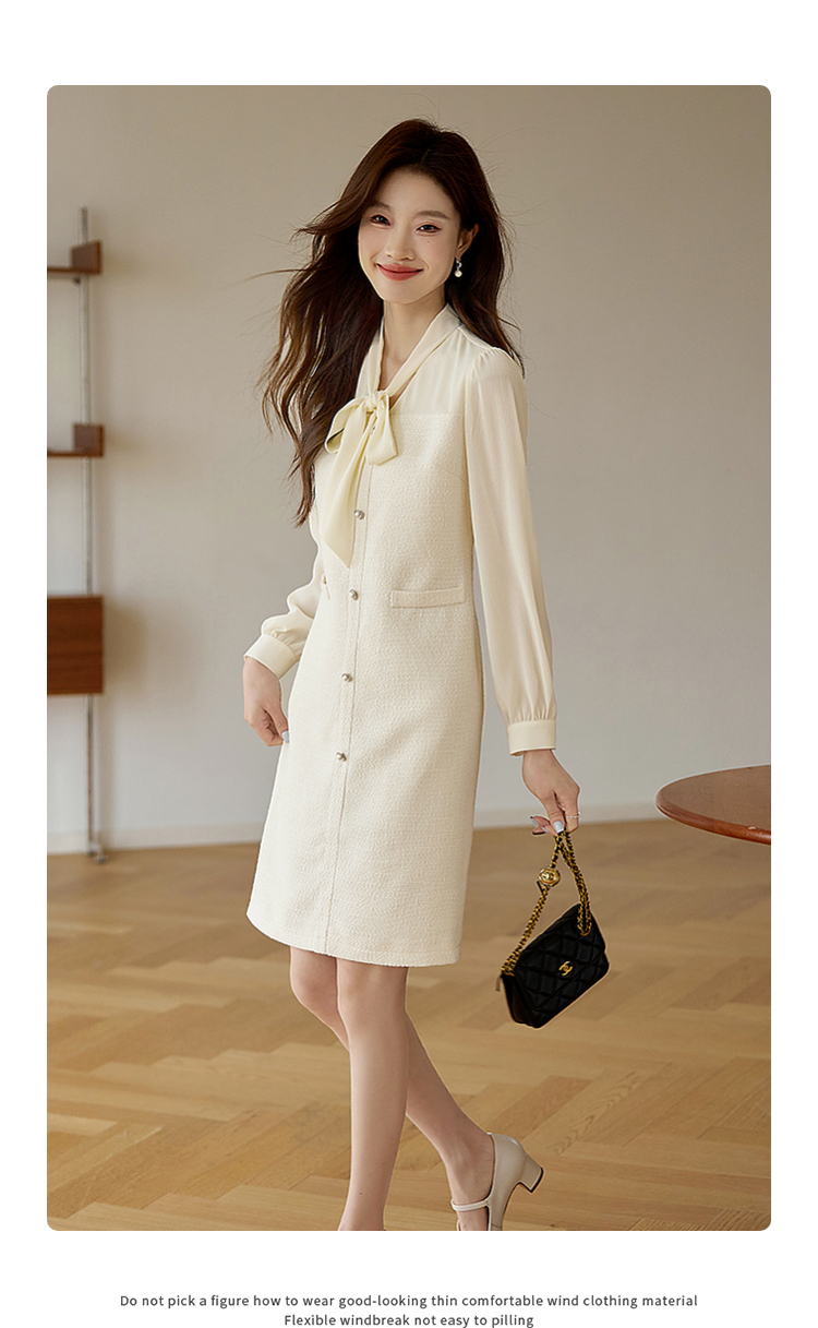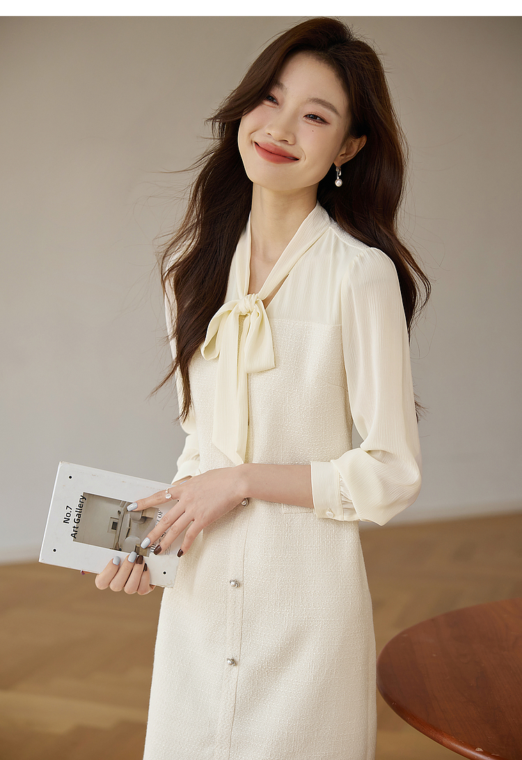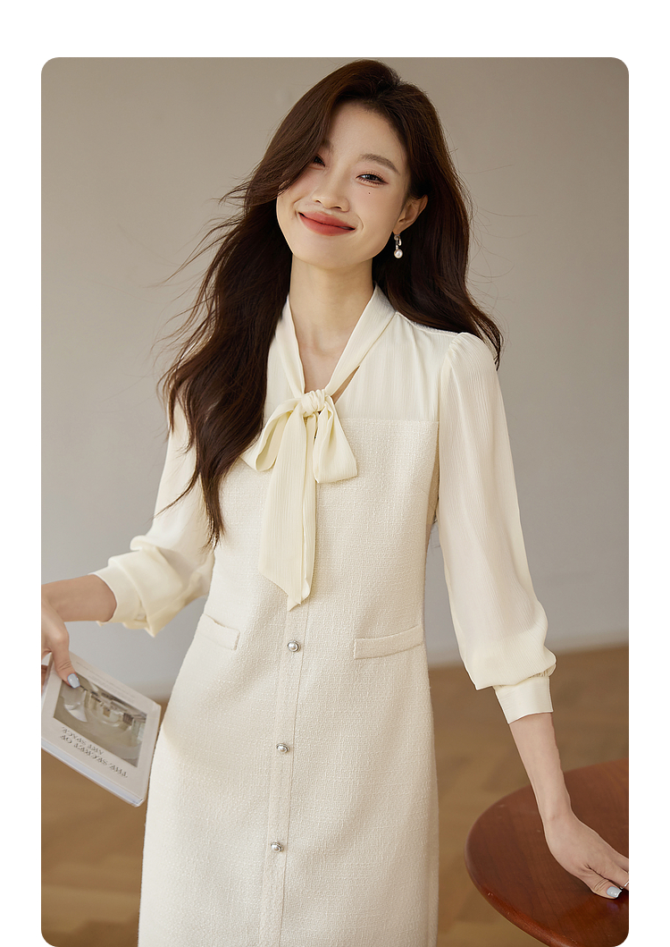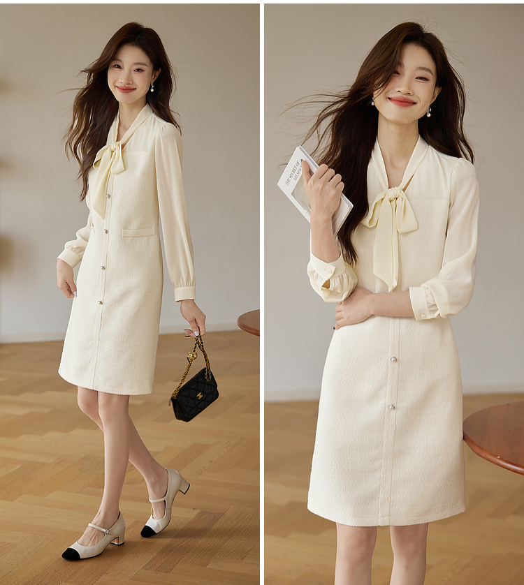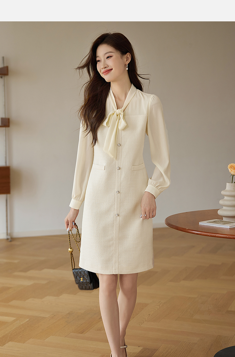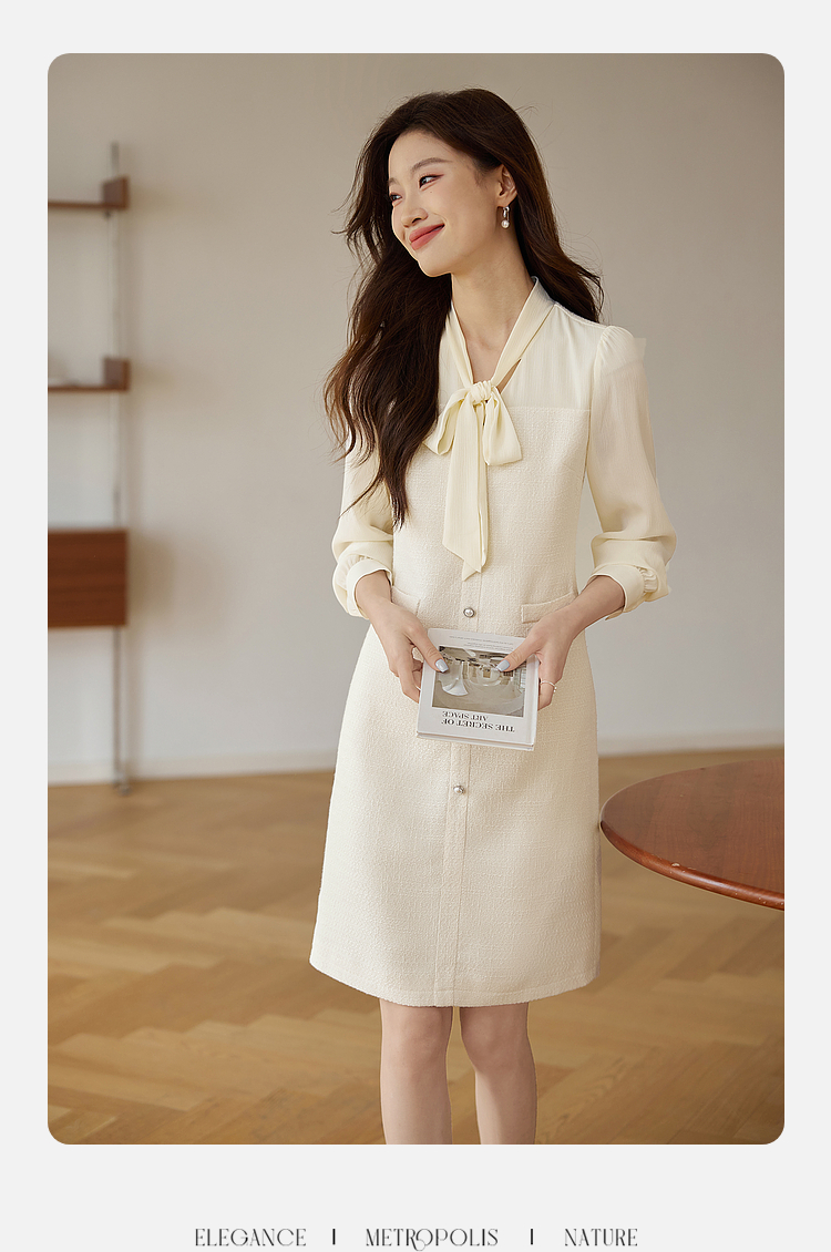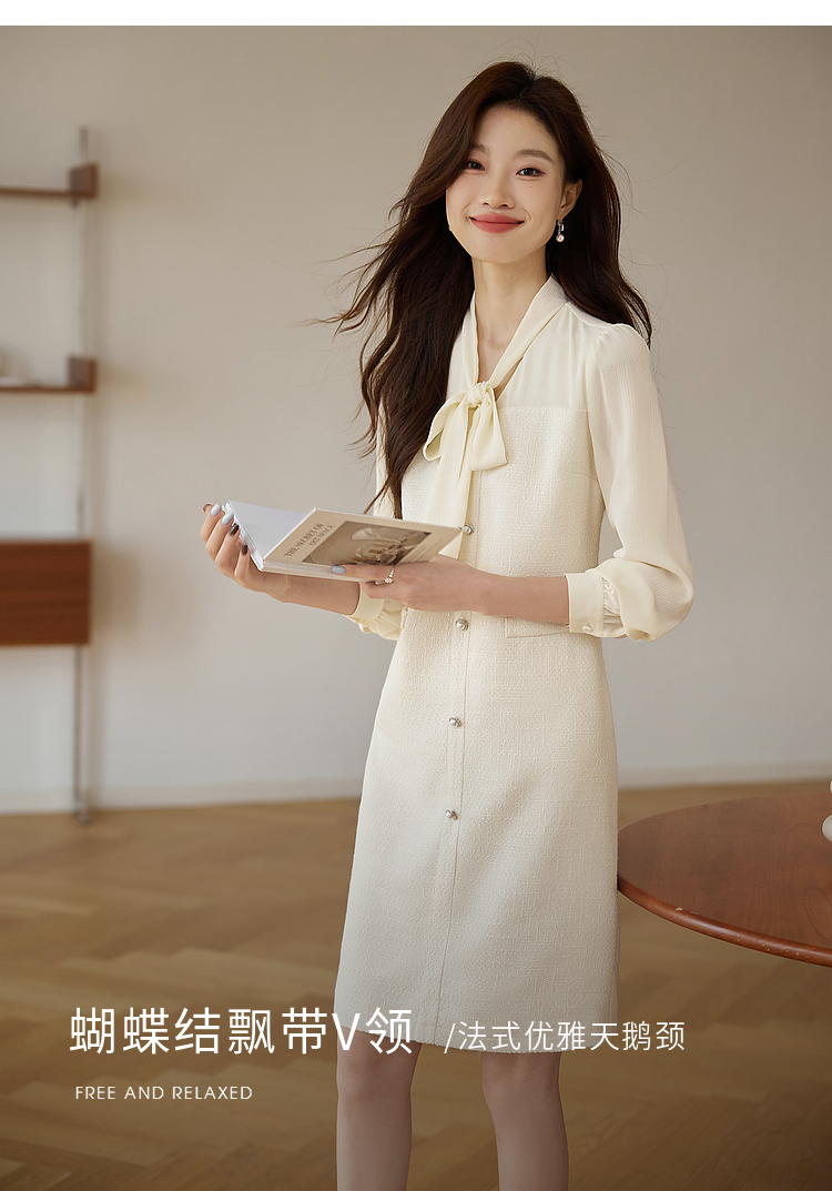 【专属特价】熙世界小香风蝴蝶结V领连衣裙秋装新款温柔法式气质长袖中长裙