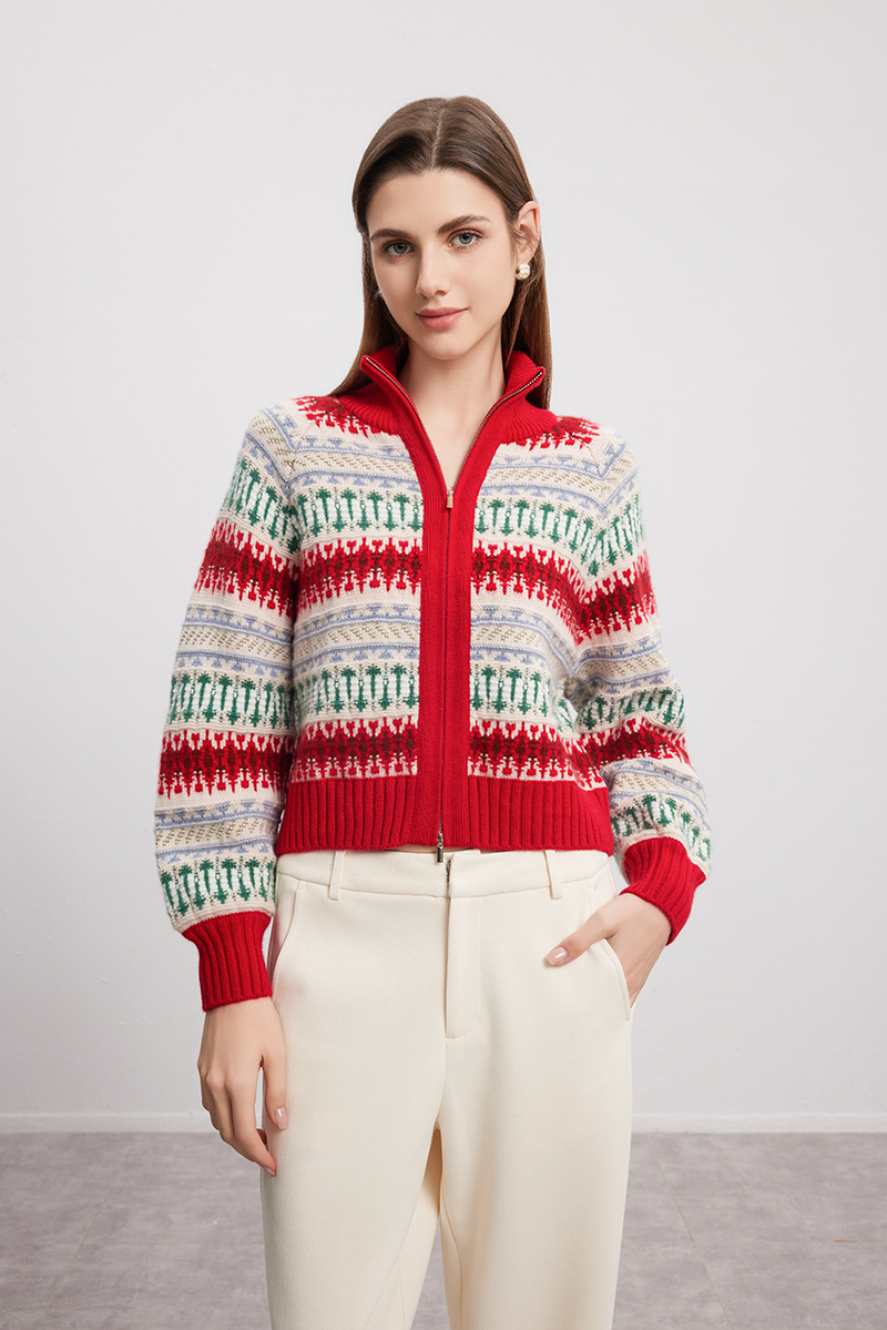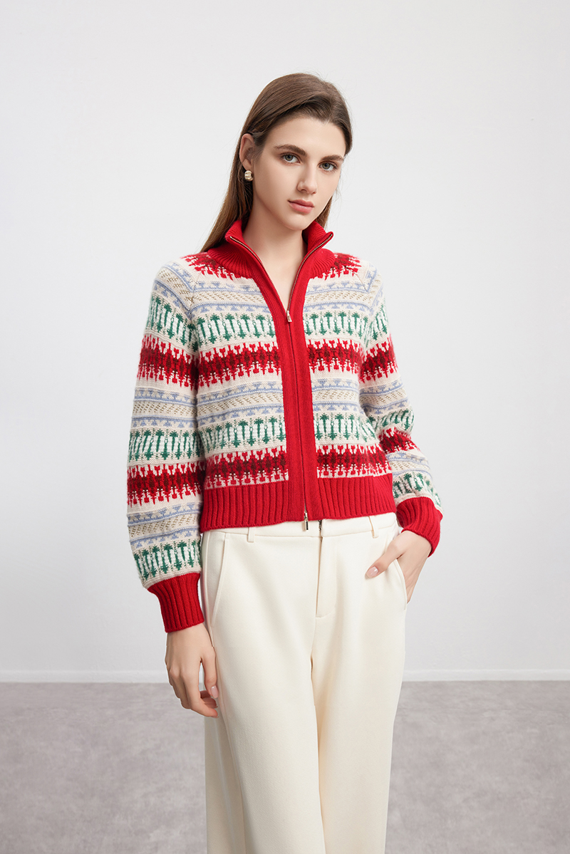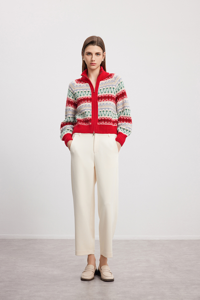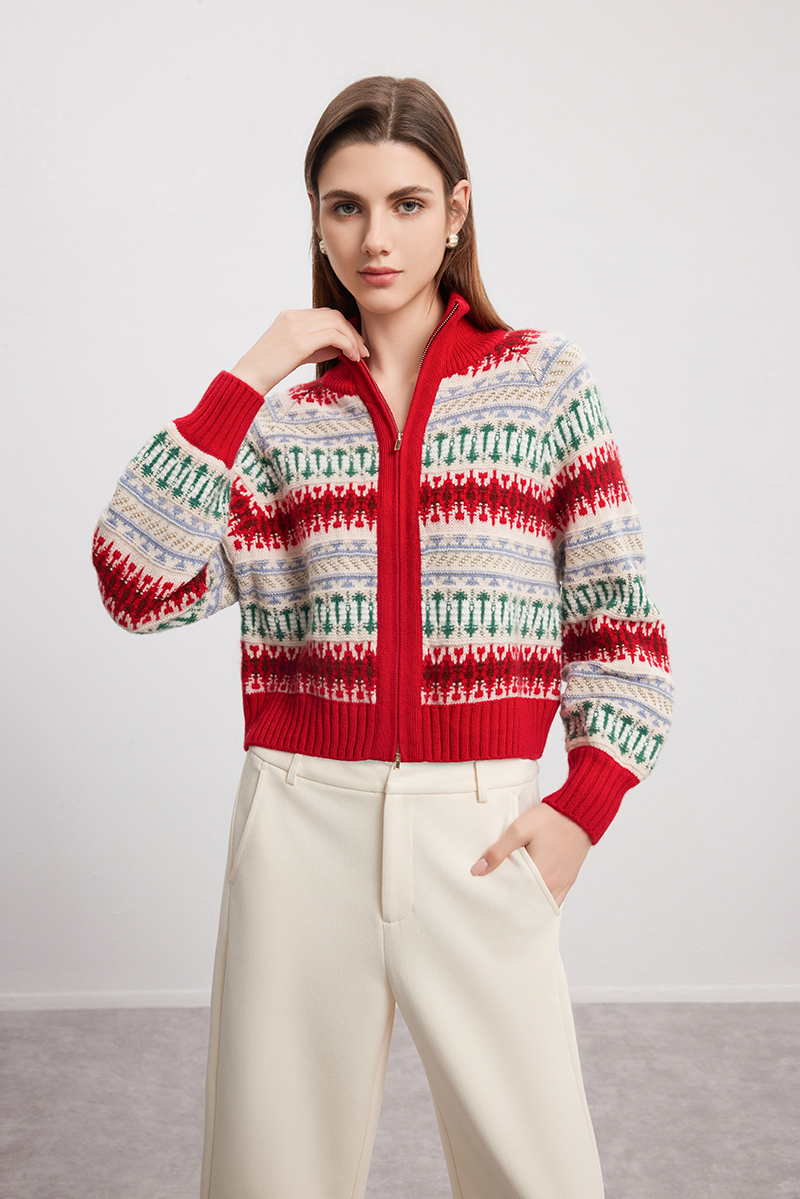 【圣诞系列羊绒开衫】羊绒世家秋冬新品女士100%山羊绒条纹撞色外套
