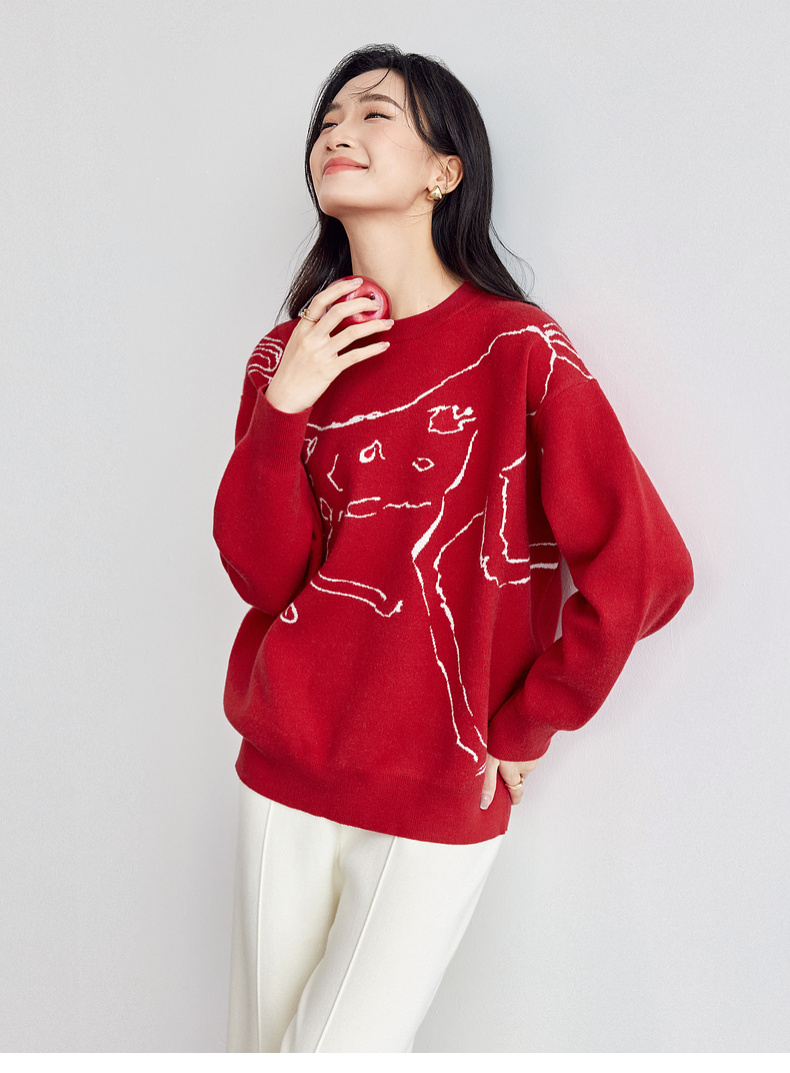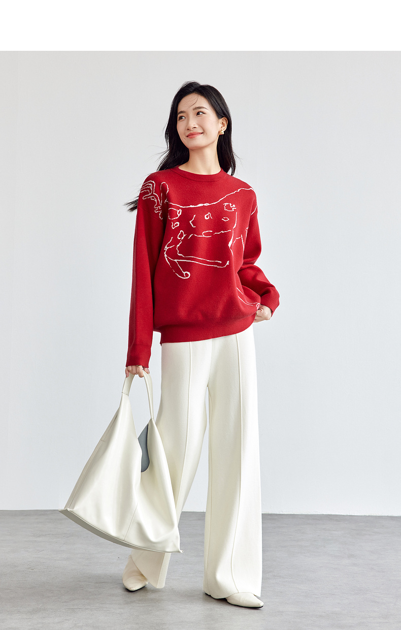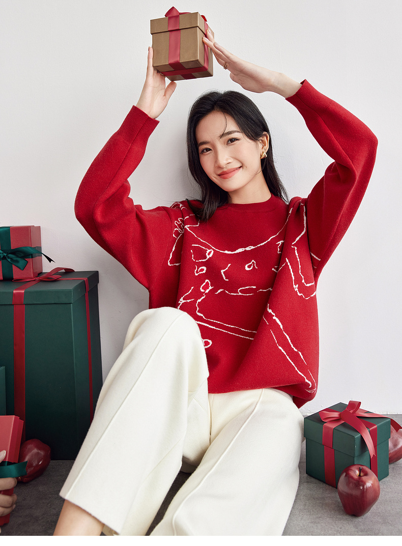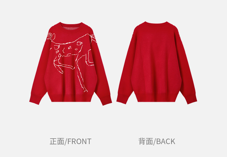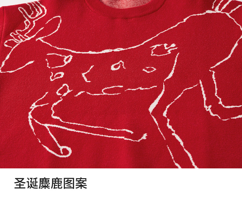 【内购】圣诞派对艺术手绘麋鹿圣诞新年氛围感慵懒宽松圆领套头毛衣-58099