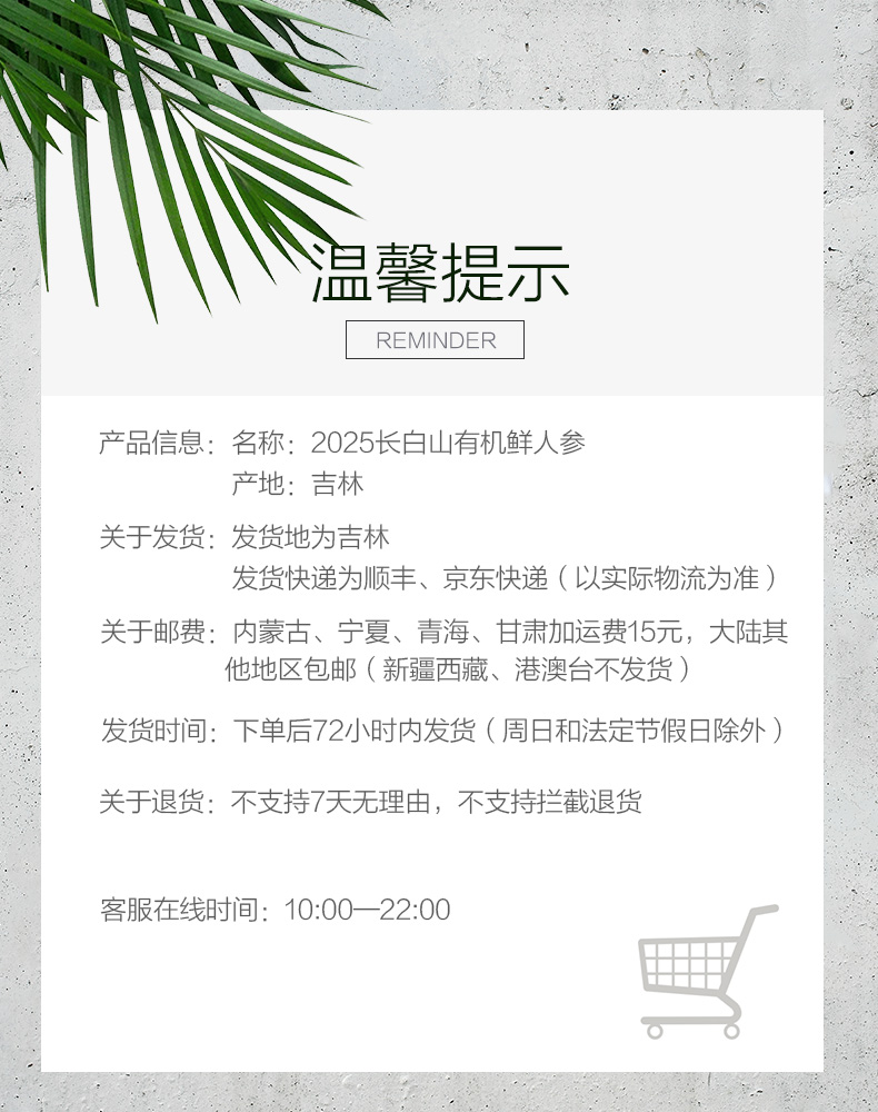 【售后标准】坏参包赔,签收24小时内凭坏参+面单照片按比例赔付,总价÷总个数×坏参个数